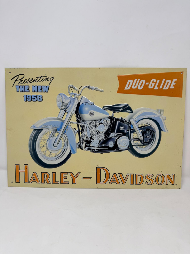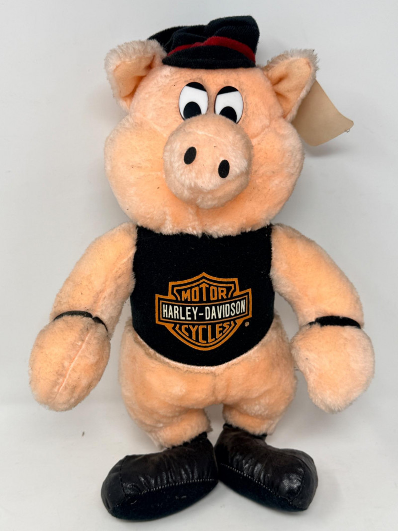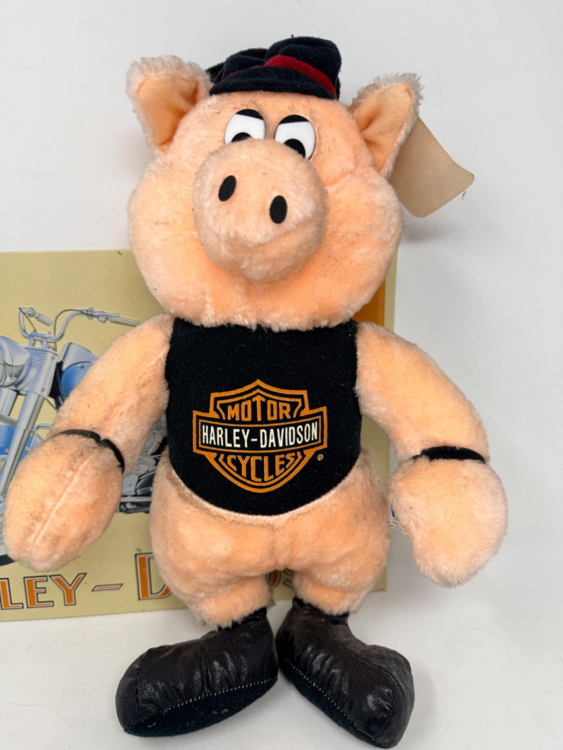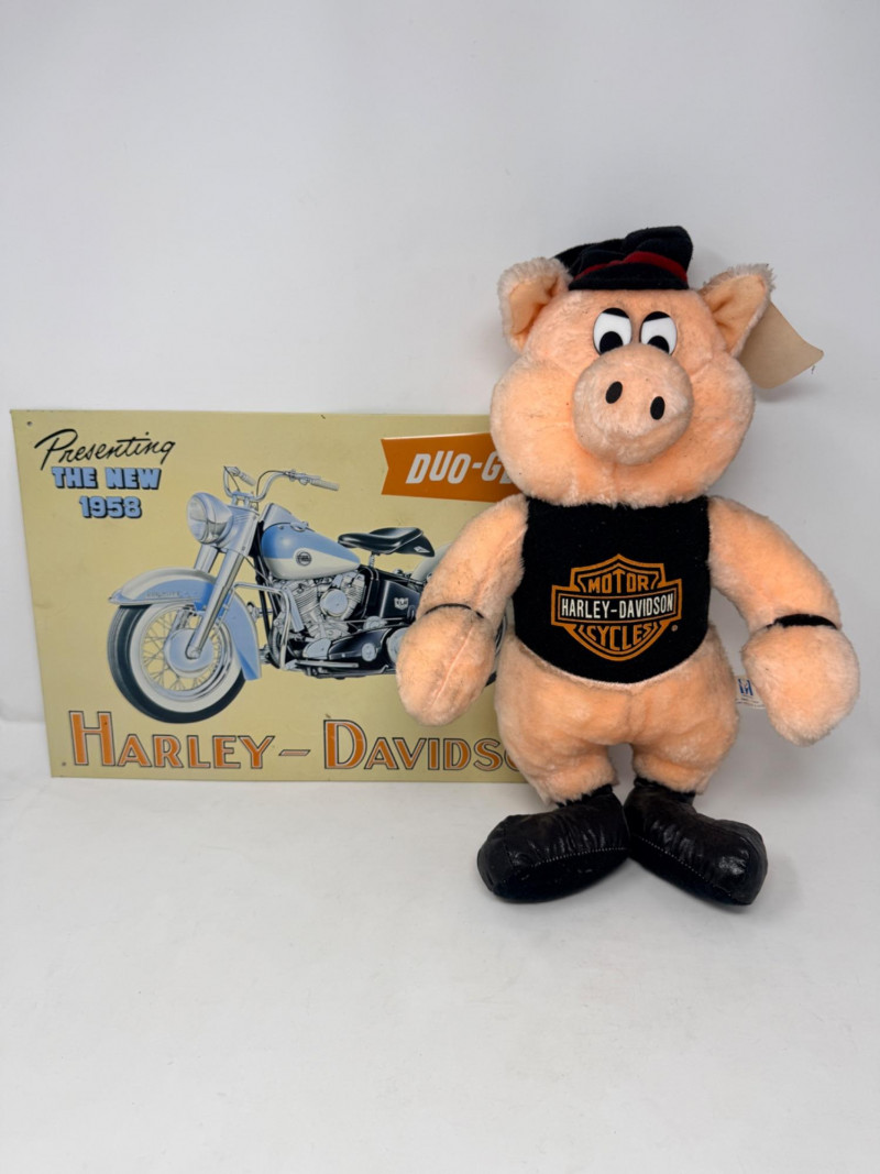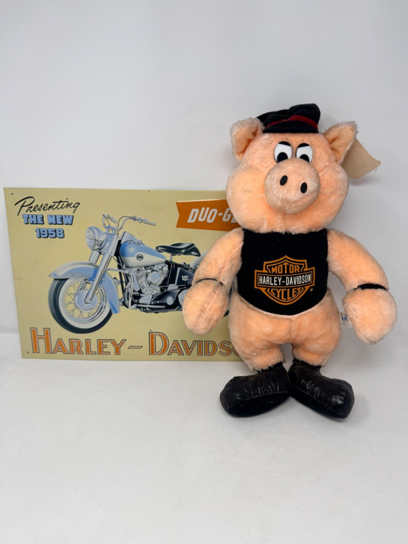 Harley-Davidson Duo-Glide Metal Sign & Stuffed Pig Embossed Metal Sign, Made in Great Britain is 11”x16” Pig measures 16” tall. It has been hanging in a garage and the fur is discolored from dust and age.