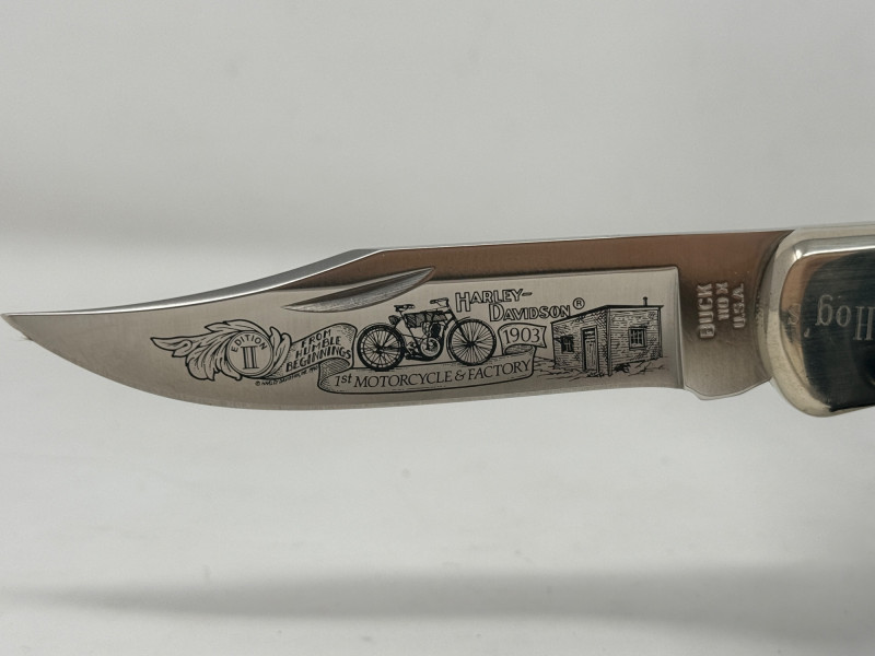 Harley-Davidson 110X Buck Knife - Limited Edition - Personalized Limited Edition #2562/3000 Measures 8.75” when opened. Harley-Davidson Edition II 1st Motorcycle Factory on the blade.