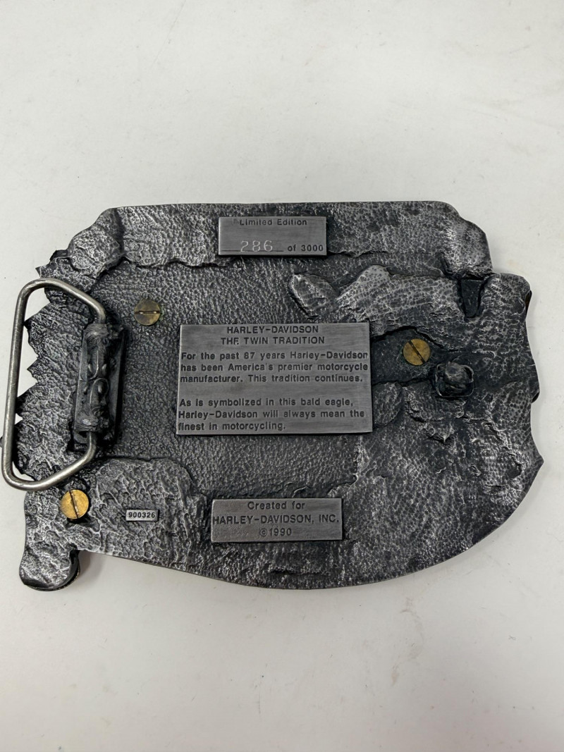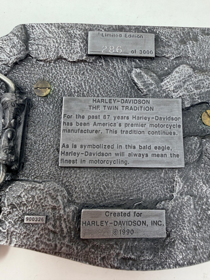 1990 Harley-Davidson “The Twin Tradition” Belt Buckle With Certificate of Authenticity. Limited Edition #286/3000 Measures 3.5”x5” in a silver velvet box