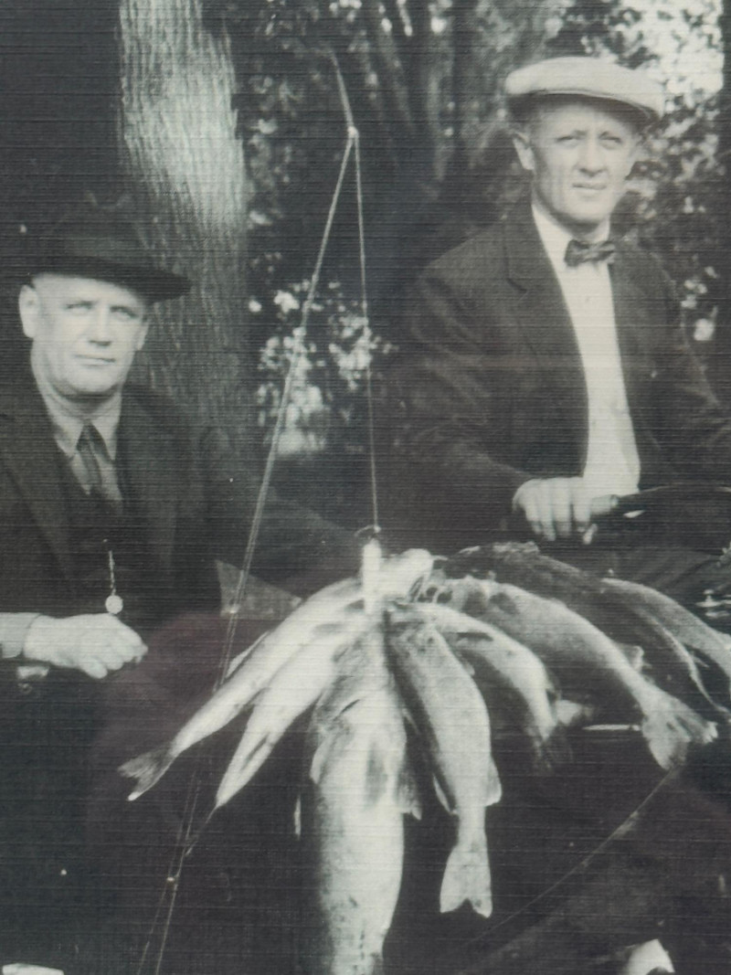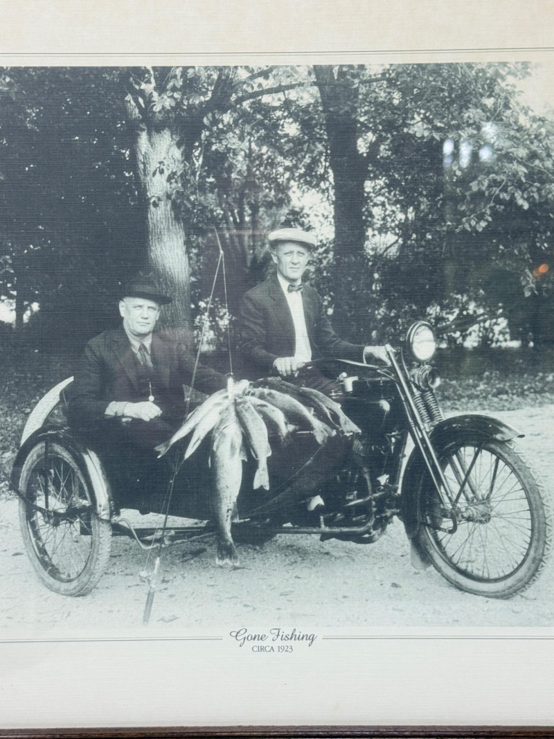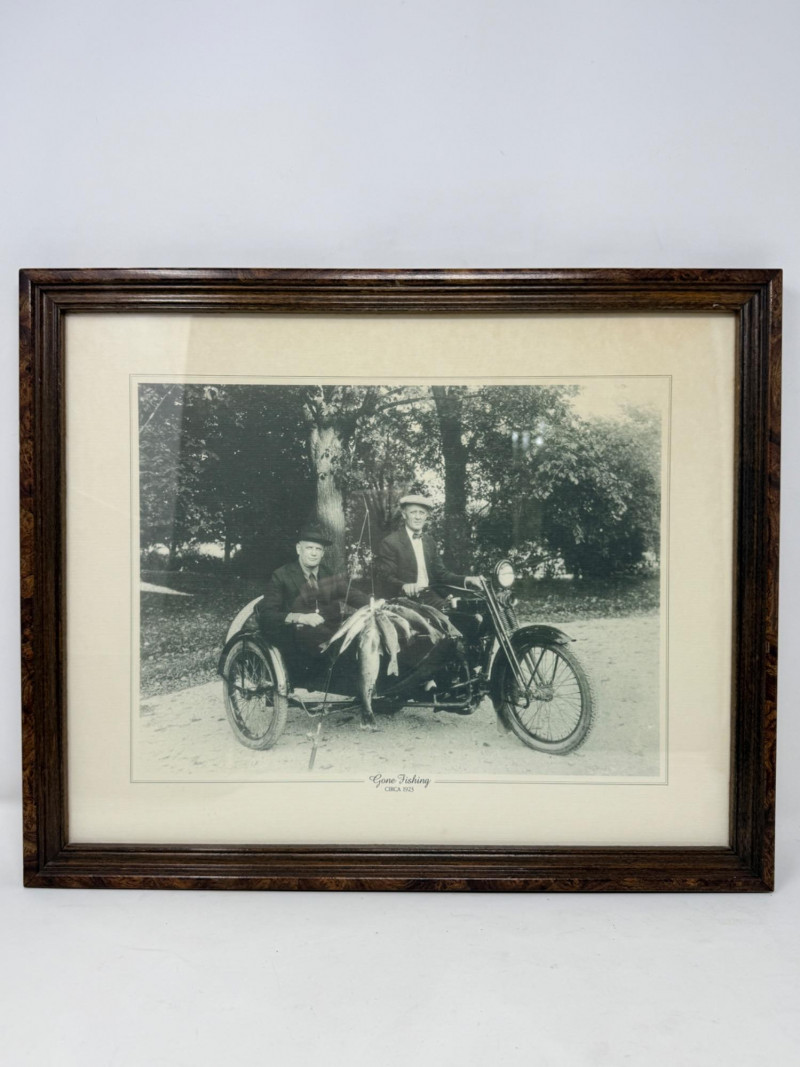 Gone Fishing Circa 1923, a high contrast, textured print, possibly on linen or heavy stock paper framed under glass. 17”x14”