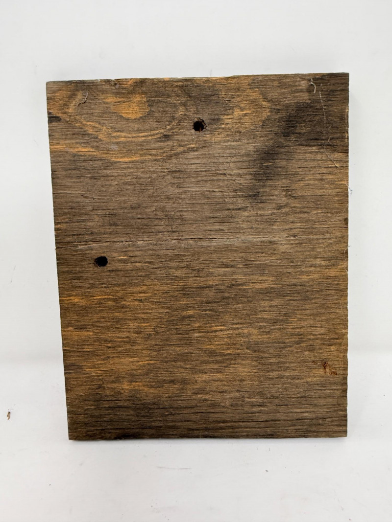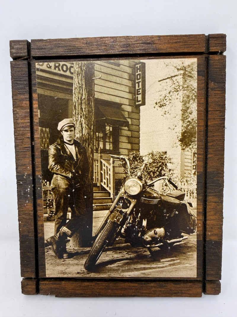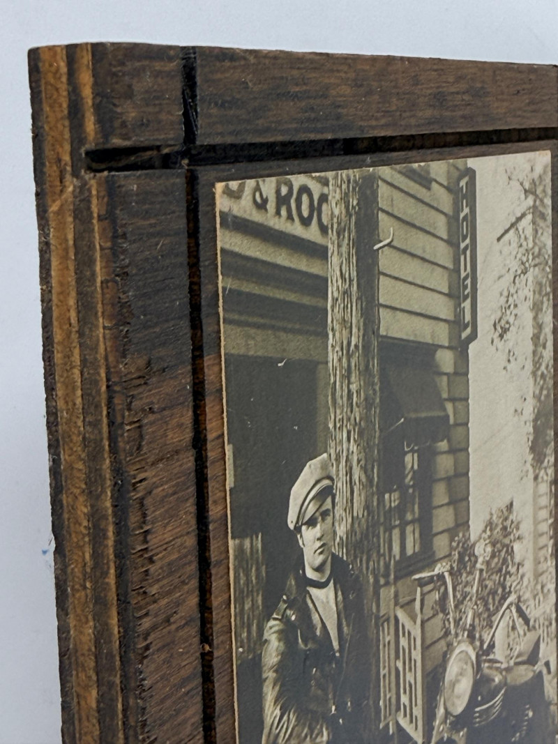 The photograph is set on a rustic, dark-toned wooden frame. The image became an iconic representation of 1950s rebel culture. 6”x7.5”