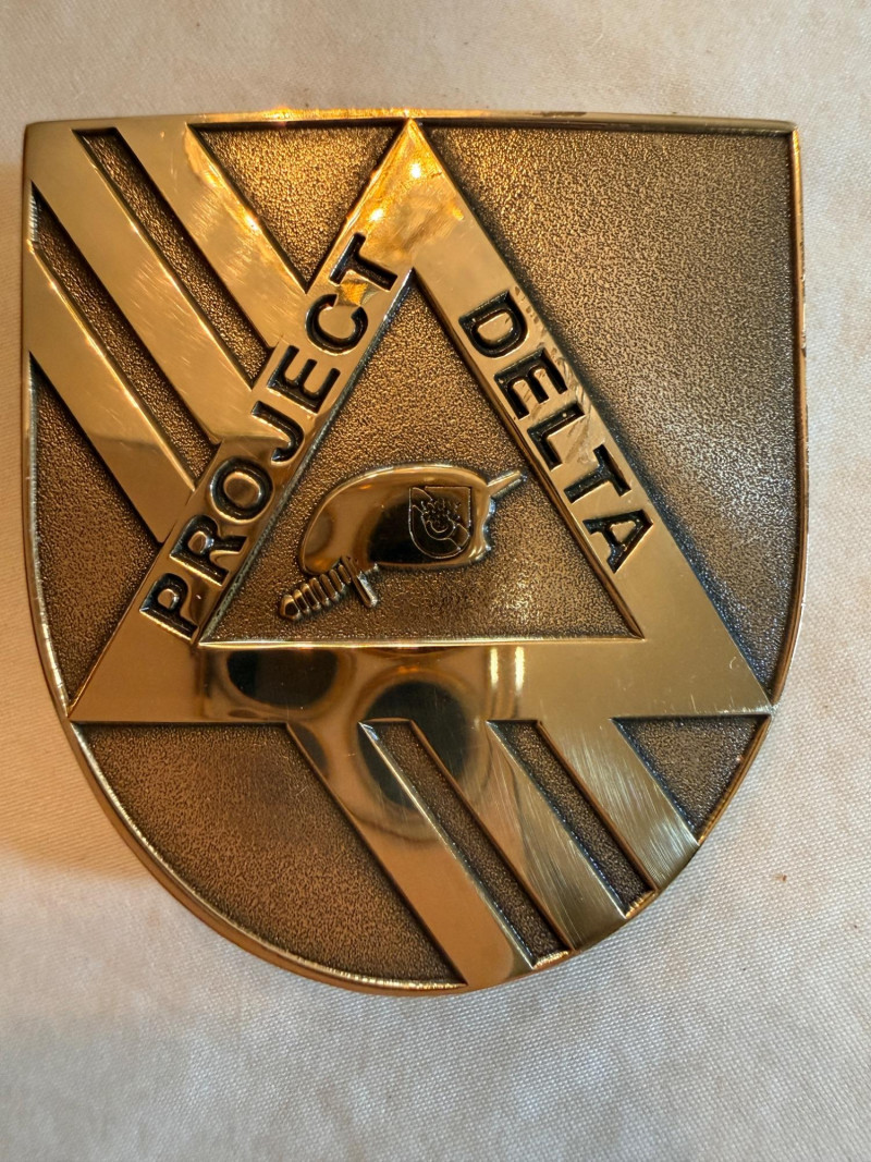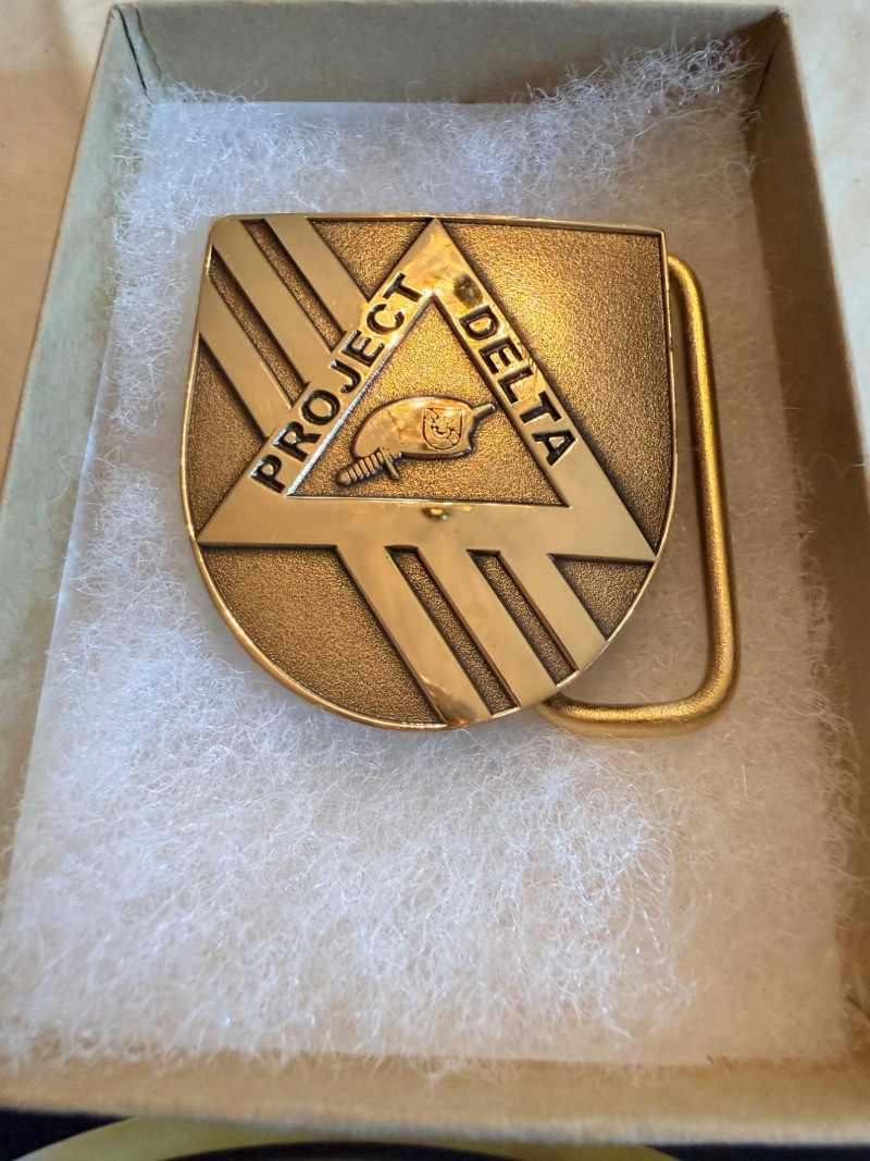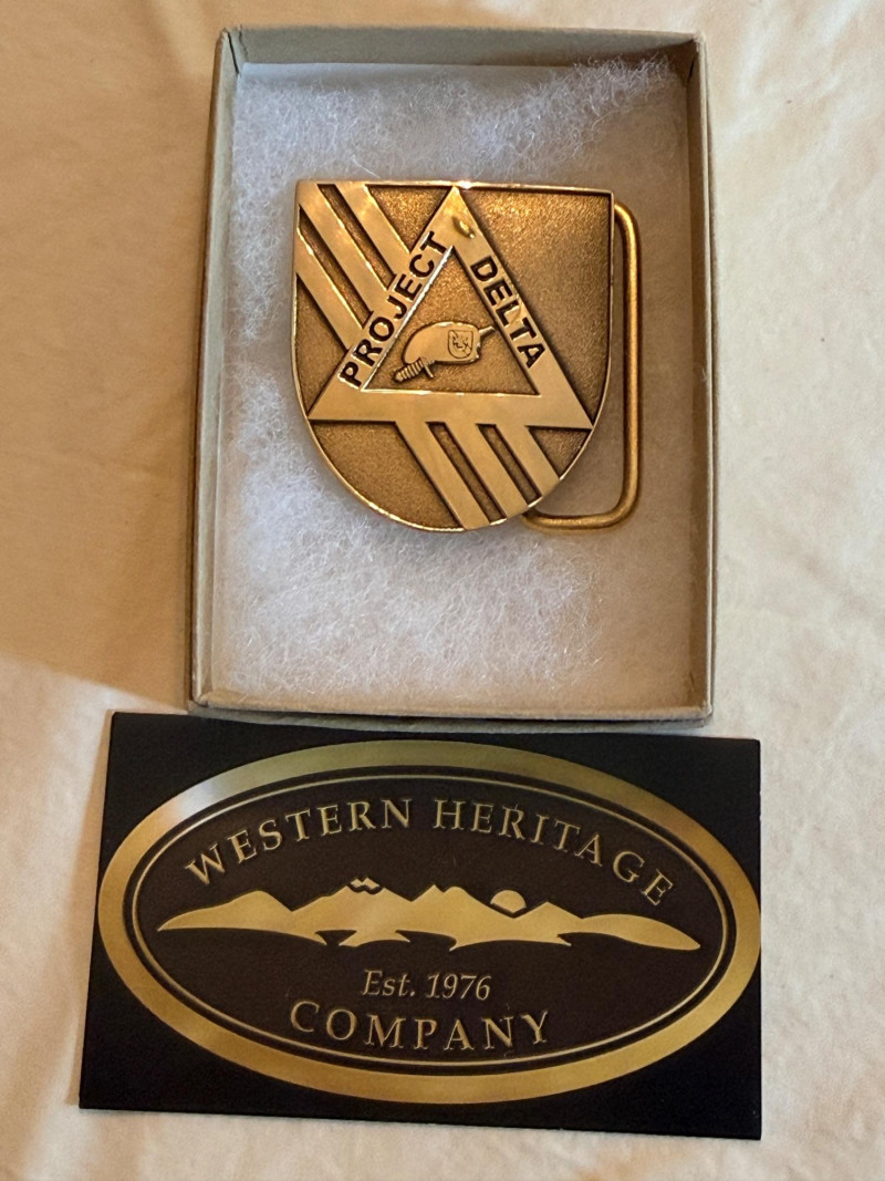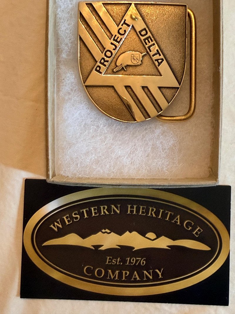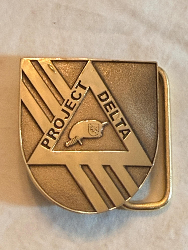 Project Delta Force Belt Buckle by Western Heritage The design features the name "Project Delta" and a central emblem that is a hallmark of the U.S. Army Delta Force(officially known as 1st Special Forces Operational Detachment-Delta or CAG). It includes a triangle (delta) containing a daggger/sword, which is consistent with historical Delta Force unit insignia. Project Delta was a specific special reconnaissance unit (B-52) during the Vietnam War, and modern items often pay tribute to this heritage. Approximately 1.75”x2”