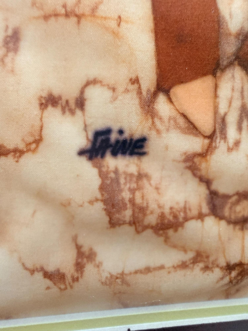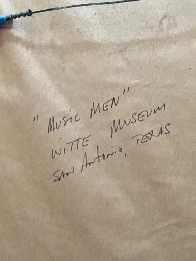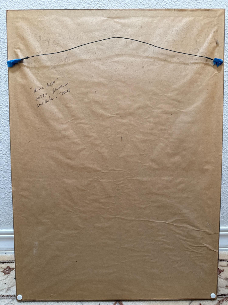 "Music Men” Ink on Batik Signed by Artist Faine. Inscription on back says “Music Men” Witte Museum, San Antonio, Texas Batik double matted with brown and yellow in a medium/dark wood frame under matte glass. Measures 16.75”x23.25”
