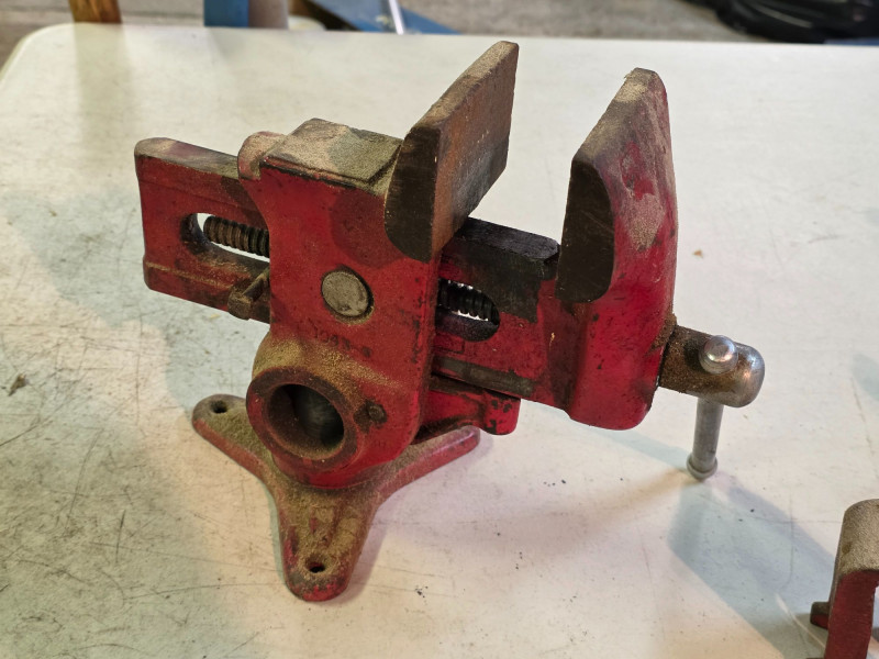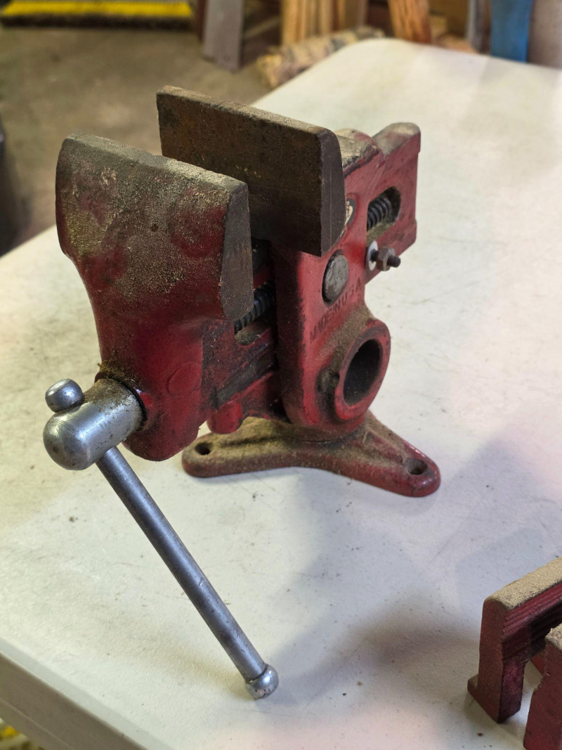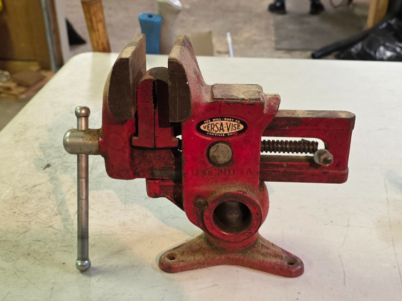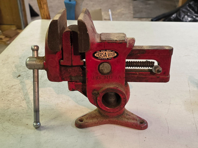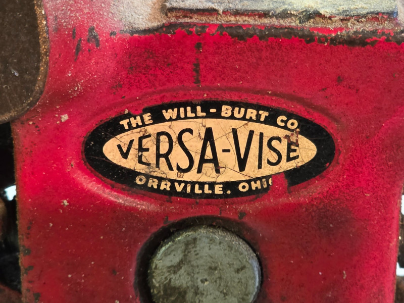 Vintage 3.5" Versa-Vise Manufactured By The Will-Burt Company In Orrville, Ohio It features a distinctive red finish and a versatile design that allows the vise to swivel 360 degrees or be lifted and positioned vertically or horizontally. Known for its versatility, it was marketed as a multipurpose workshop tool popular for woodworking and gunsmithing. These vises were produced starting in the 1950s and are considered desirable collectible tools today Includes pair of 1.75" jaw inserts Tested - Works! 8.5"T x 5.75"W x 11"L Made In The U.S.A.!