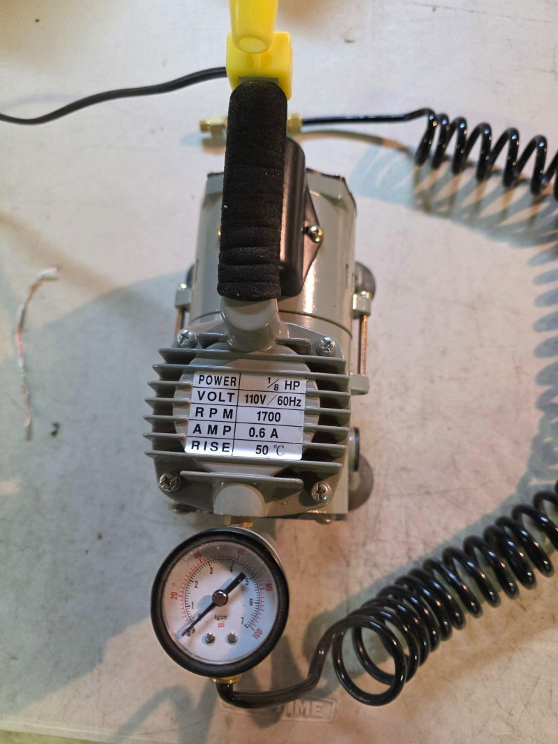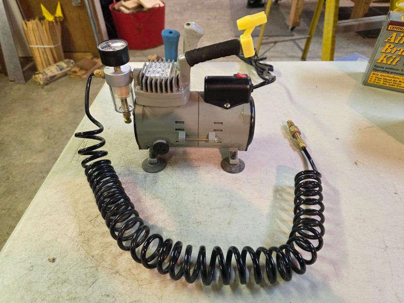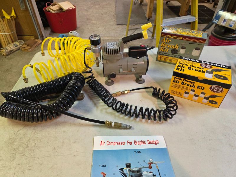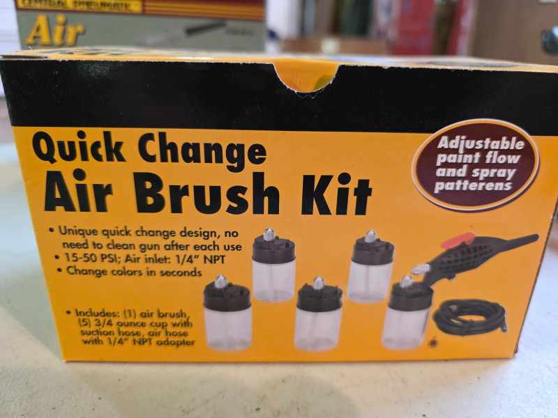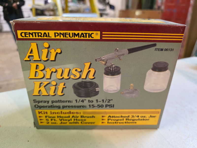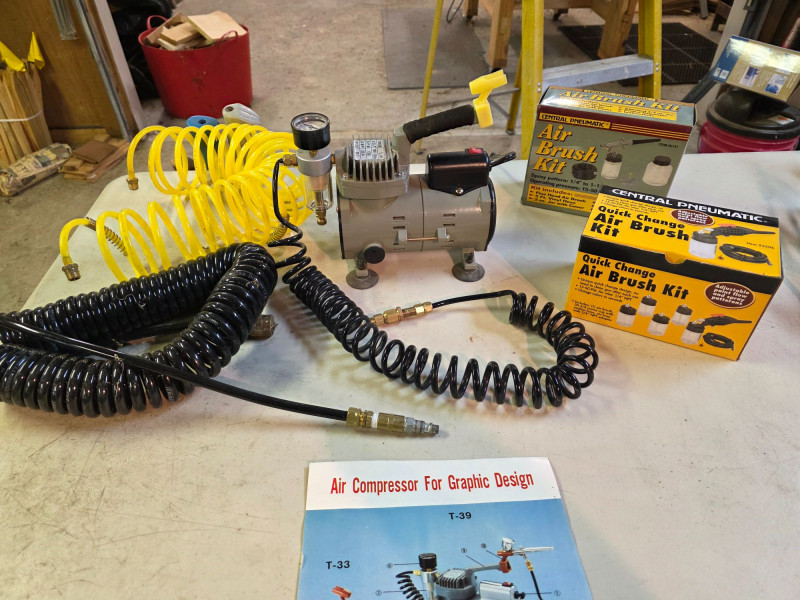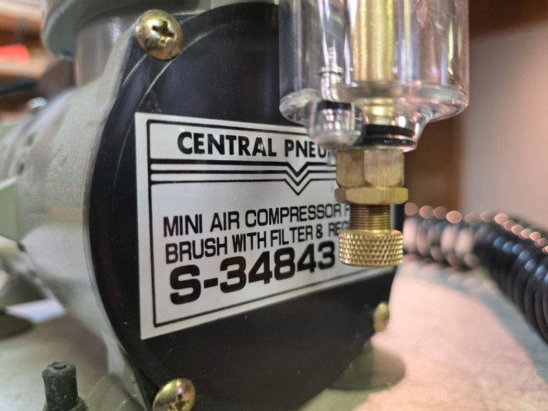 Central Pneumatic 1/8 HP Oil-Less Airbrush Compressor, 2 Air Brush Kits & Coil Hoses Central Pneumatic Model #S-34843 Utilized for modeling or small-scale painting projects Power: 1/8 Horsepower. Voltage: 110V/60Hz. Maximum Pressure: Approximately 60 PSI. Features: Includes a pressure gauge, regulator, and moisture trap Includes 2 Central Pneumatic Air Brush Kits (New In Box!), 2 coiled hoses & manual Tested - Works!