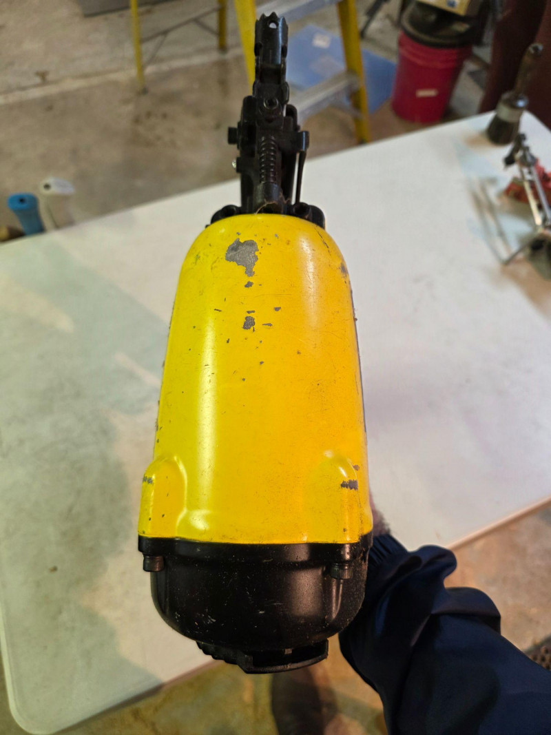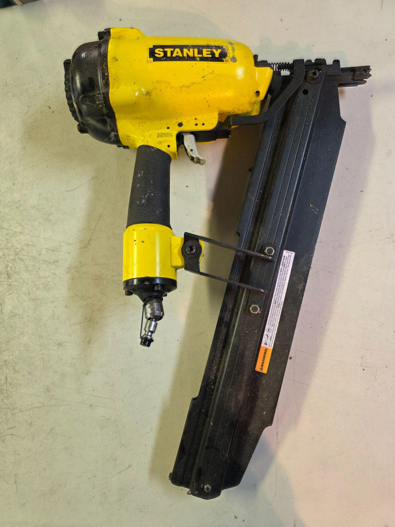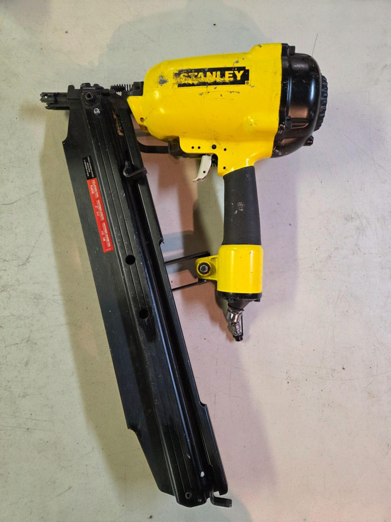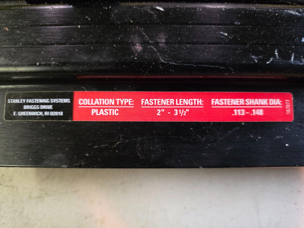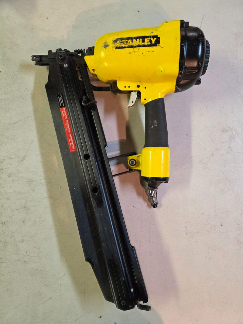 Stanley Bostitch SFRN350 Pneumatic Framing Nailer Power Source: Pneumatic (air-powered), requiring an operating pressure of 70 to 120 PSI. Fastener Range: Drives round-head nails from 2 inches to 3-1/2 inches in length. Magazine: Features an angled magazine that holds approximately 64 plastic collated nails, allowing for better maneuverability in tight spaces like 16-inch joist bays. Design: Built with a lightweight magnesium housing (approximately 7 to 7.4 lbs) to reduce user fatigue during overhead or extended use. Adjustments: Includes a tool-free depth-of-drive adjustment on the nose and a 360-degree adjustable exhaust deflector Tool designed for heavy-duty construction tasks such as framing, sheathing, and building decks Untested! 20.5"T x 14"W x 5"D