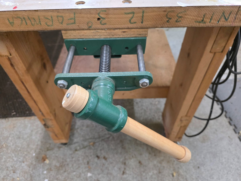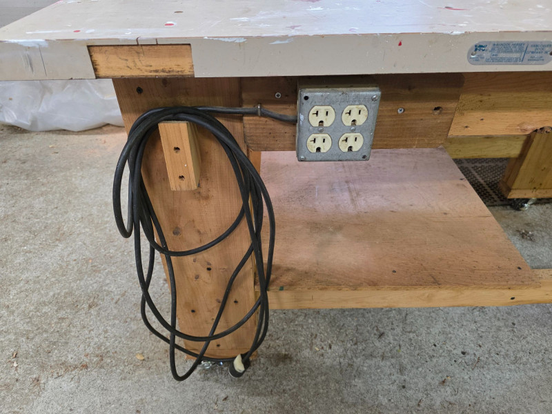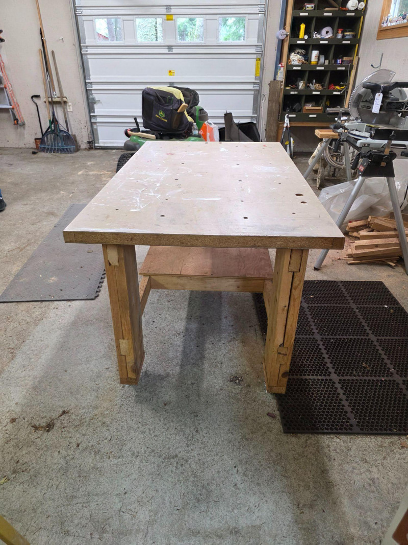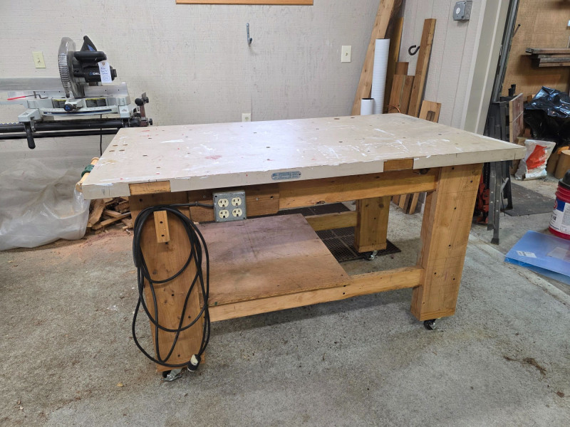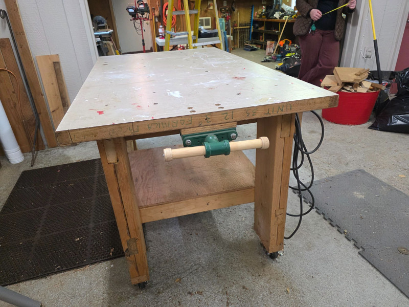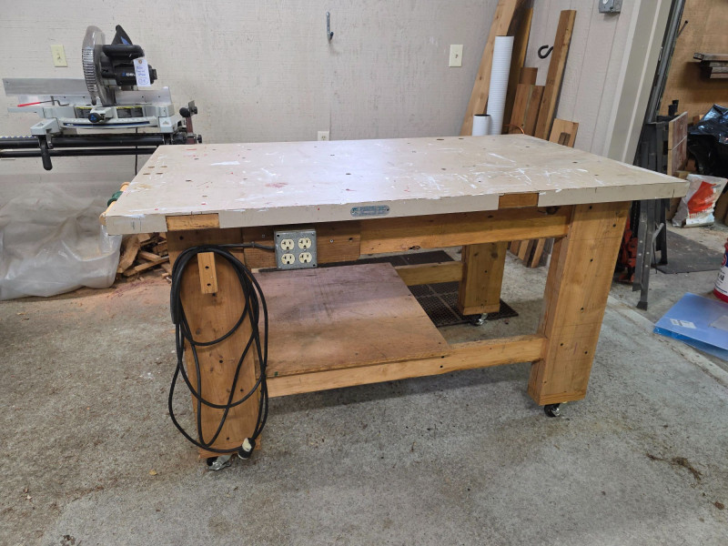 Homemade 60" x 36" Workbench On Casters With Wood Vise & Power Heavy-duty workbench has a large benchtop made from a solid core door Has a 1/2 shelf underneath Wood vise and 4-outlet power wired to an electric cord Easily movable with locking casters on the legs 34.5"T x 60"L x 36"W