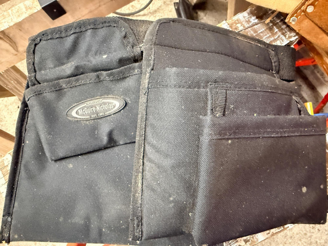 2) Leather & Canvas Carpenter Belts McGuire-Nichols Workwear black canvas tool belt. Leather belt with leather and suede attachments.