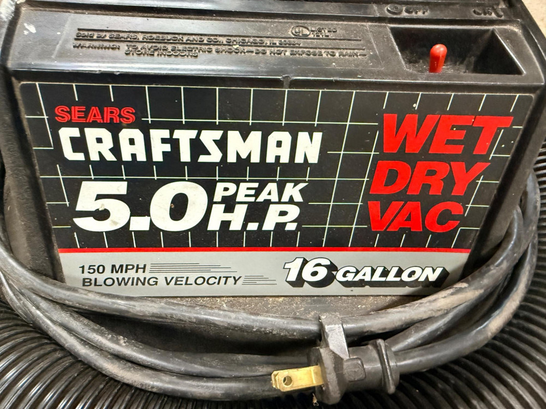 Craftsman 5 HP 16gal Wet Dry Vac & Accessories Complete set of on board accessories, and extra hose and other accessories. Tested, sucks and blows.