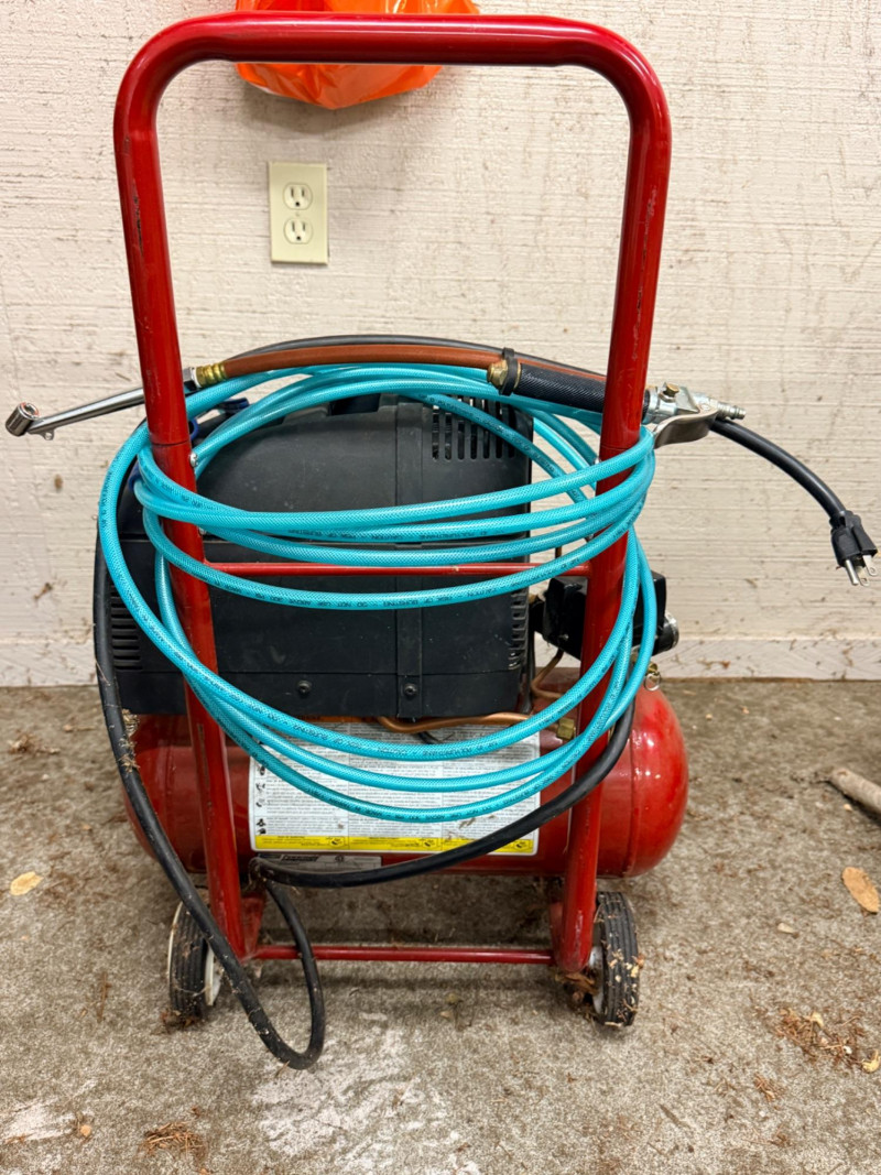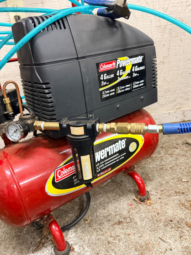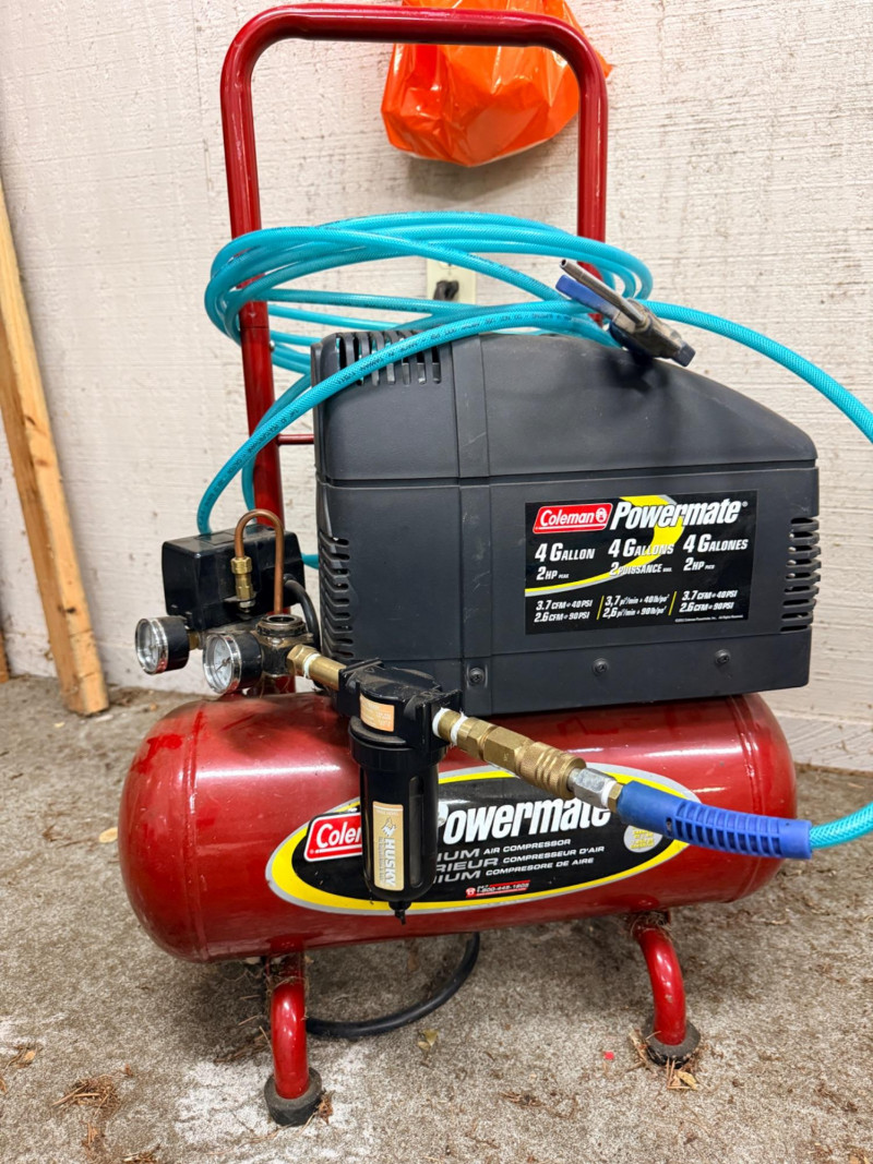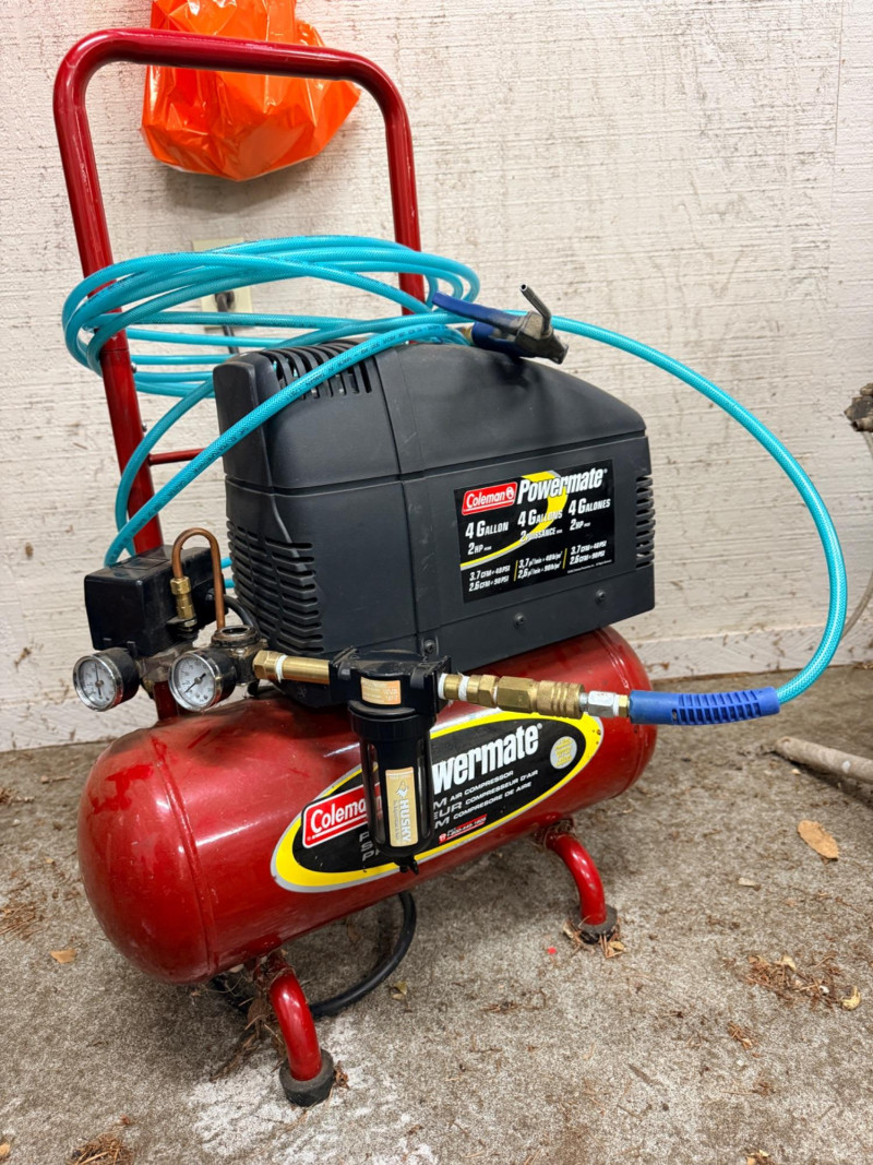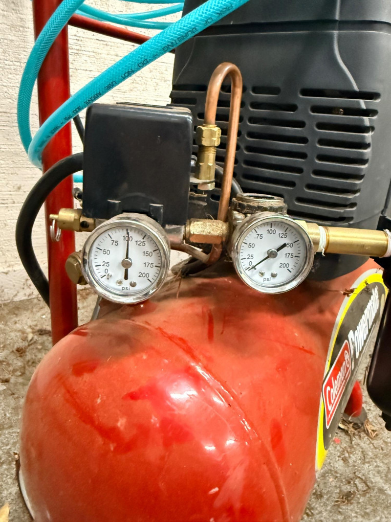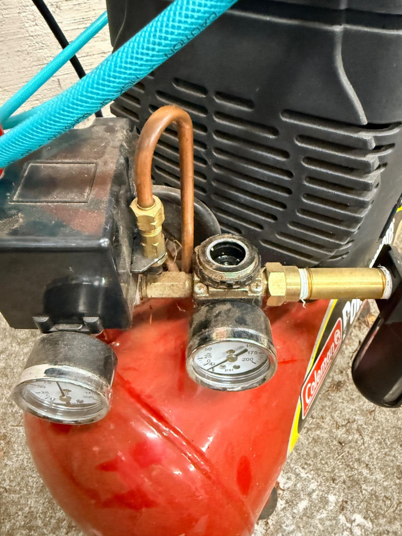 Coleman Powermate 4 gal 2hp Air Compressor. Tank holds air but the air doesn’t come through the hose. It appears a regulator cap behind the second gauge is missing. See pics for details.