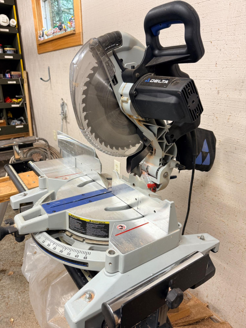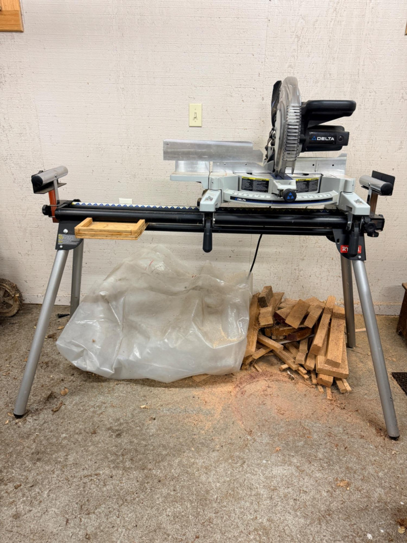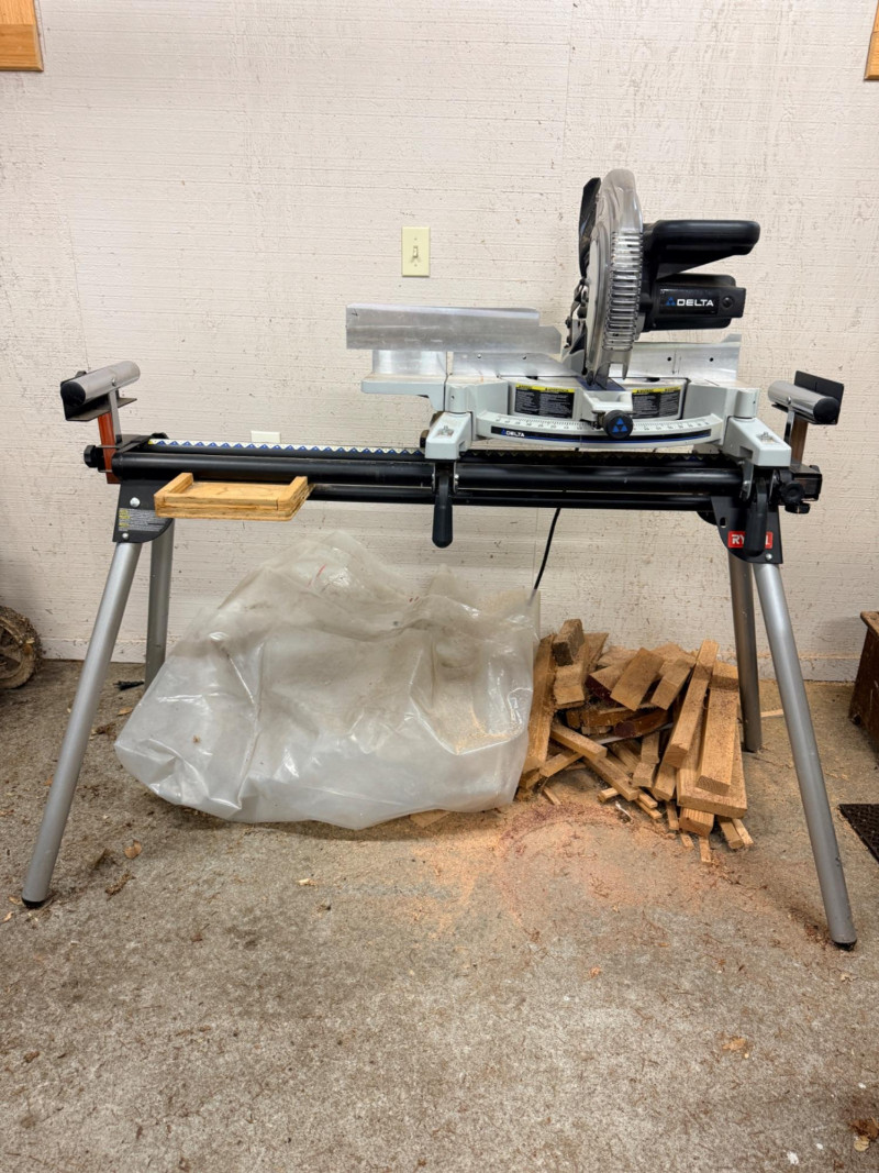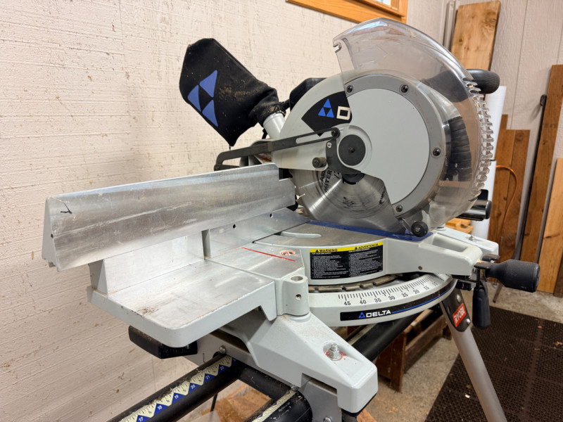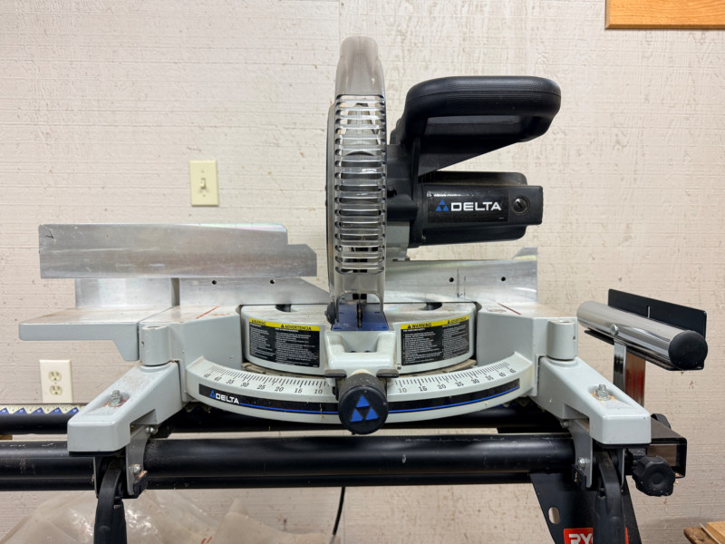 Delta 12” Compound Laser Miter Saw Model 36-255L Sits on a Ryobi Stand 5’x28” Ryobi stand