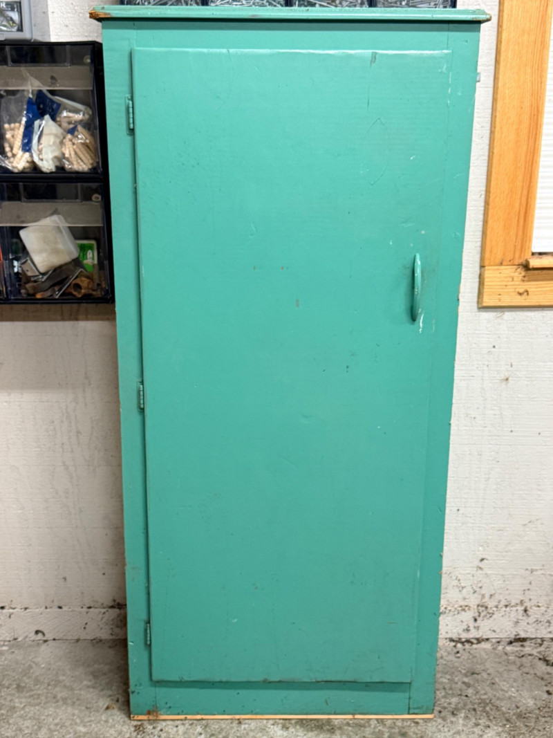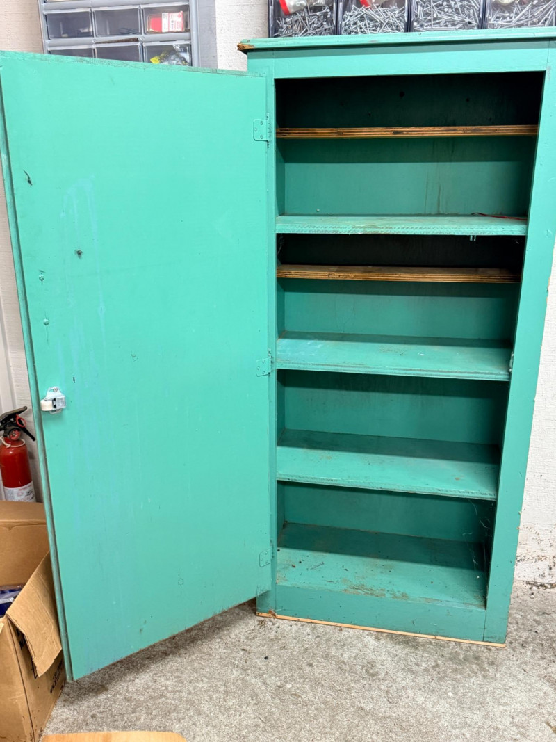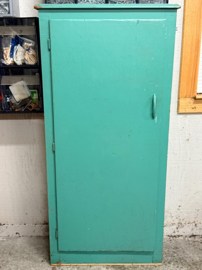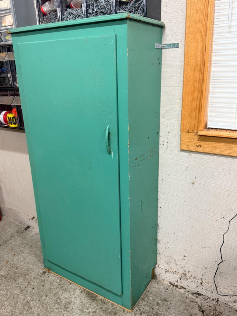 Green Single Door Storage Cabinet With Shelves Measures 25.5”x12.5”x53” Used in the garage. A great storage cabinet with wall anchors included.