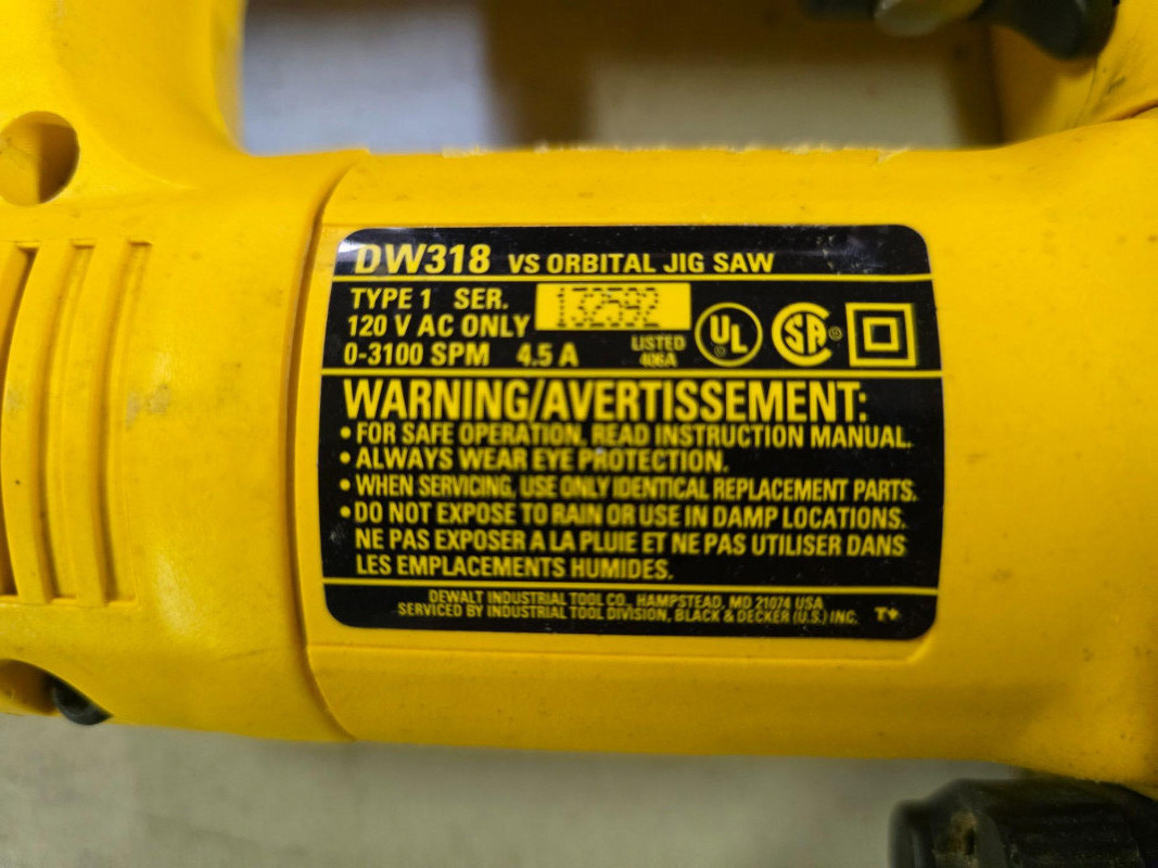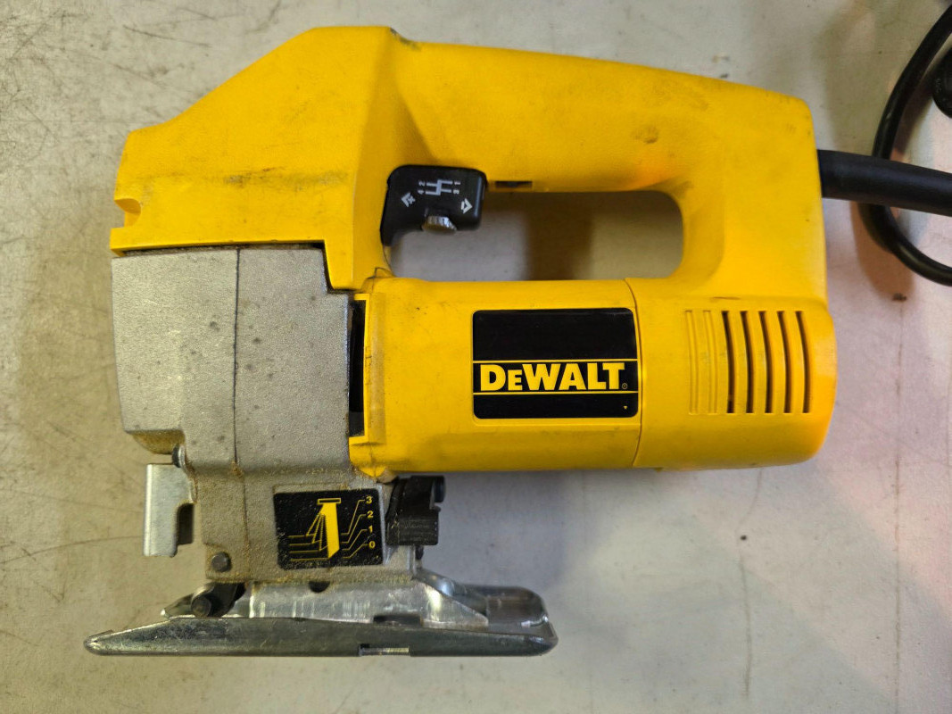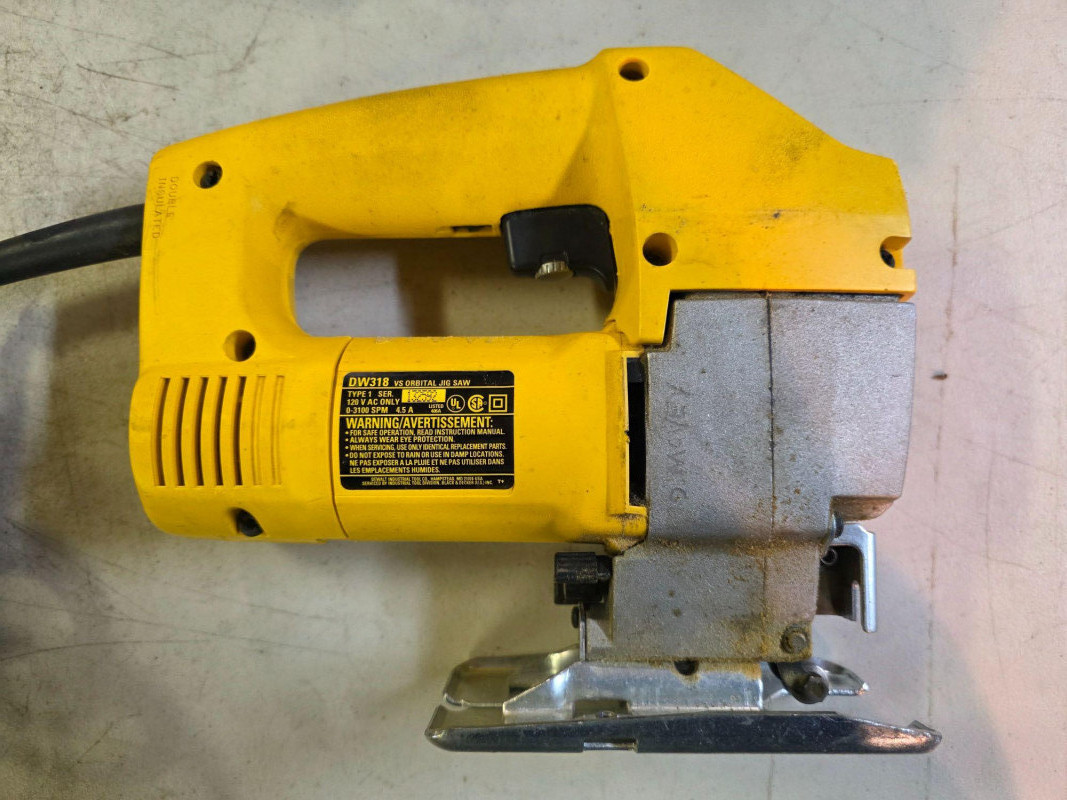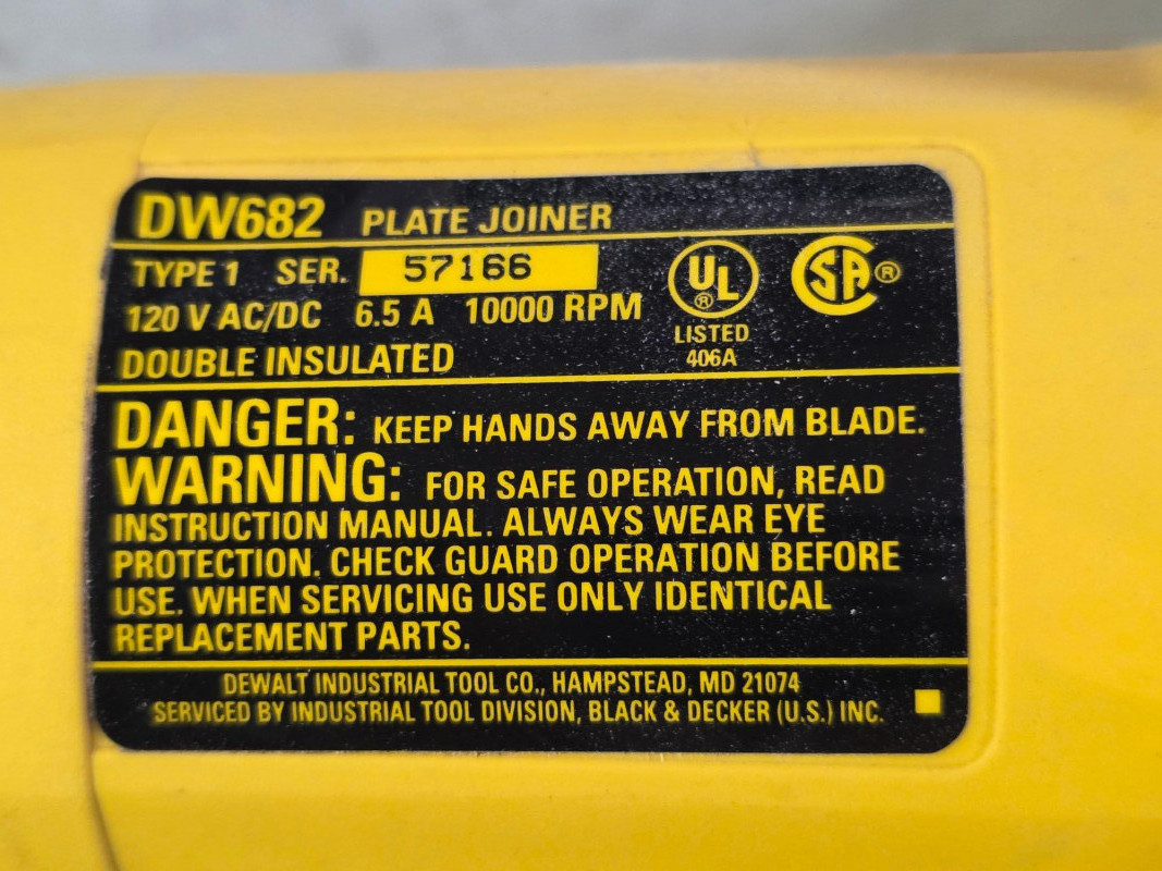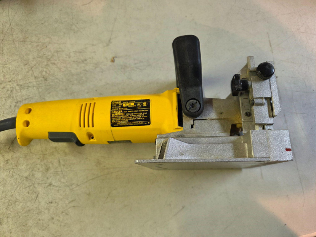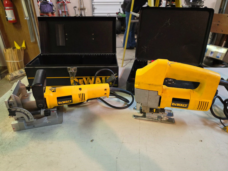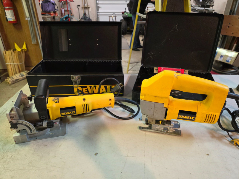 DeWalt Corded Plate Joiner & Corded Jigsaw (1) DeWalt Corded Plate Joiner DeWalt Model #DW682 Corded 6.5-amp heavy-duty plate joiner (biscuit joiner) designed for precise woodworking, featuring a 10,000 RPM motor Key features include a rack and pinion fence system for consistent alignment, adjustable fence (0-90°), and pre-set depths for #0, #10, and #20 biscuits (1) DeWalt Corded Jigsaw DeWalt Model #DW318 DeWalt DW318 is a 4.5 Amp, 120V corded variable speed orbital jig saw designed for precision cutting in wood, plastic, and metal This USA-made tool typically features a 45-degree bevel capacity Both include metal cases, joiner dust collection bag, extra jigsaw blades Both Tested - Both Work!