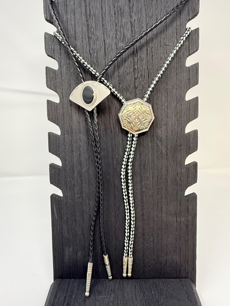 (2) Leather Bolo Ties This vintage-style bolo tie features a black onyx stone set in an arrowhead-shaped silver slide. 38” Southwest-style bolo tie featuring a silver-plated he’s hexagonal concho with floral engraving on a black and white braided leather cord. 32”