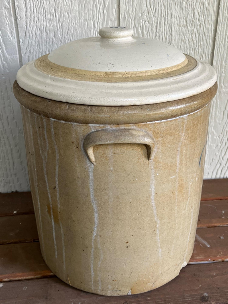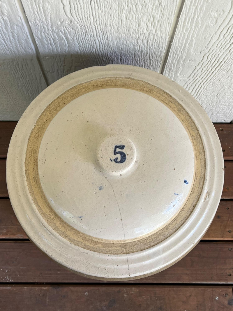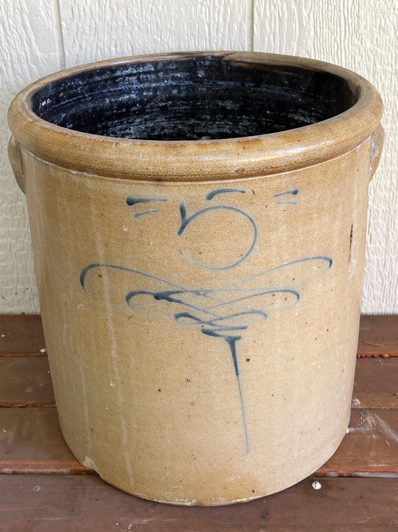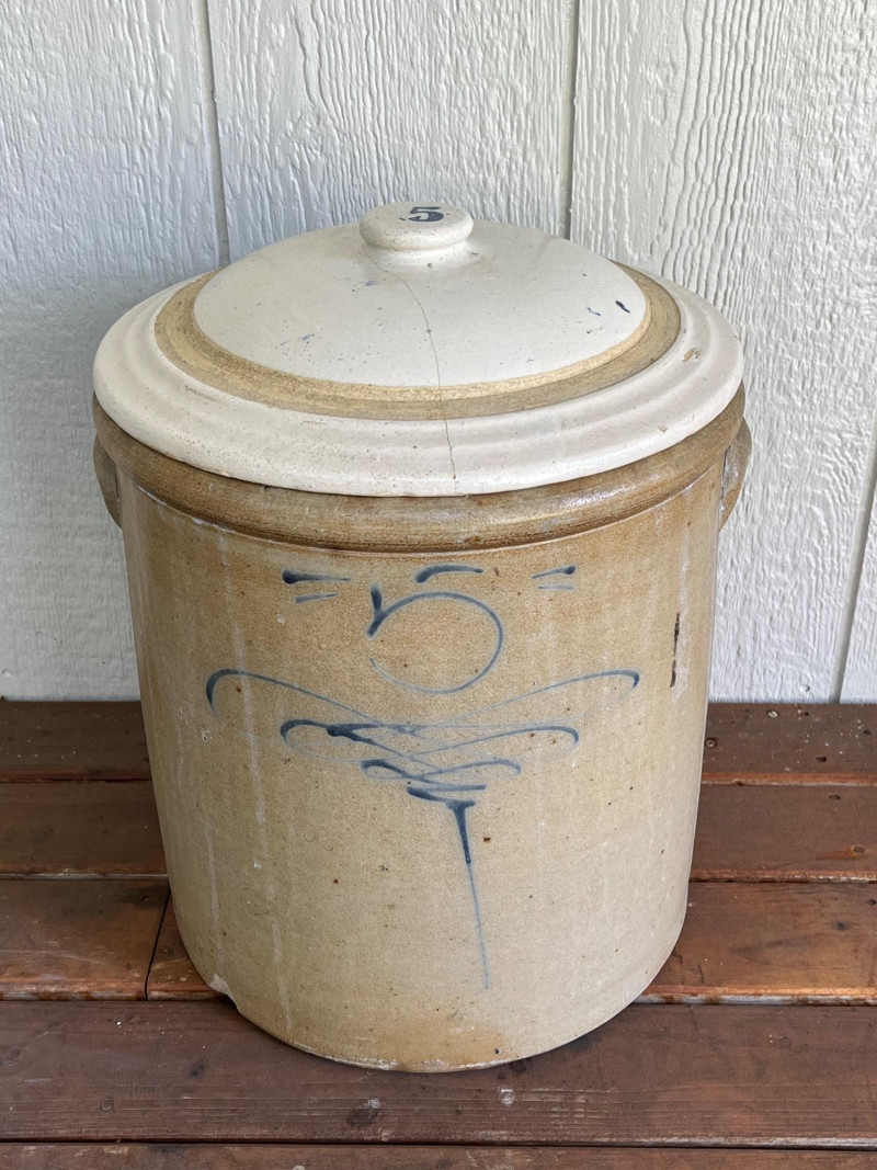 5-Gallon Salt-Glazed Stoneware Crock The cobalt blue "5" on the lid and the hand-drawn "5" design on the body indicate a 5-gallon capacity. The characteristic cobalt blue swirl on the front is a popular collector's motif known as a "bee sting" or "lazy eight" design. Tan salt-glaze exterior. The crock has molded "elephant ear" handles. Some cracks and chips. See pictures for details. 13”Tx12.5”W