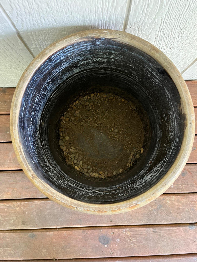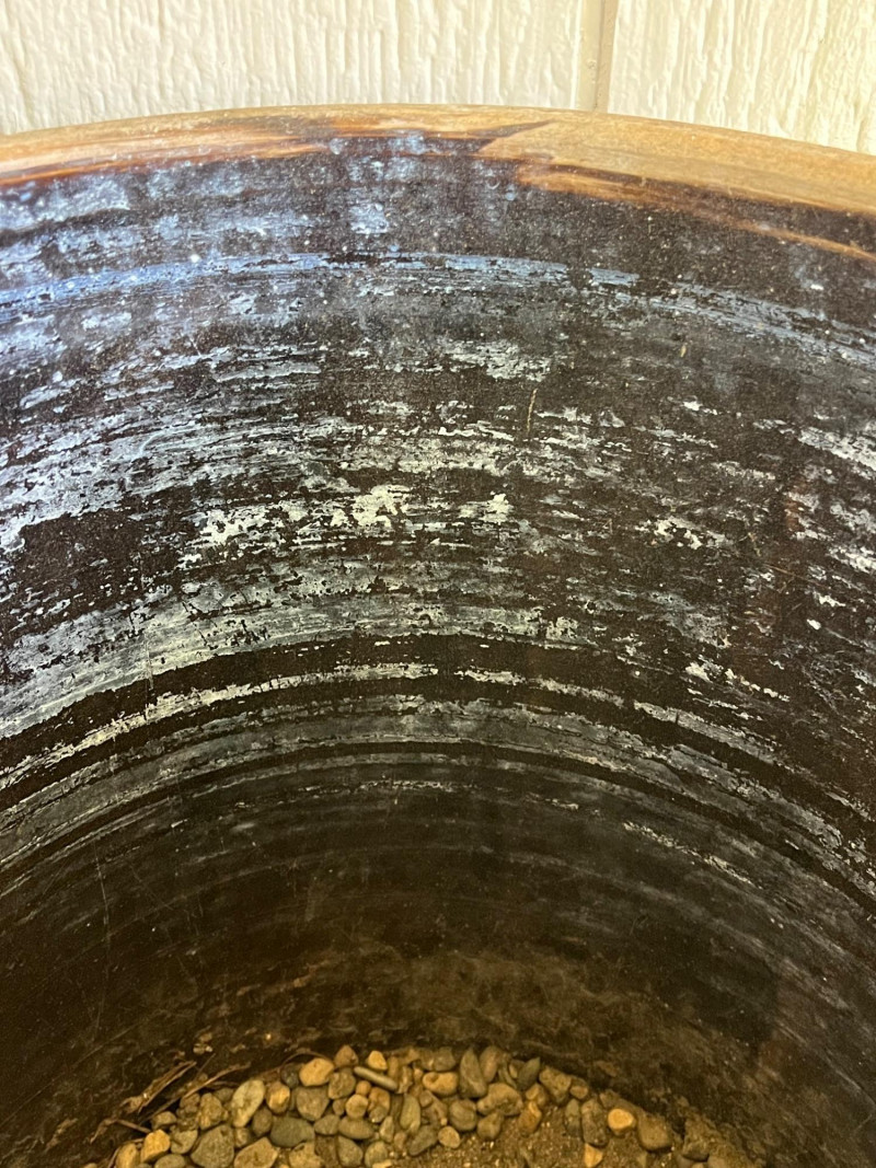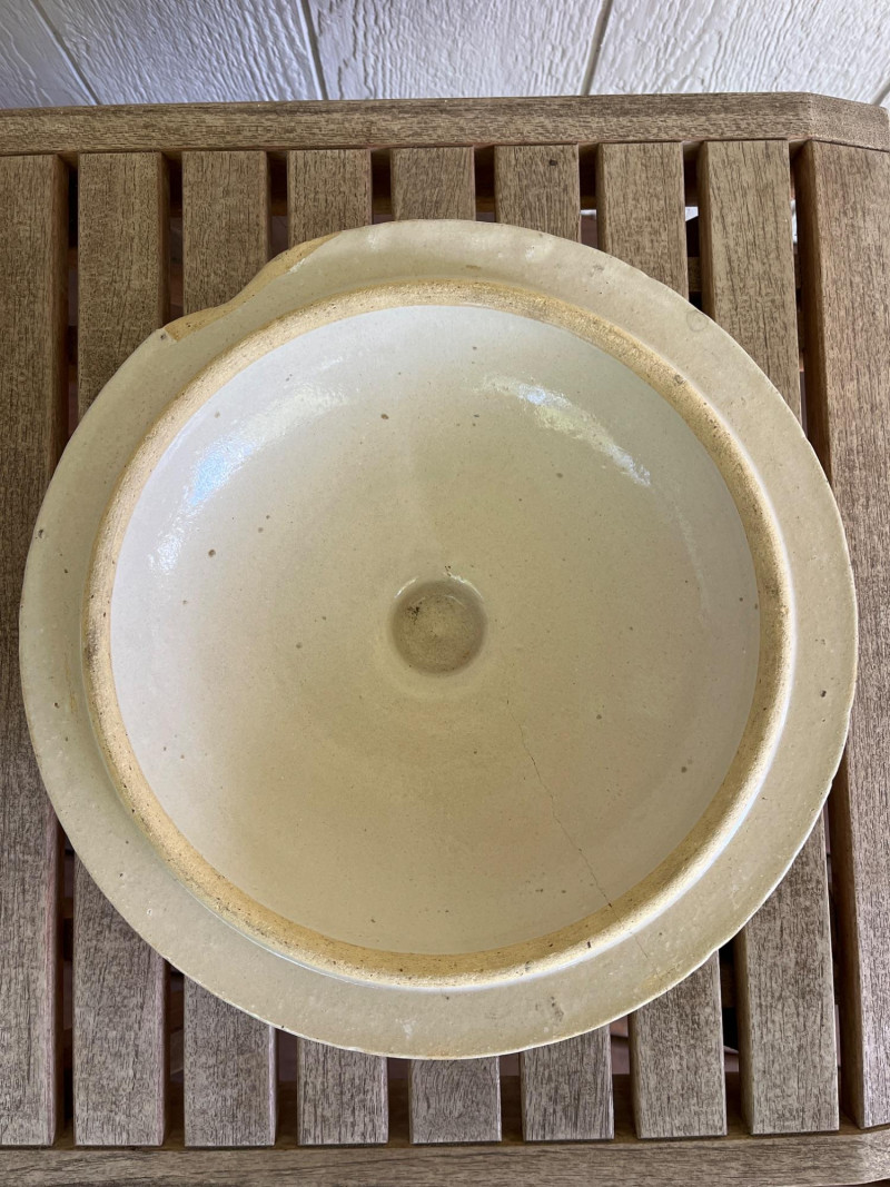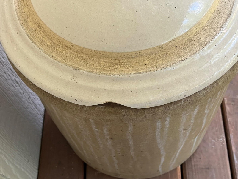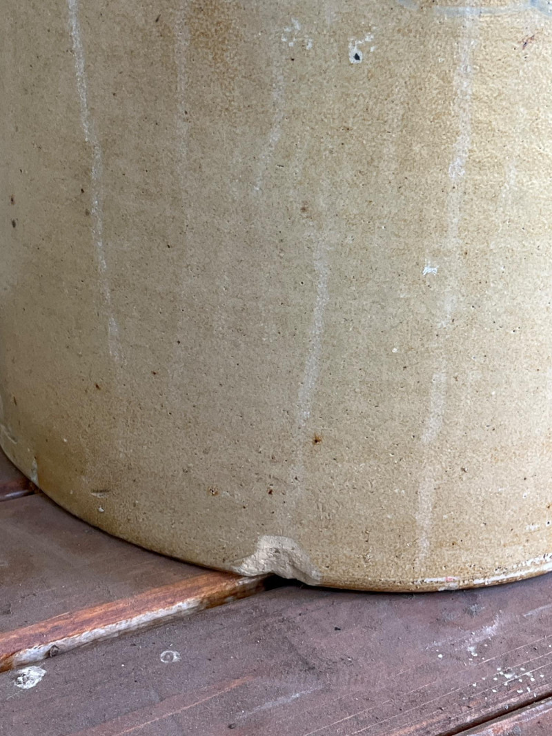 5-Gallon Salt-Glazed Stoneware Crock The cobalt blue "5" on the lid and the hand-drawn "5" design on the body indicate a 5-gallon capacity. The characteristic cobalt blue swirl on the front is a popular collector's motif known as a "bee sting" or "lazy eight" design. Tan salt-glaze exterior. The crock has molded "elephant ear" handles. Some cracks and chips. See pictures for details. 13”Tx12.5”W
