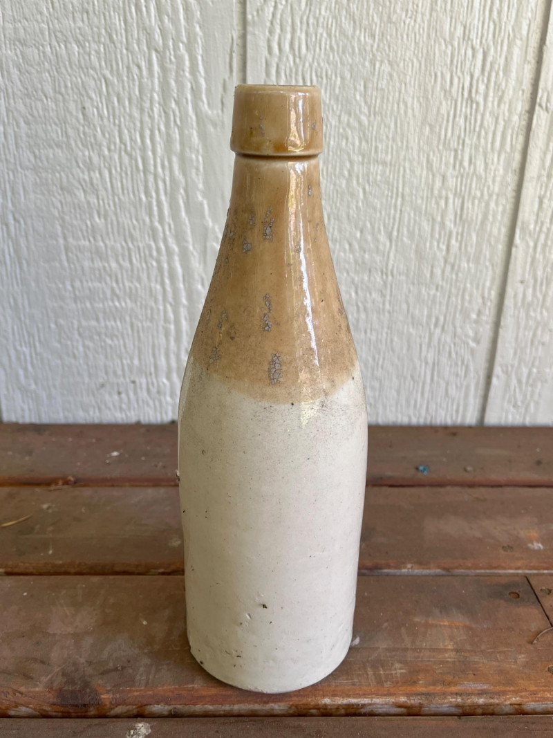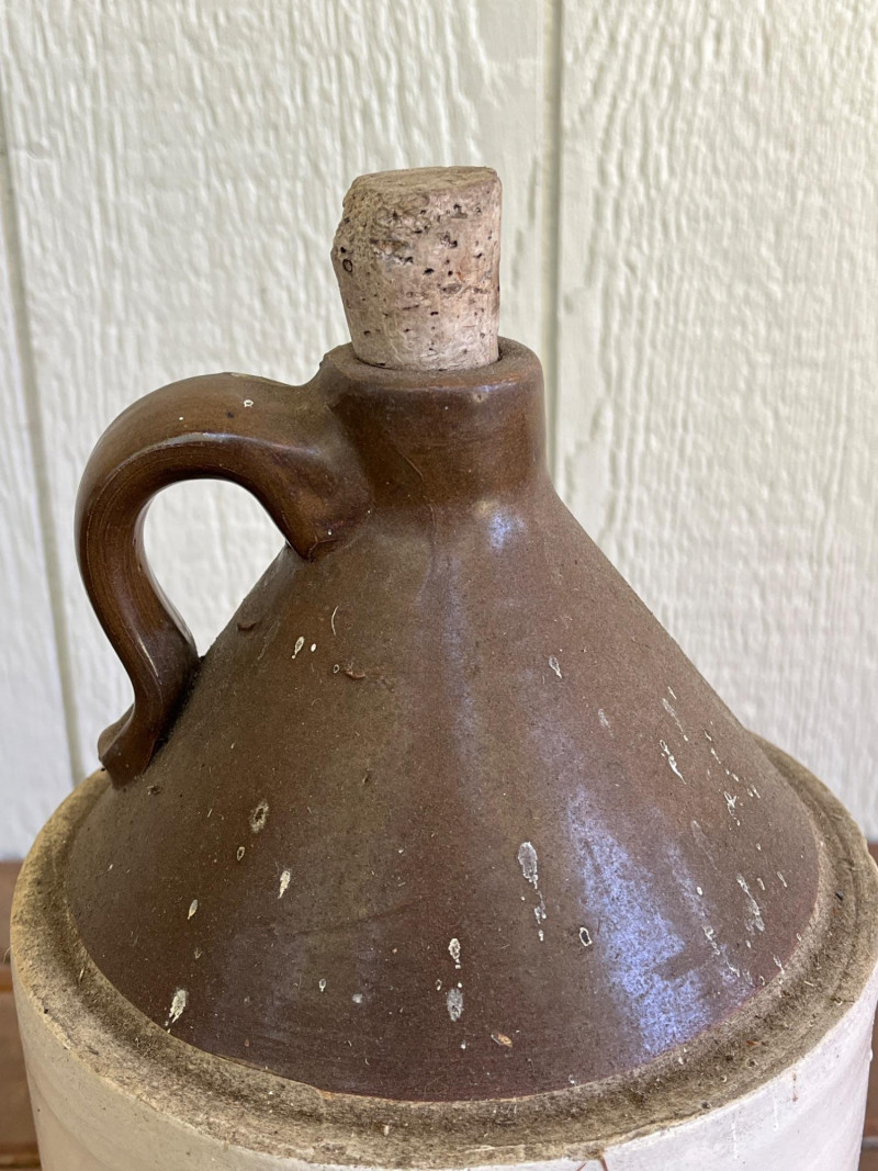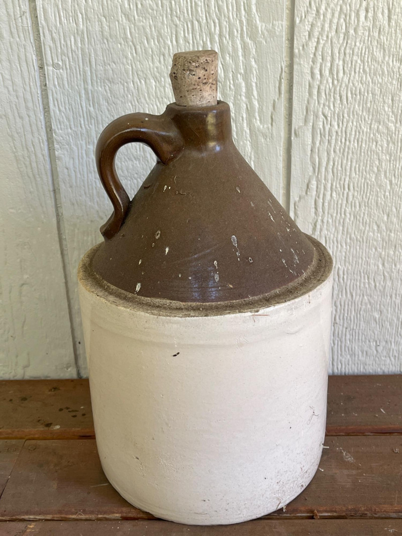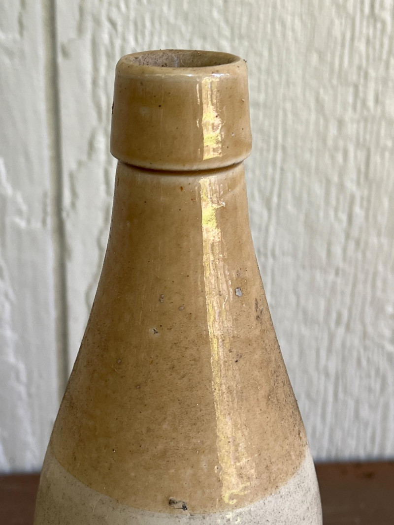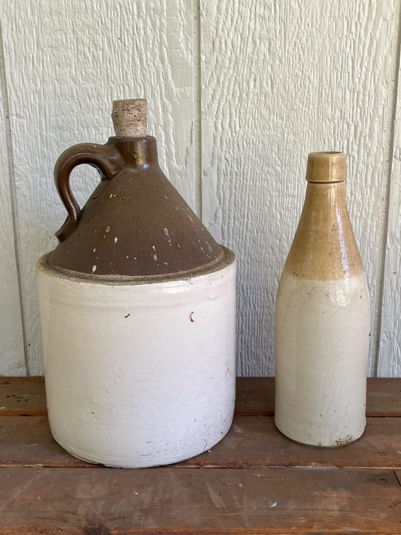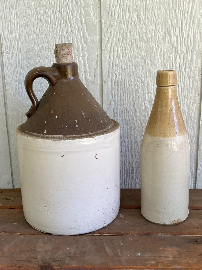 Pair of Antique Stoneware Vessels This is a "Bristol" glaze, a dark brown glazed top and an off-white body. It is made from dense, durable salt-glazed stoneware, designed to be non-porous and sturdy for long-term storage. The jug has its original cork stopper, which was typical for sealing these containers before the widespread use of screw-on caps 12.5”Tx7”W Antique Stoneware Bottle Commonly used for ginger beer or ale during the late 19th and early 20th centuries. "Two-tone" glaze: a rich tan glazed upper section and a light cream body. 10.5”Tx3.5”W