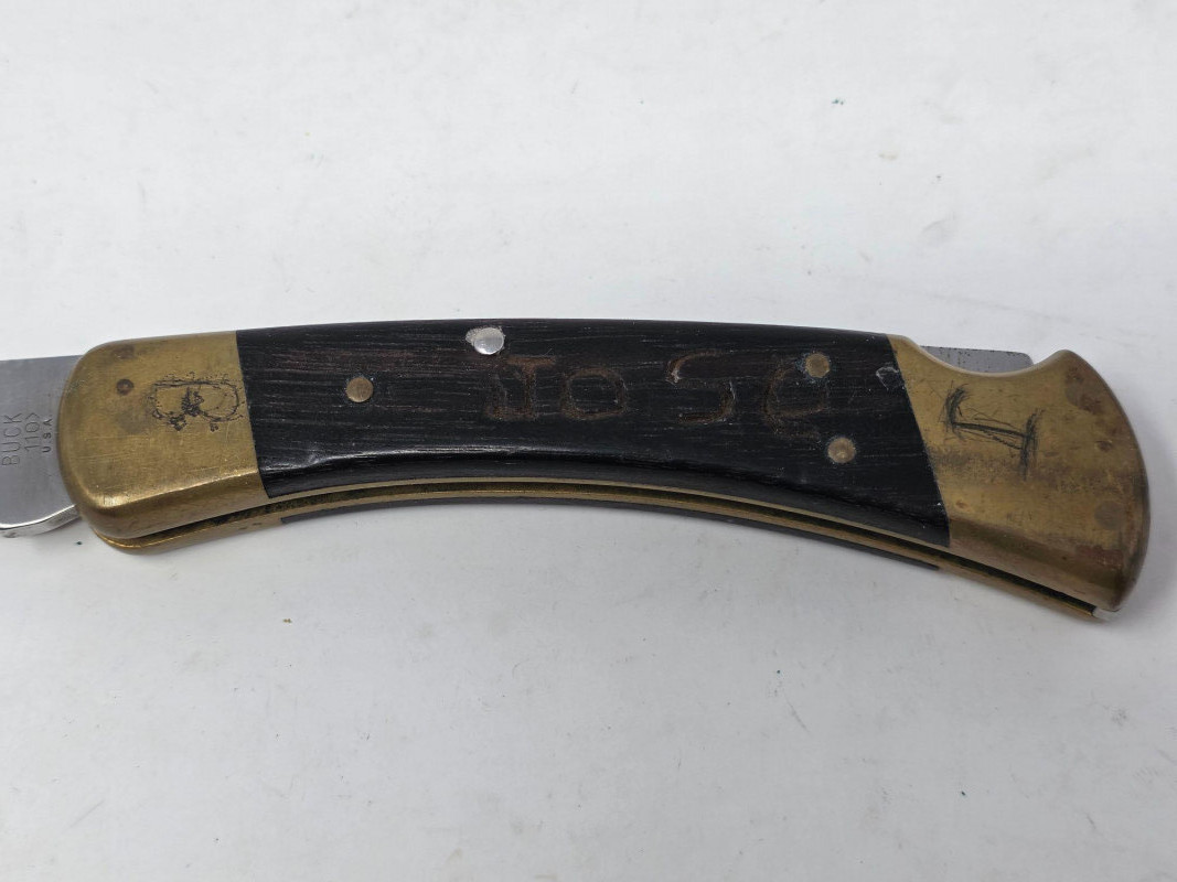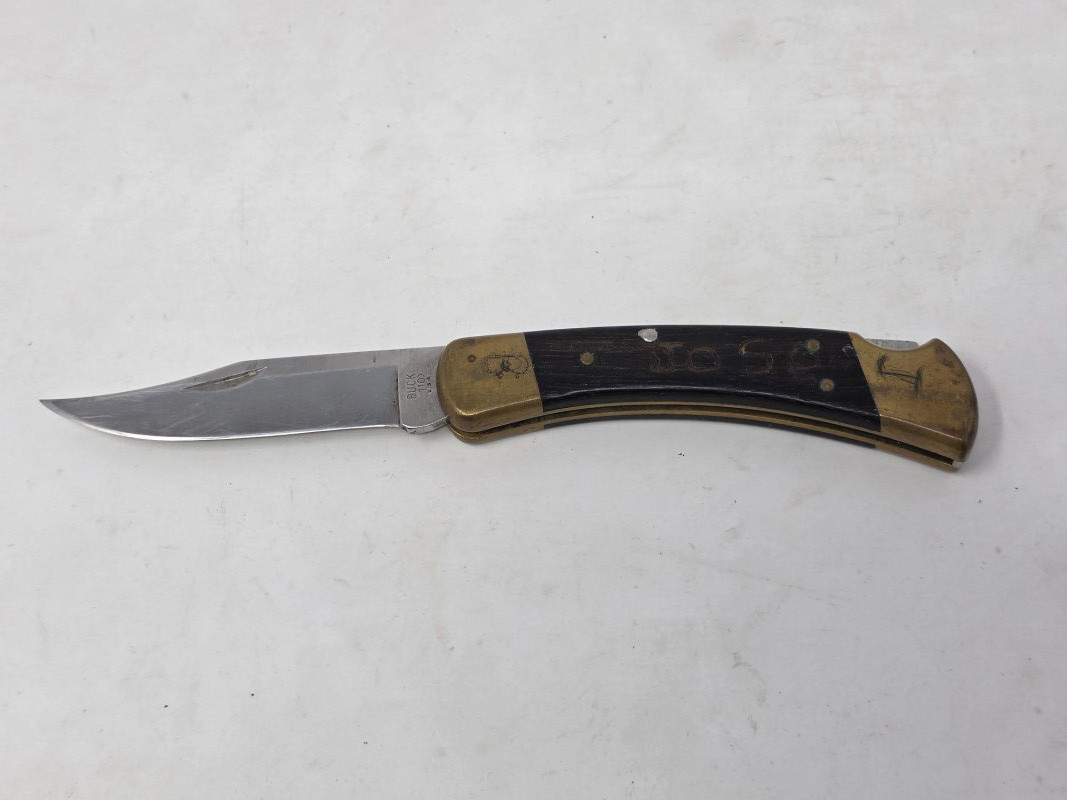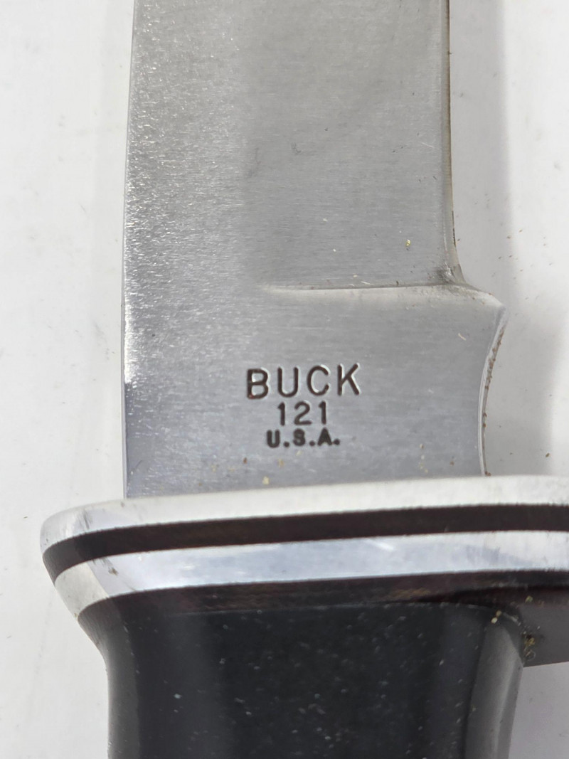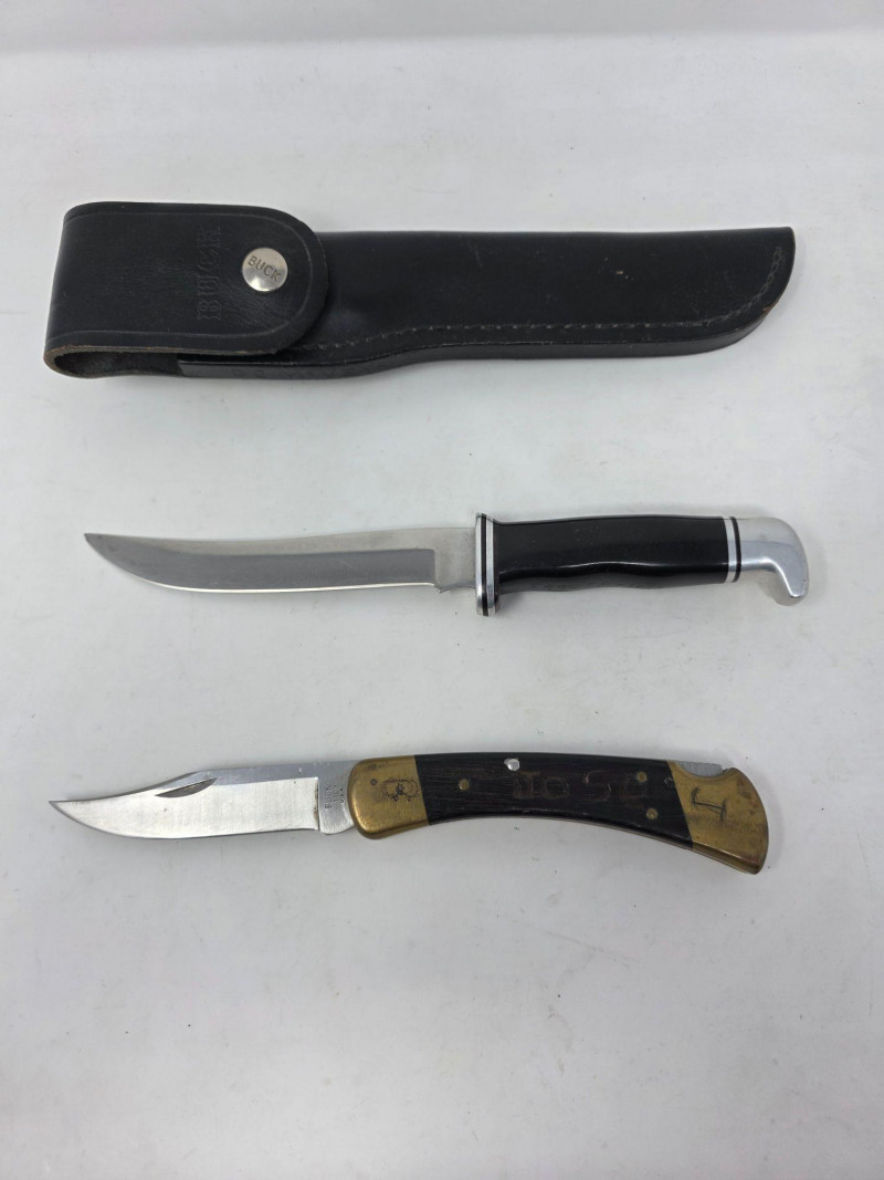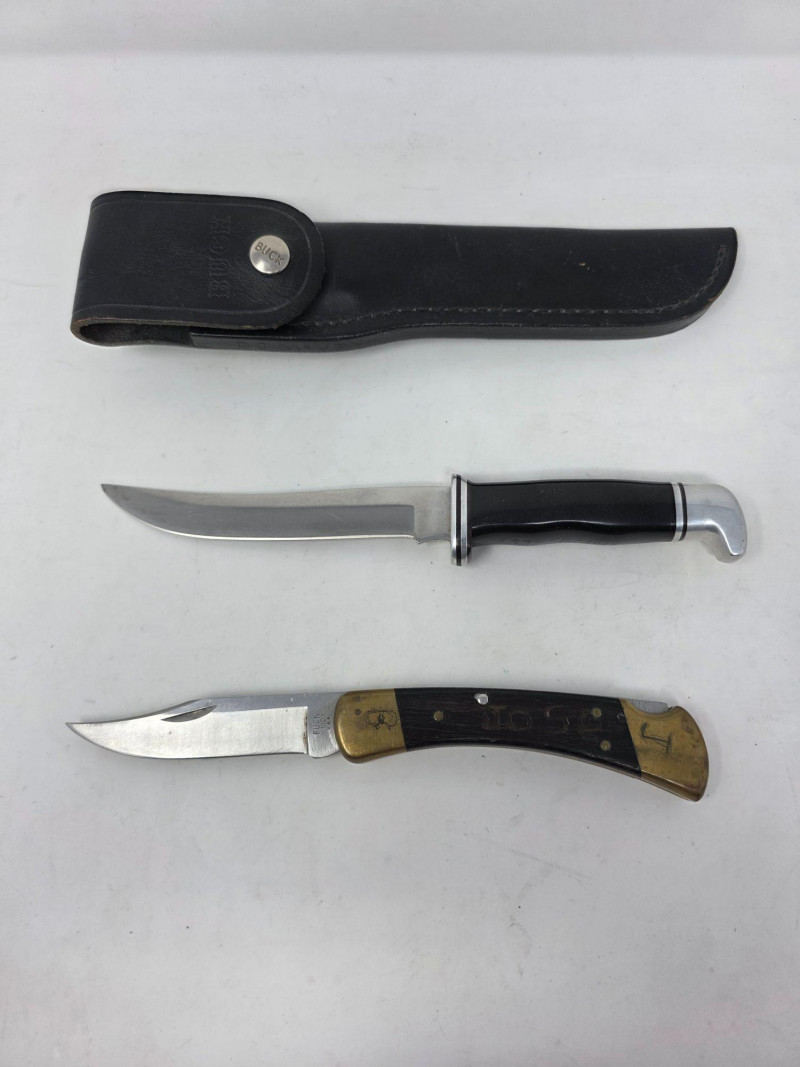 (2) Vintage Buck Knives (1) Buck Model 121 5.5" Fixed-Blade Fisherman Knife With Black Leather Flap-Over Pouch Sheath Manufactured 1972-1986 5.5" satin-finished stainless steel blade (typically 440C or 425M) with a slim, semi-flexible modified clip point profile Black phenolic resin (a hard, durable plastic) handle with an aluminum guard and pommel (1) Buck Model 110 3.75" Folding Hunter Lockback Knife Manufactured in 1986 Classic American lockback design first introduced in 1963 Features a 3.75" clip point blade made of 420HC stainless steel Handle constructed with brass bolsters and wood scales (often Macassar Ebony) Both knives are in vintage & used condition (see pics) Buck 110 knife has "Jose" carved into the woods handle on one side and "Cruz" on the other Buck 121: 9.5"L Buck 110: 8.5"L