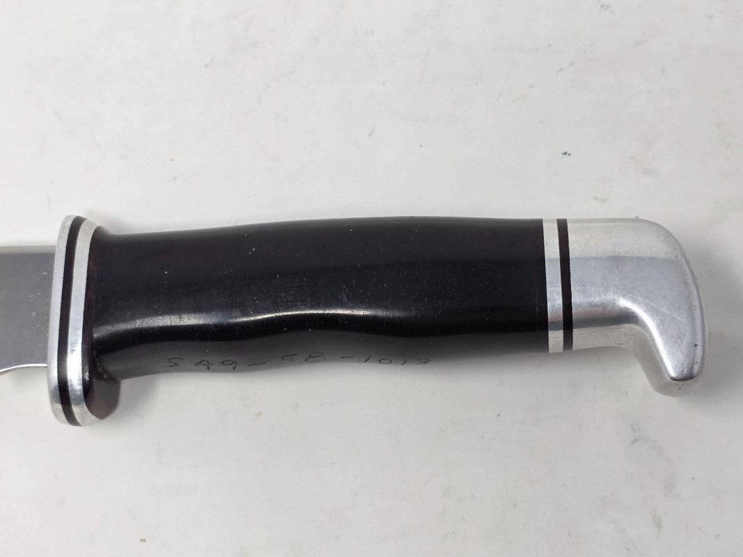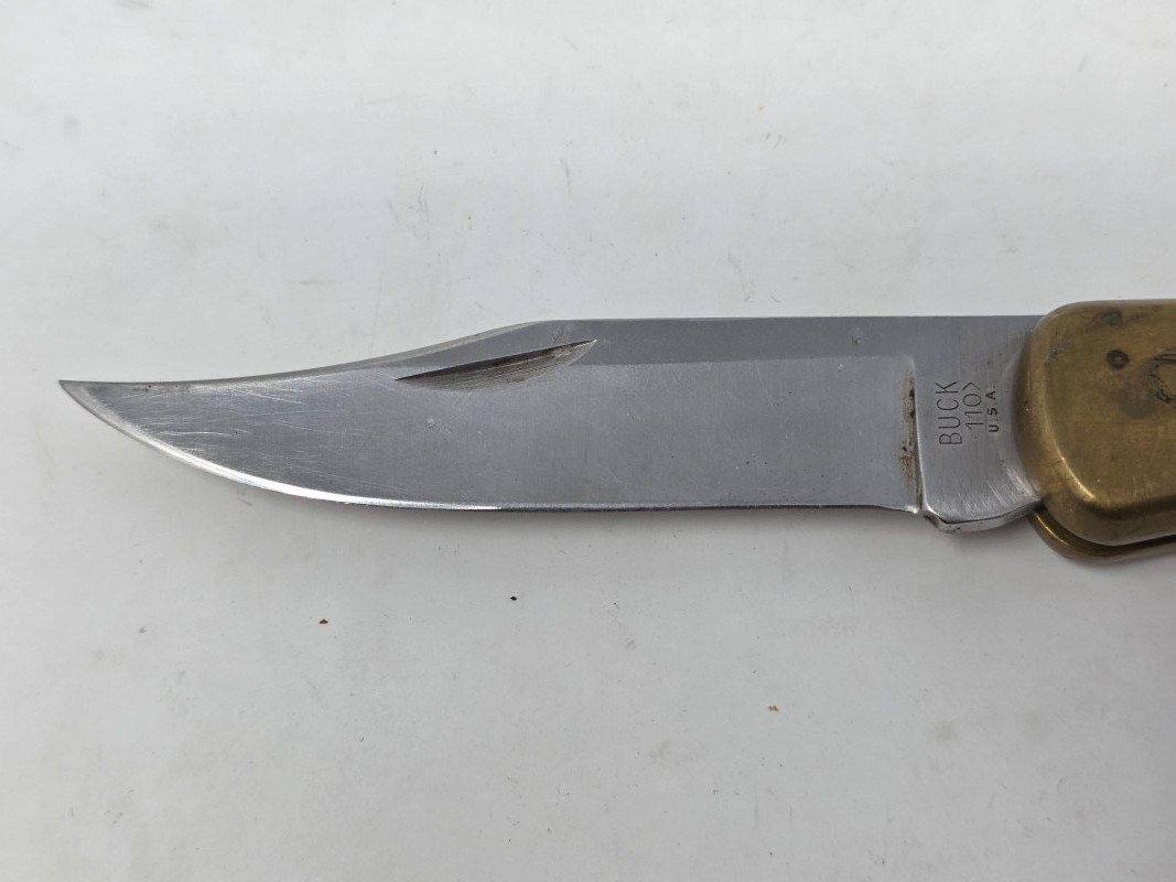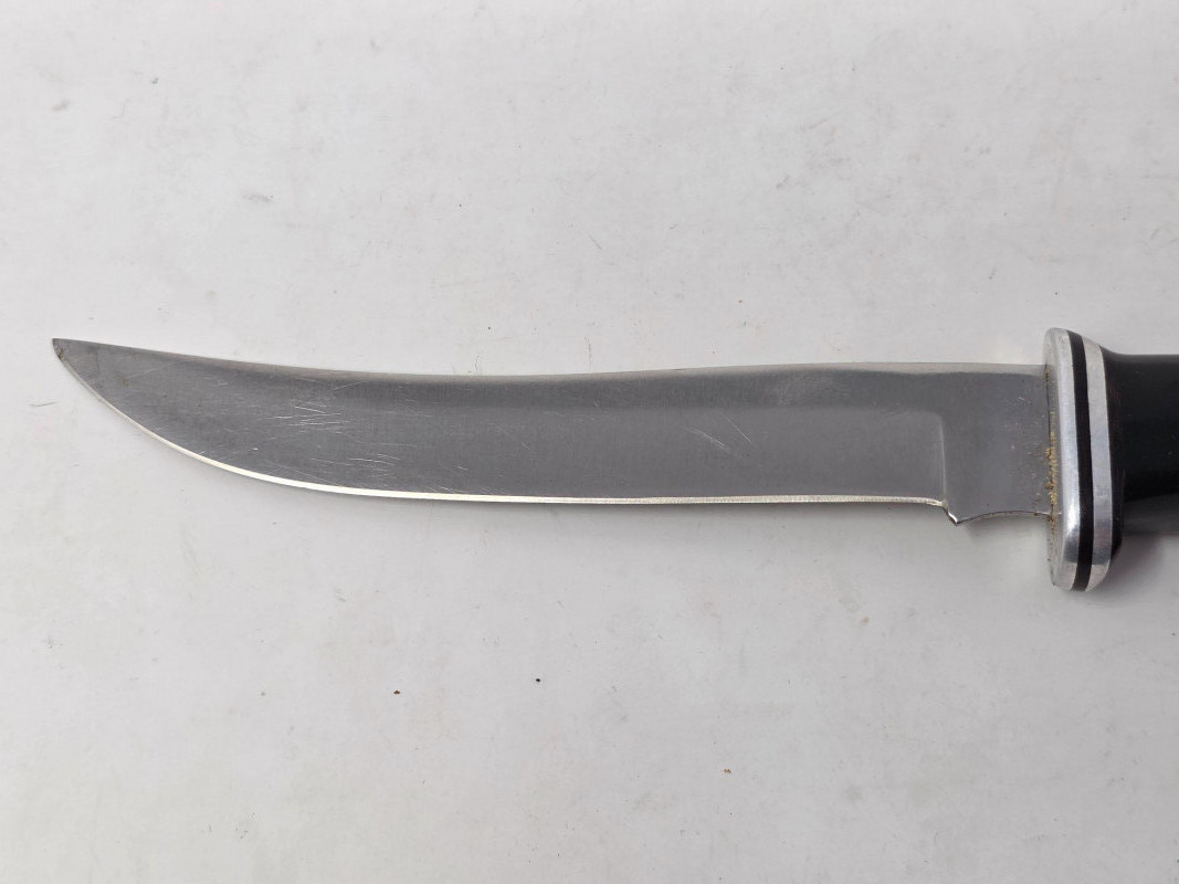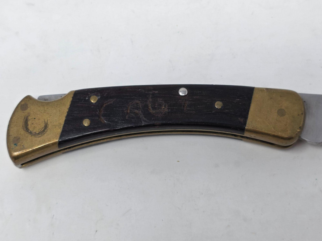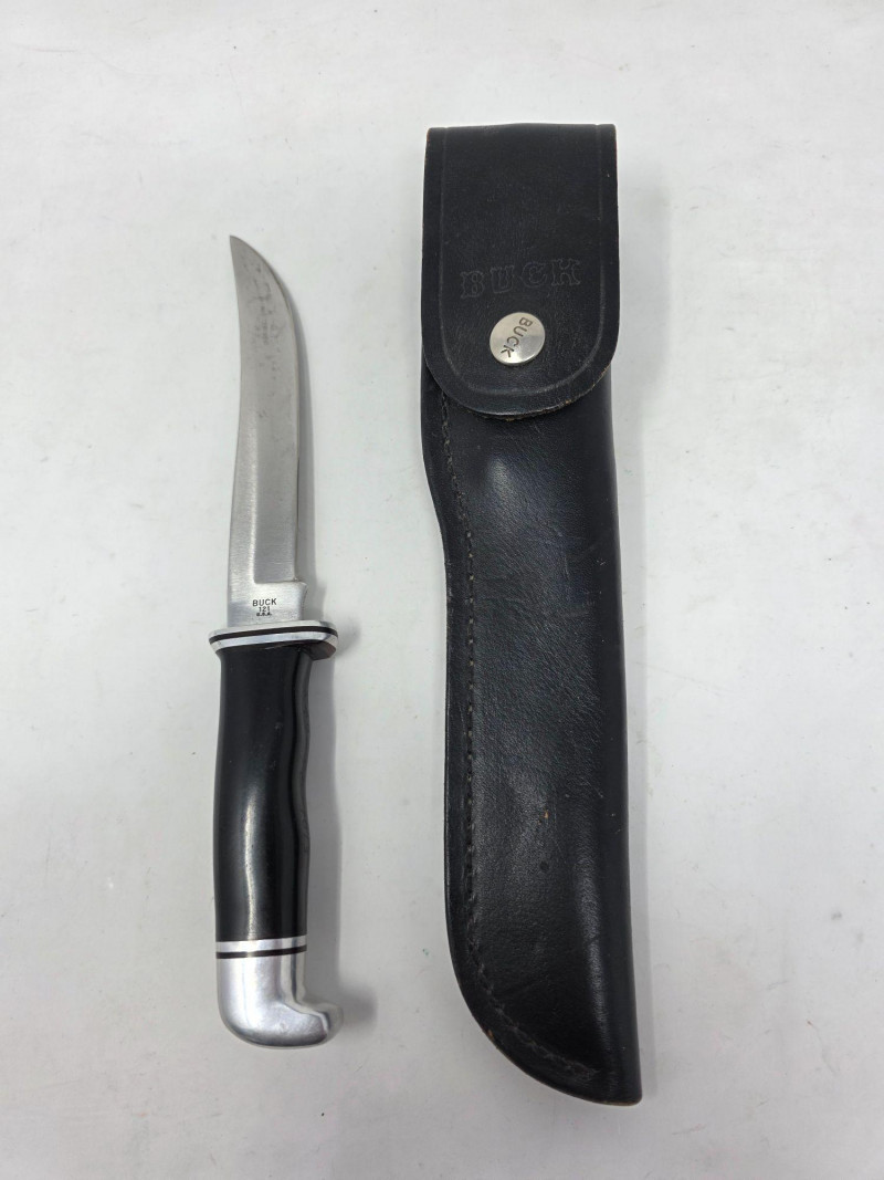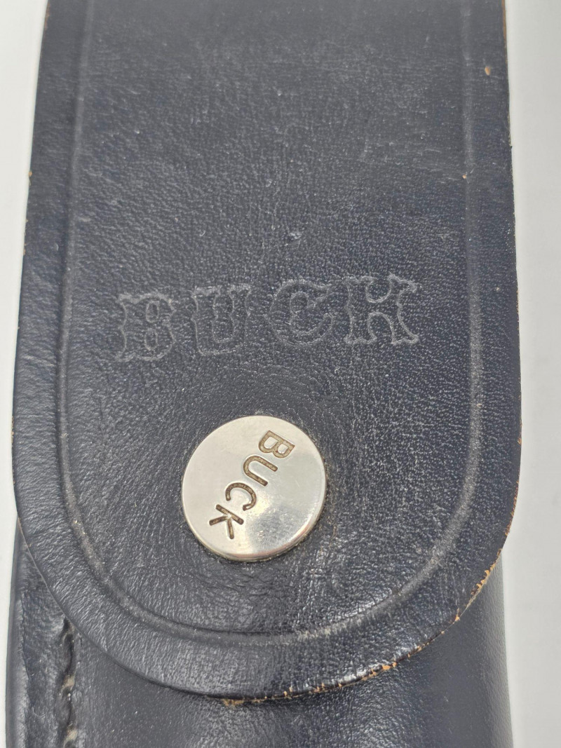 (2) Vintage Buck Knives (1) Buck Model 121 5.5" Fixed-Blade Fisherman Knife With Black Leather Flap-Over Pouch Sheath Manufactured 1972-1986 5.5" satin-finished stainless steel blade (typically 440C or 425M) with a slim, semi-flexible modified clip point profile Black phenolic resin (a hard, durable plastic) handle with an aluminum guard and pommel (1) Buck Model 110 3.75" Folding Hunter Lockback Knife Manufactured in 1986 Classic American lockback design first introduced in 1963 Features a 3.75" clip point blade made of 420HC stainless steel Handle constructed with brass bolsters and wood scales (often Macassar Ebony) Both knives are in vintage & used condition (see pics) Buck 110 knife has "Jose" carved into the woods handle on one side and "Cruz" on the other Buck 121: 9.5"L Buck 110: 8.5"L