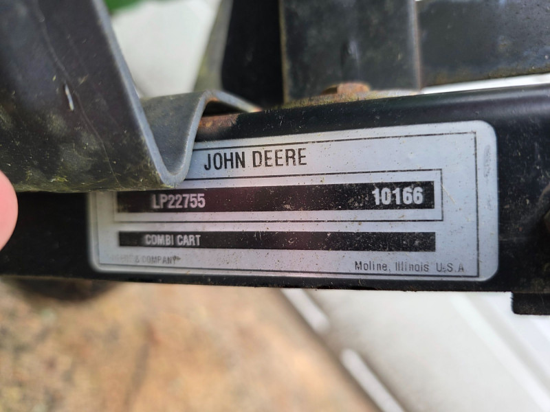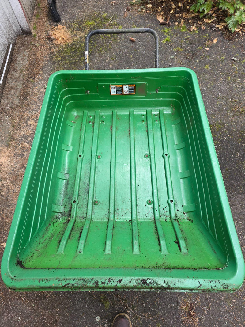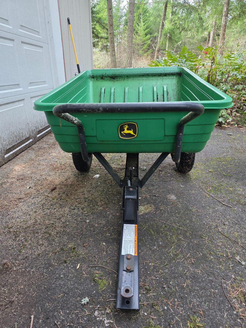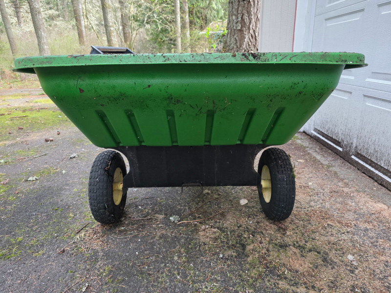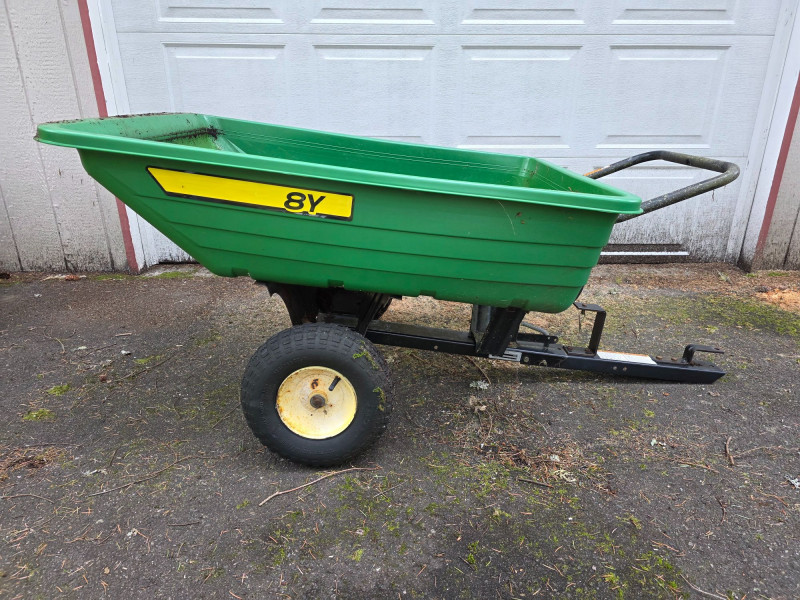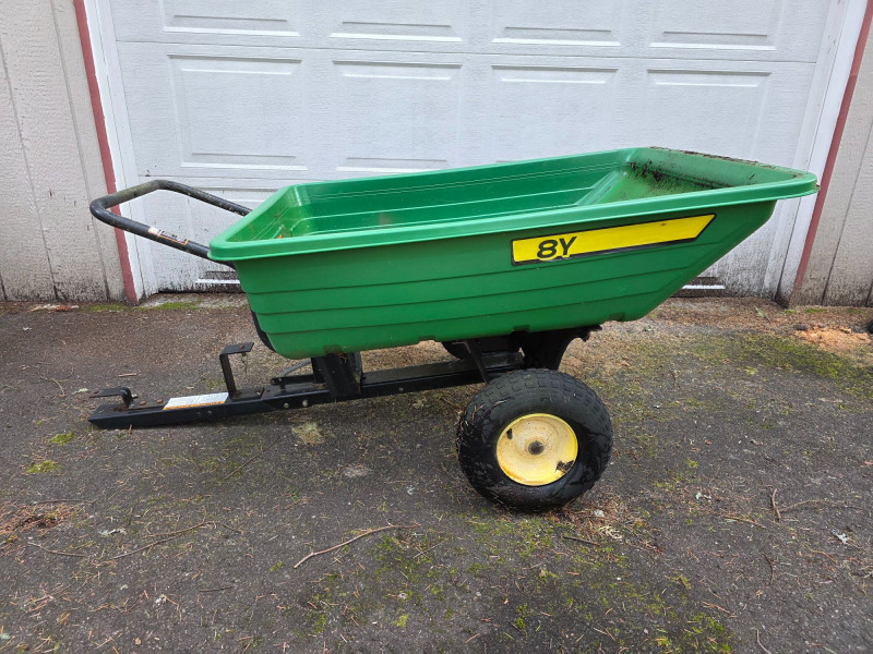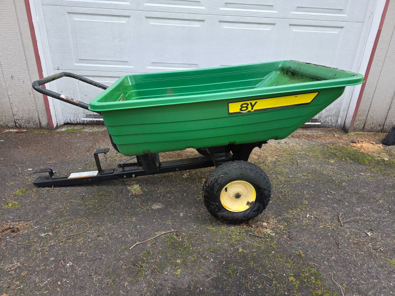 John Deere 8 Yard Dump Cart/ Tow-Behind Lawn Trailer This cart is designed for versatile use, featuring a convertible design that allows it to function as both a tow-behind cart for riding mowers and a push cart Capacity of 8 cubic feet, capable of hauling 350 lbs of materials like mulch or yard tools The cart features a durable polyethylene body for easy cleaning and maintenance It is equipped with 16-inch turf tread tires and a heavy-duty frame Left-side tire is cracked and may need replacement Tested - Works! 29.5"T x 65"L x 33.5W