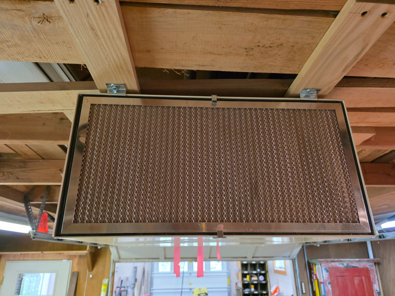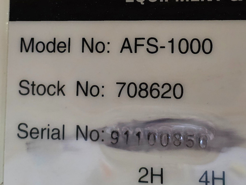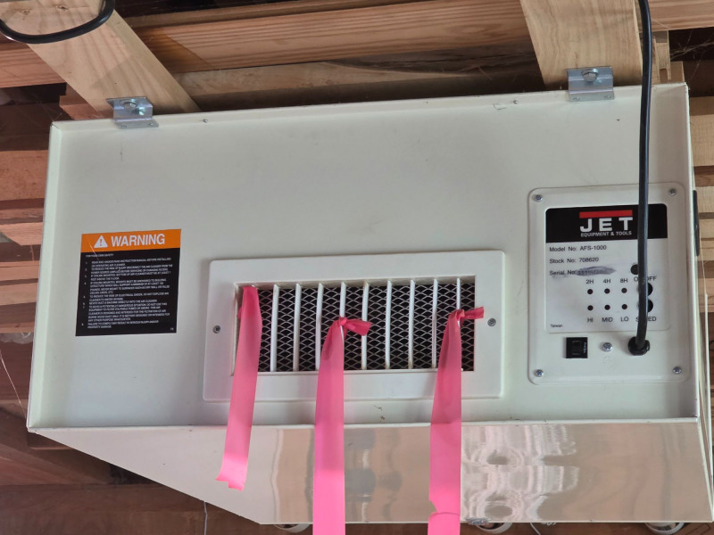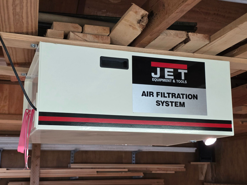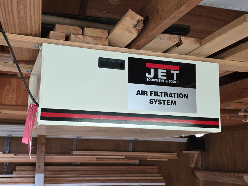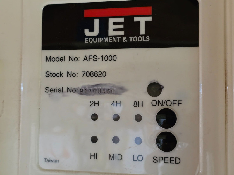 Jet AFS-1000 Air Filtration System Heavy-duty, two-stage air purification unit designed for woodworking shops to capture fine dust that standard dust collectors might miss Includes a remote control and 8-hour timer Delivers up to 1000 CFM to clean workshop air effectively Three-speed settings (roughly 450-1000 CFM range) Features easy-grip handles and four eye bolts for secure ceiling suspension, or it can be placed on a workbench Plugs in to a standard 110V outlet Tested - Works! 12"T x 30"L x 24"W