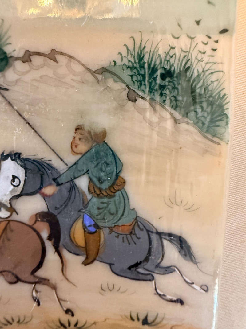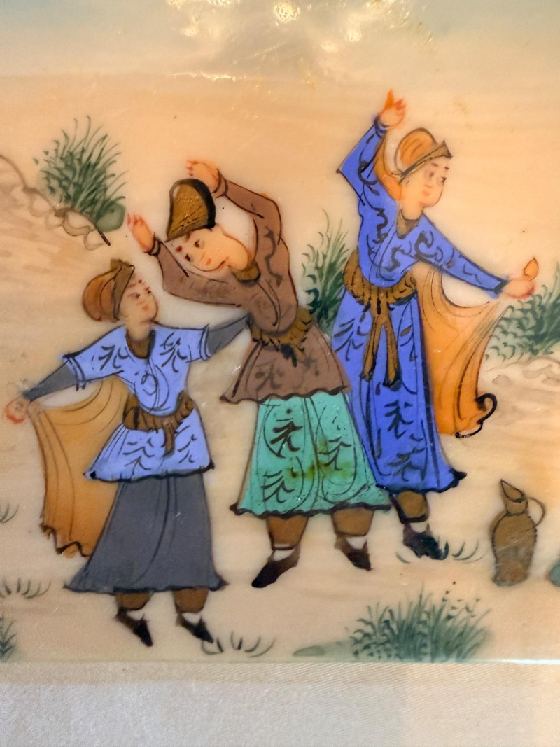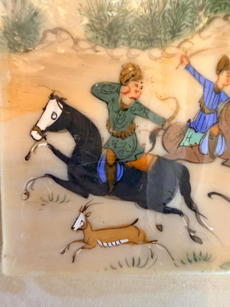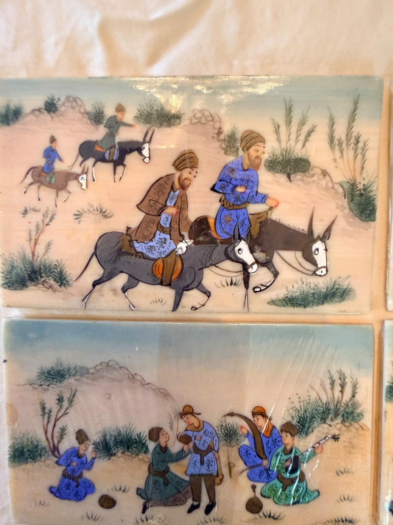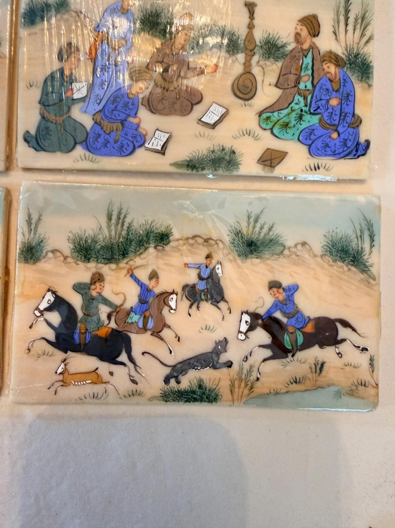 Persian miniature paintings, a traditional Iranian art form characterized by small-scale, highly detailed scenes often depicting historical events, mythology, or daily life. Hand-painted on bone panels, which is a common substrate for this style of vintage decorative art.