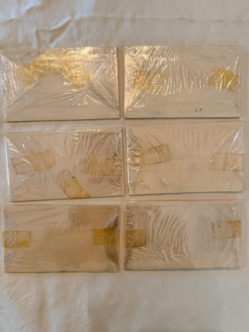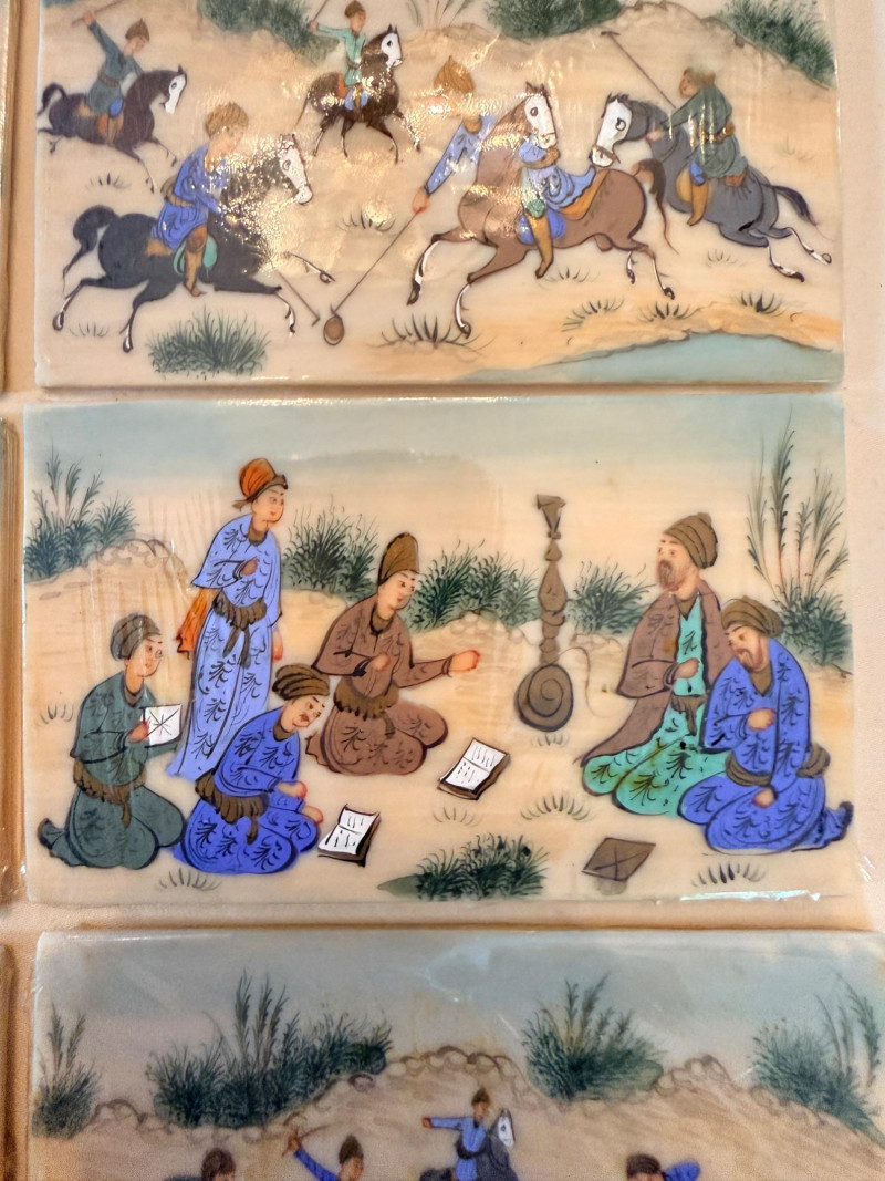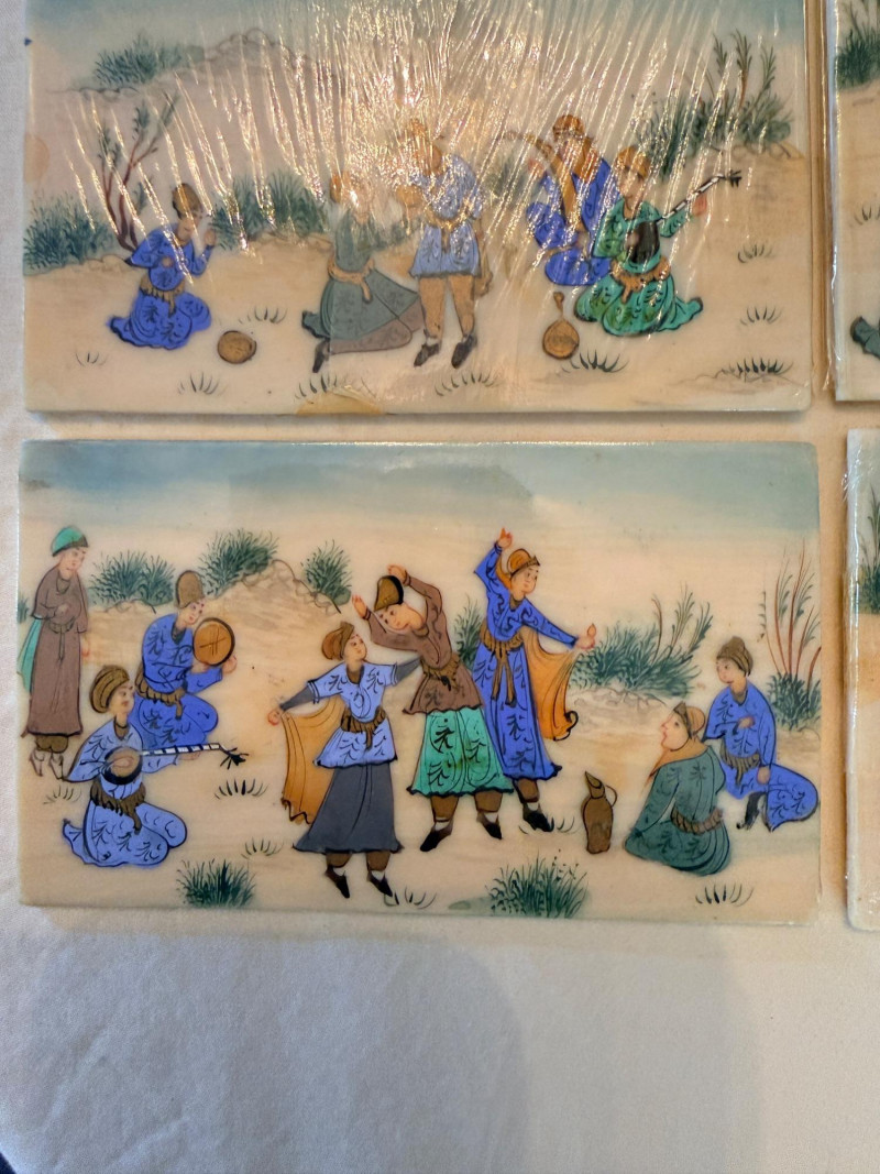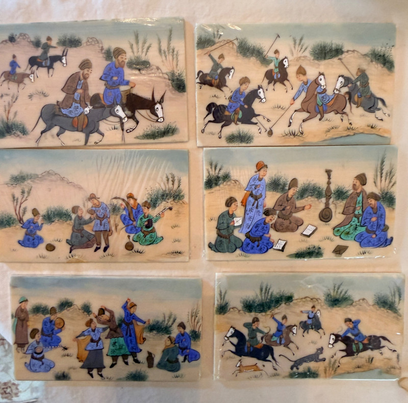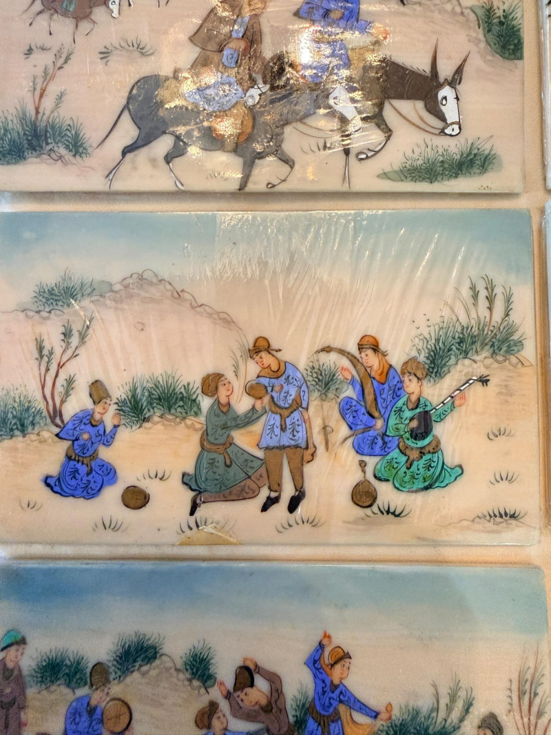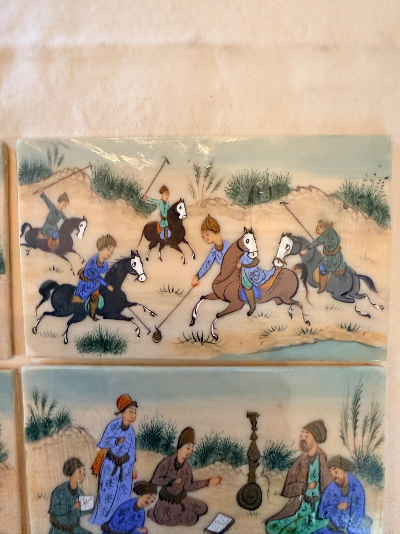 (6) Persian Miniature Paintings on Bone This set displays classic miniature subjects, including a polo game (top right), figures in a landscape, and scenes of music and dance. Collectible sets from the 20th century were painted on bone or ivory panels and sold as decorative pieces. These types of multi-panel sets are identified as vintage pieces from the mid-20th century(pre-1979). 4”x2.5” each in original protective packaging.