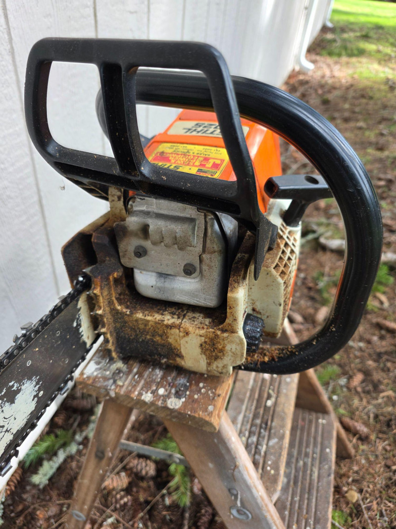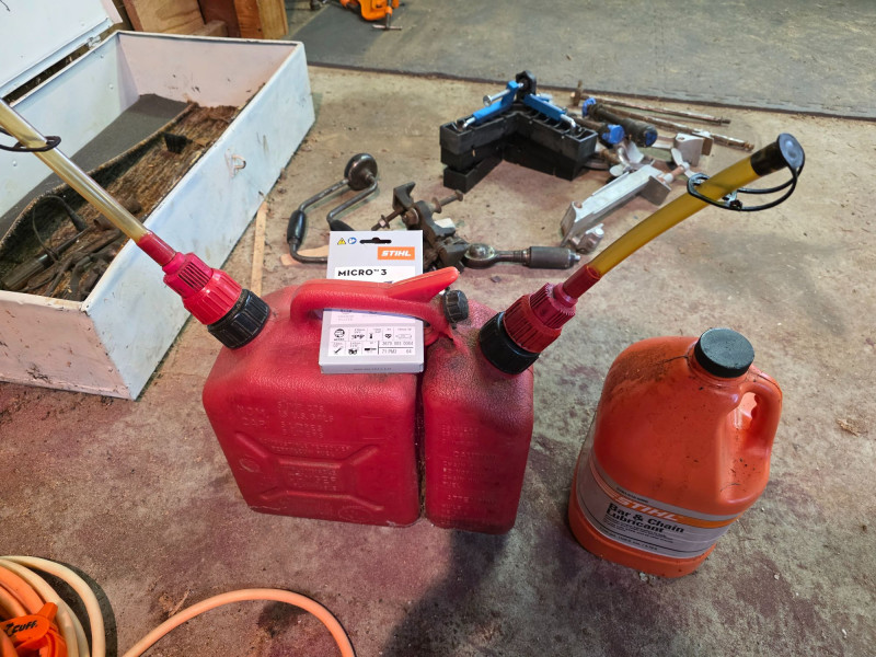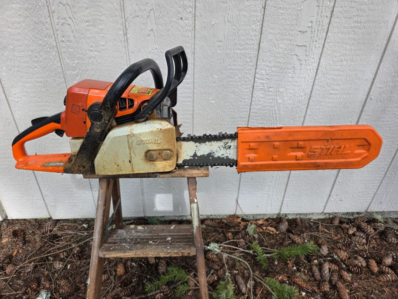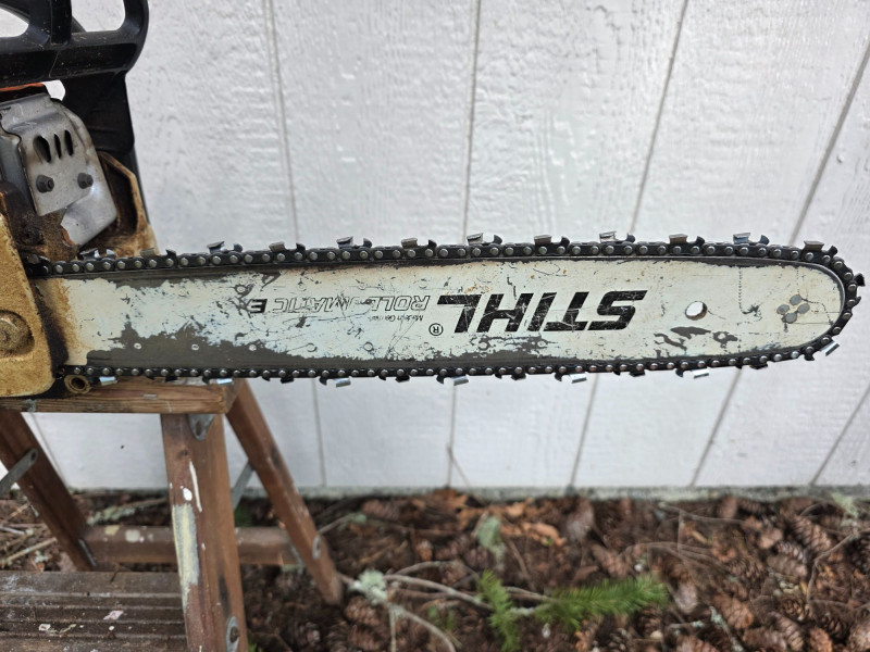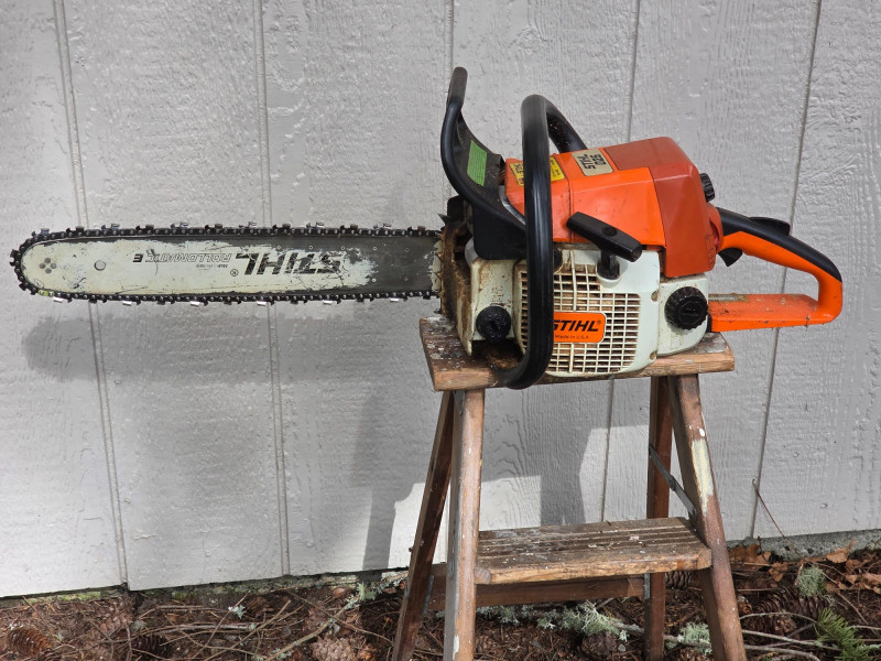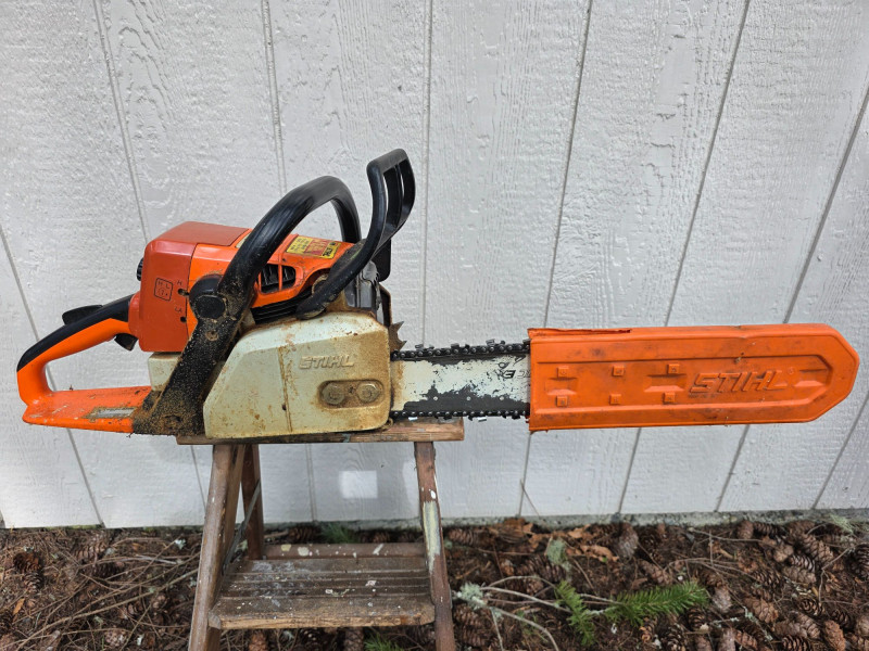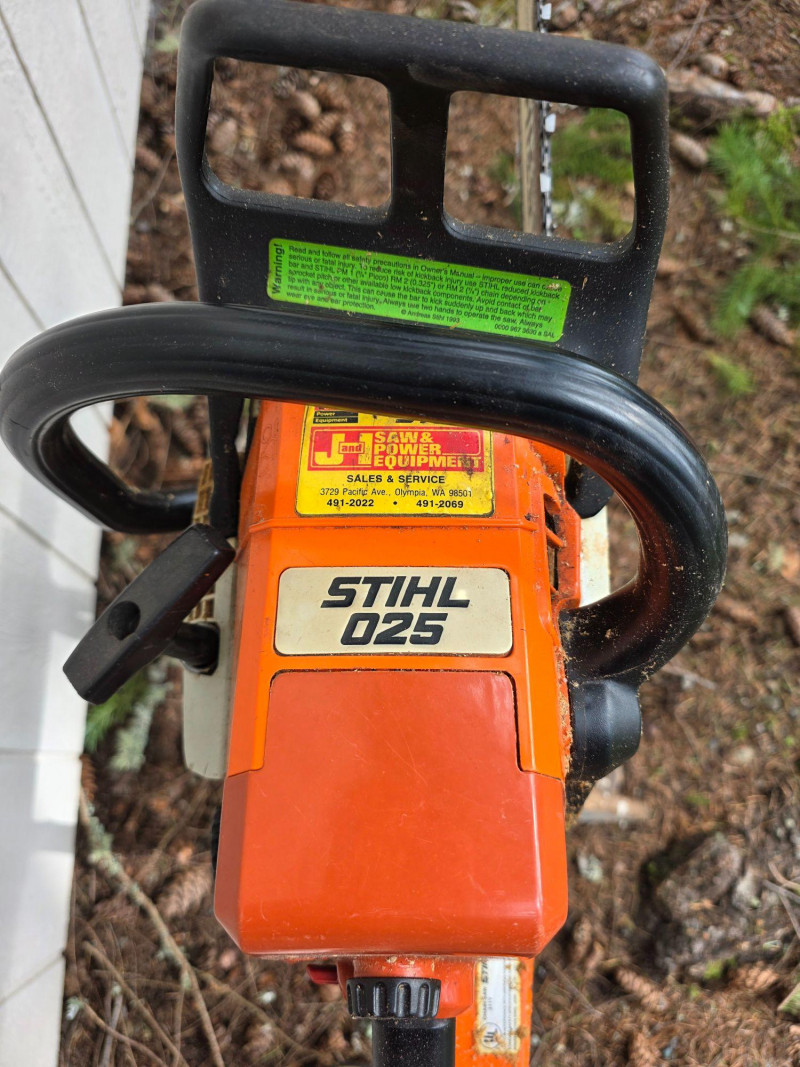 STIHL 025 45.4cc Gasoline-Powered Chainsaw Produced between 1991 and 2002 Regarded as a reliable, lightweight homeowner saw (10.4–11 lbs) with a 3 HP engine Features a 16 to 18-inch bar, automatic oiler, and an anti-vibration handle, making it popular for firewood and property maintenance Engine: 44.3–45.4 cc 2-stroke engine (~3 HP). Weight: ~10.4 lbs (4.7 kg) without fuel/bar. Bar Length: Recommended 14–18 inches. Chain Pitch/Gauge: .325" pitch / .063" gauge Includes Bar Oil, new chain and gas cans Untested!