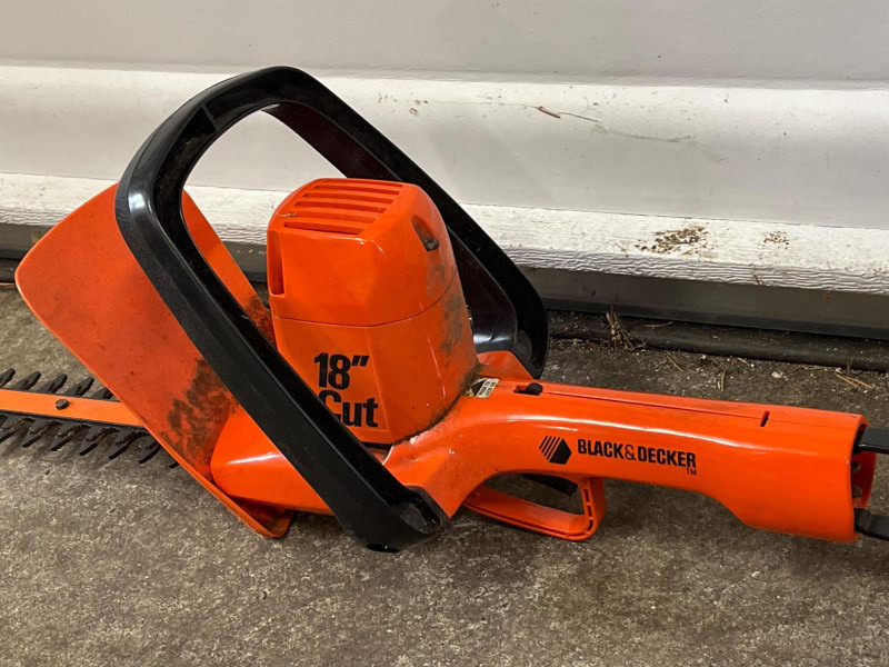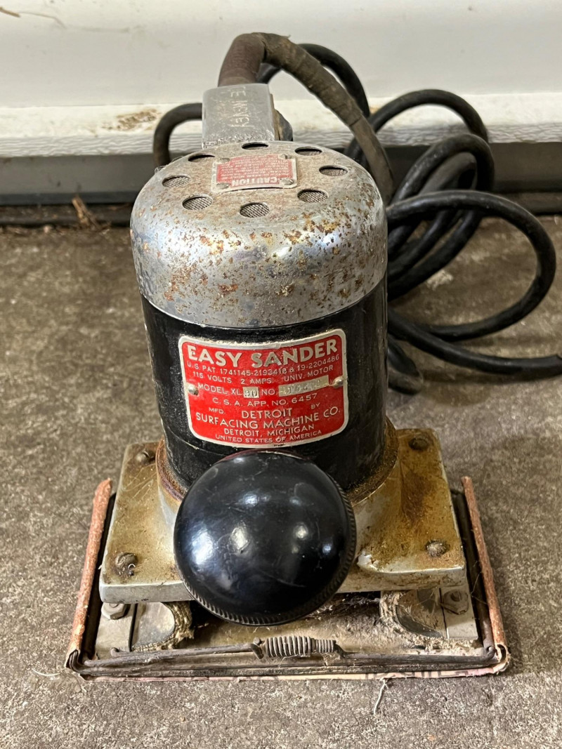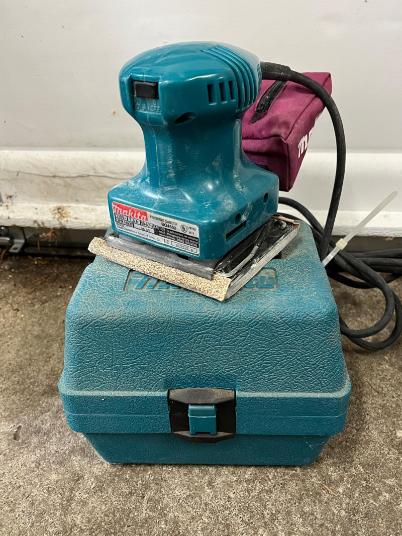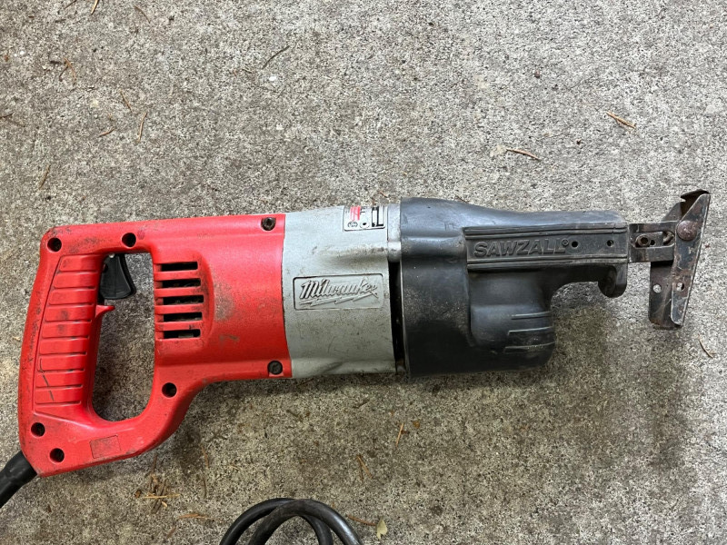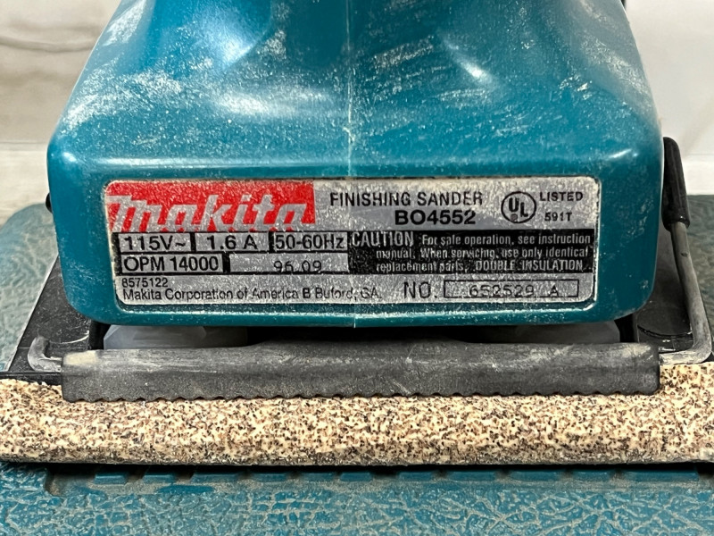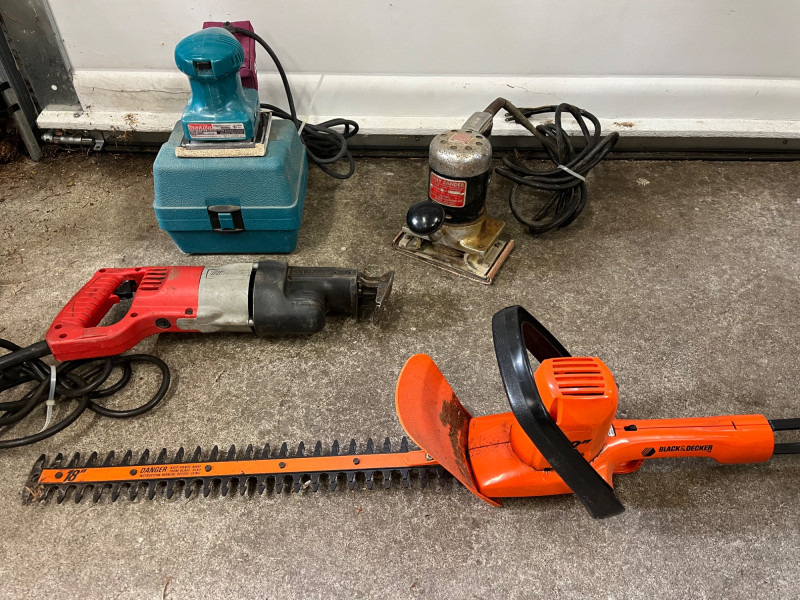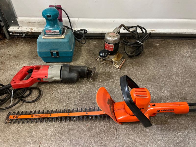 Makita BO4552 Finishing Sander Model # BO4552 Commonly known as a 1/4-sheet palm sander. It is a corded power tool designed for precision sanding tasks and achieving smooth, professional finishes on various surfaces like wood. 14,000 Orbits Per Minute (OPM) for fast, smooth finishing. 115V, 1.6A - 2.0A motor. Compact, ergonomic palm grip for one-handed operation and reduced vibration. Tested: Works. Milwaukee Sawzall 6507-20 corded reciprocating saw. 120 V AC, 60 Hz, 4.0 Amps. Variable speed up to 1000 strokes per minute (SPM). Tested: Works. Black & Decker 18" Hedge Trimmer Model # 8134, Type 4. 18 inches. 120 Volts AC only. 2.6 Amps. 3000 CSPM (Cutting Strokes Per Minute). Tested: Works. Easy Sander Model XL-90 Portable electric sander manufactured by the Detroit Surfacing Machine Co. based in Detroit, Michigan. Model # XL-90 Voltage: 115 Volts Amperage: 2 Amps Universal Motor (compatible with both AC and DC current) Tested: Works.