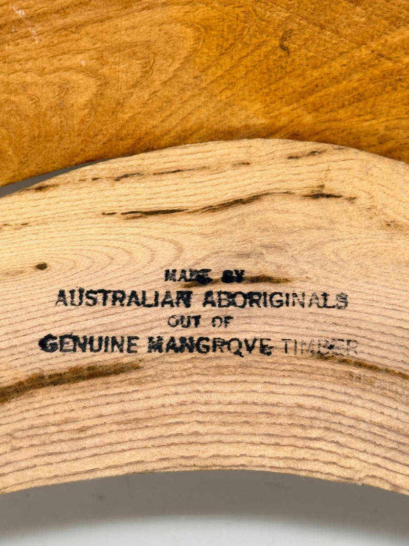 Hand-carved Mangrove Timber hardwood with burned wood pyrography and additional painted details, often representing traditional legends. 17.5”x5”