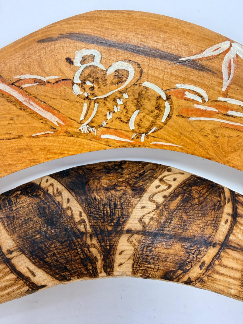 (2) Decorative wooden boomerangs featuring Australian Aboriginal-style art, specifically a burned wood and painted illustration of a koala in a tree. 19.5”x6.5”