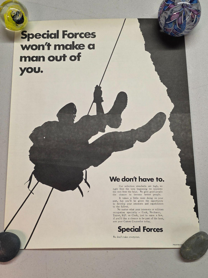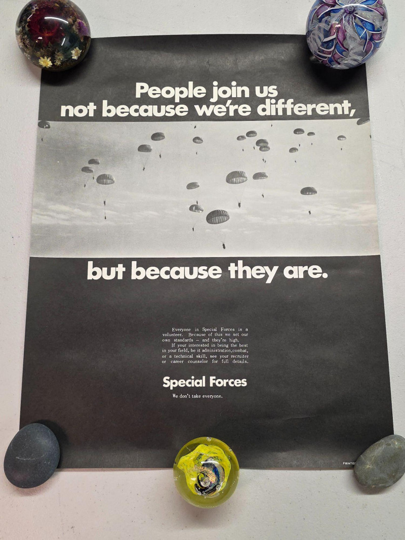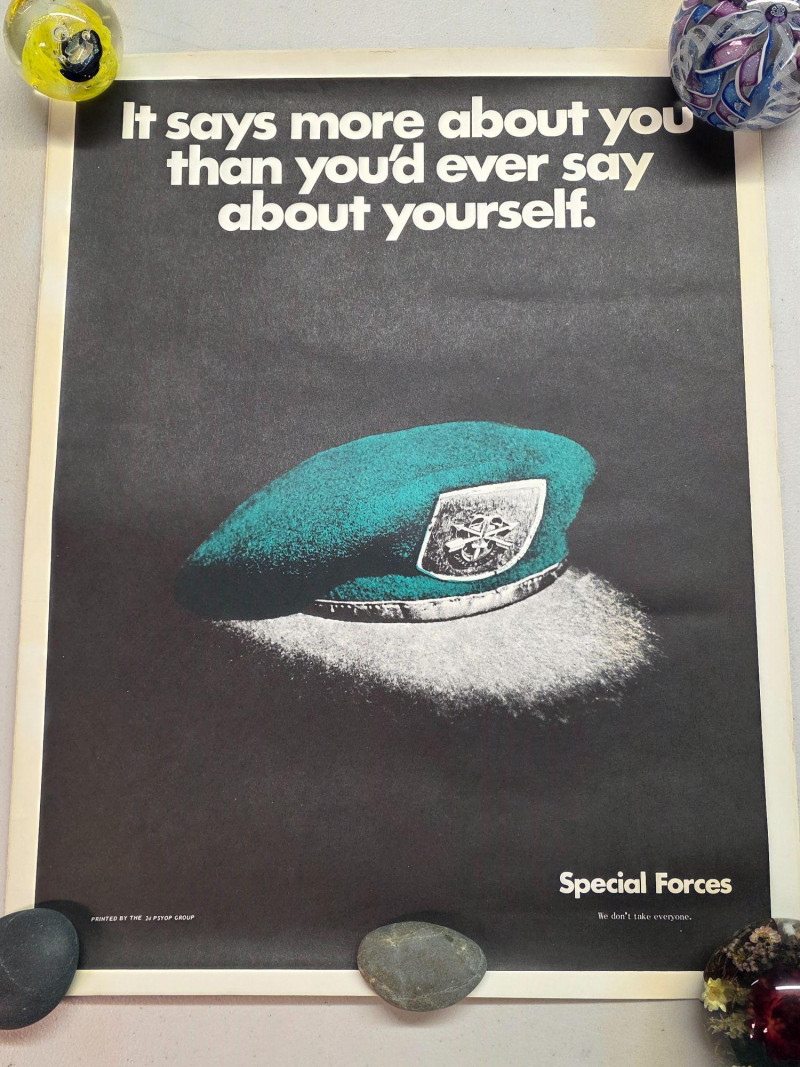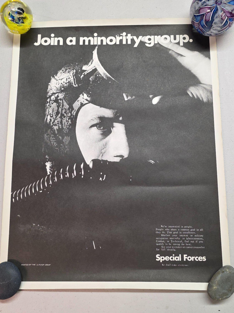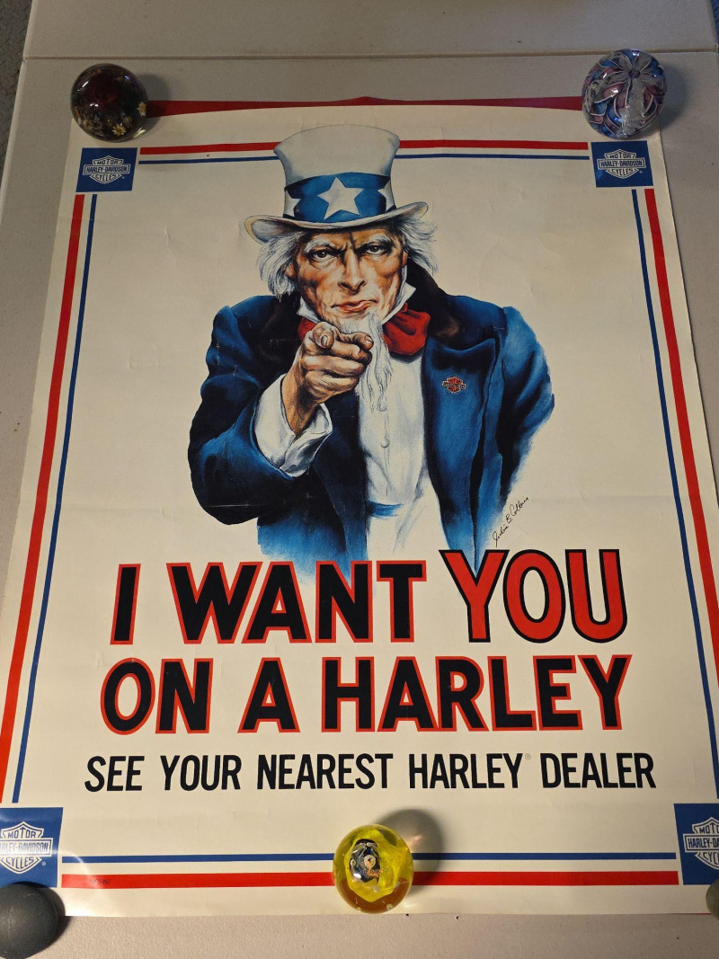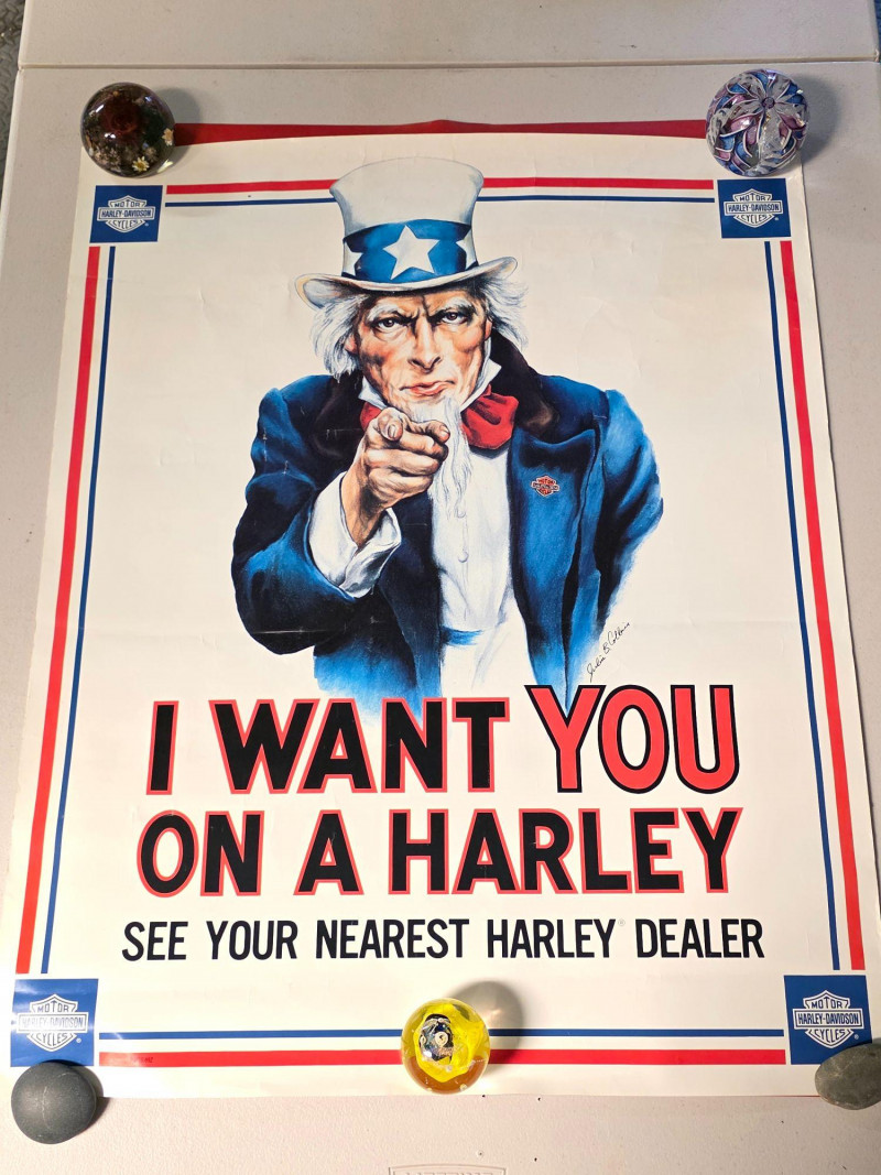 (6) Rolled Posters Advertising Harley Motorcycles & Special Forces Recruitment (1) I Want You On A Harley Classic Uncle Sam Selling Harley Davidson Motorcycles - 29.5"T x 24"W (1) American Motorcycles Jumping Yellow Harley Davidson Motorcycles Promoting Smithsonian Exhibit Of Early American Motorcycles (1900-1940) - 30.5"T x 21.4"W (1) Recruiting Poster Printed By 2nd PSYOP Group: Special Forces Paratroopers - 18"T x 14"W (1) Recruiting Poster Printed By 2nd PSYOP Group: Special Forces Rappelling - 18"T x 14"W (1) Recruiting Poster Printed By 2nd PSYOP Group: Special Forces Green Beret - 19"T x 14.75"W (1) Recruiting Poster Printed By 2nd PSYOP Group: Special Forces Join A Minority Group - 19"T x 14.75"W Posters have been rolled up for quite awhile, so there are creases but would be cool display pieces framed & hung!
