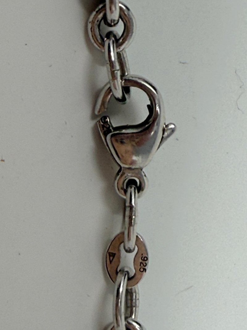 This necklace is a retired James Avery beaded diamond-shaped pendant on a Sterling silver Rolo chain. Approximately 1 ¾ inches long (including the bail) on a 24” Rolo chain.