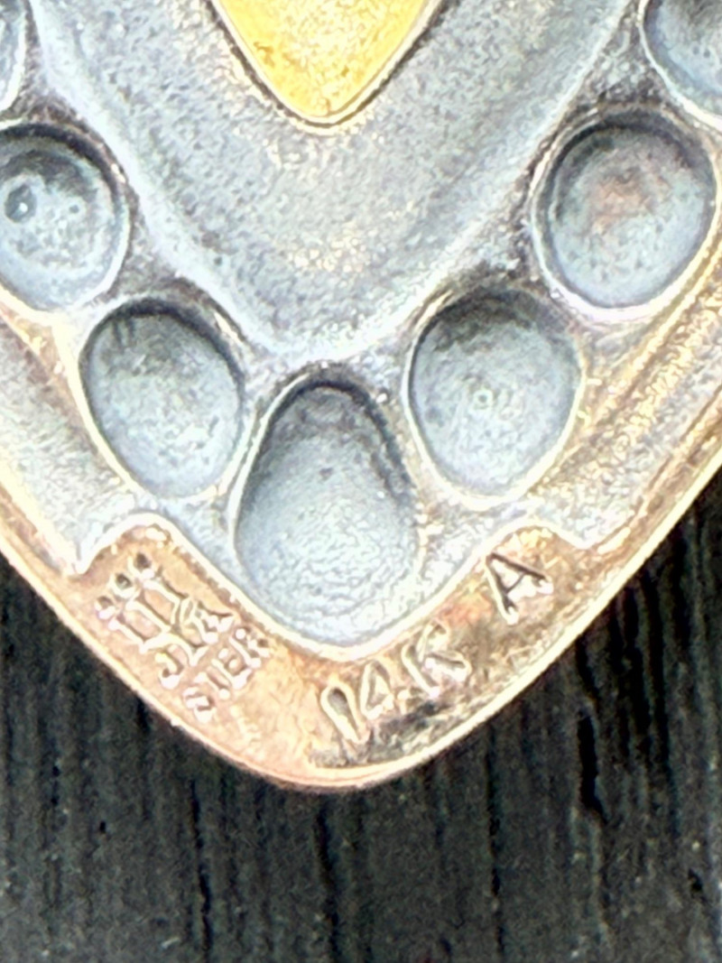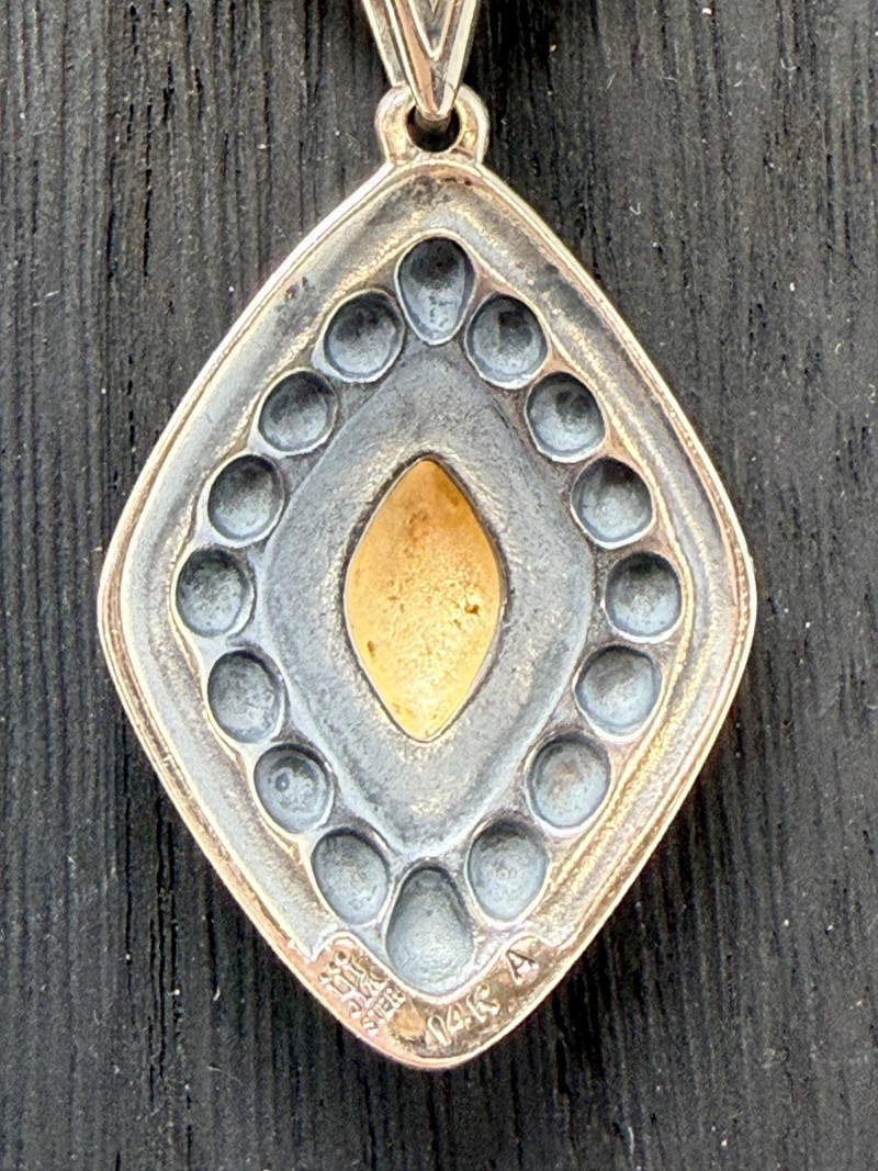 The piece is a two-tone design featuring a 14k yellow gold center accent set within a sterling silver (925) frame. It is characterized by its distinct diamond shape and a border of raised beaded accents.