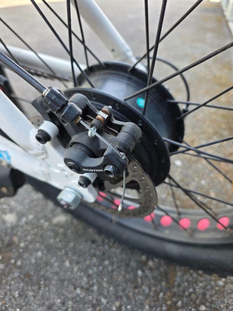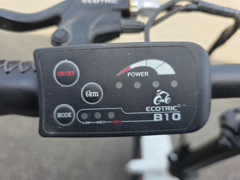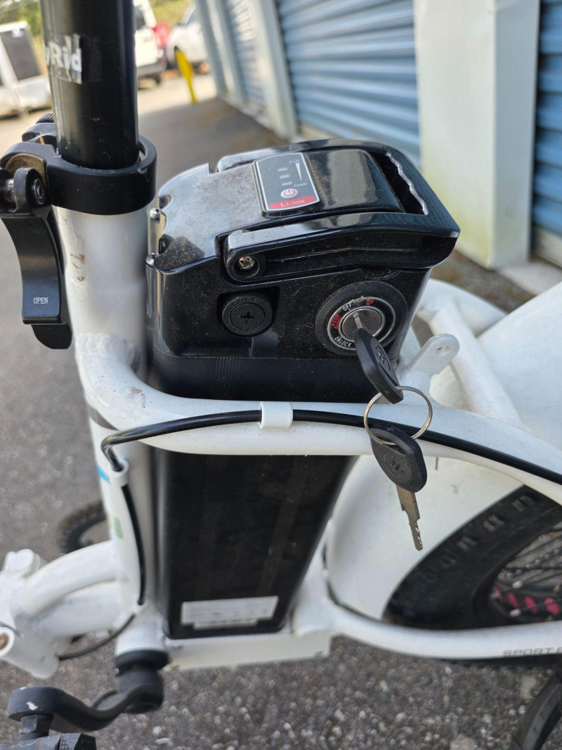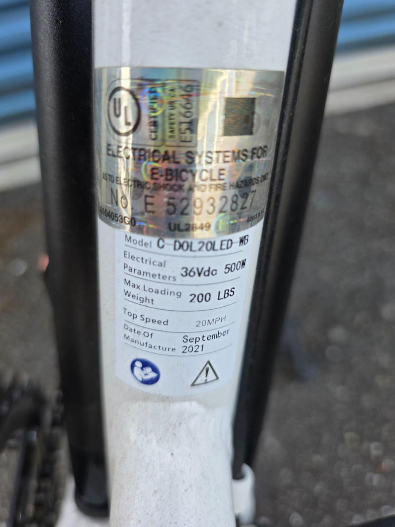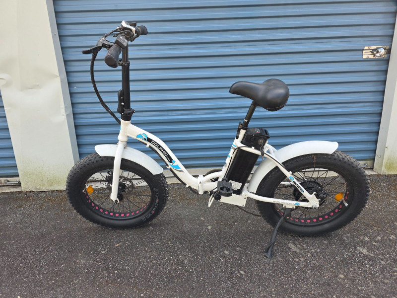 Ecotric Dolphin Folding Fat Tire Electric Bike #2 Manufactured Sept 2021 500W brushless geared rear hub motor Removable 36V 12.5Ah (or 12Ah) lithium battery Maximum speed of approximately 20–23 mph Range: Up to 35 miles in pedal-assist mode or 18–23 miles in pure electric mode Front and rear mechanical 160mm disc brakes Shimano 7-speed external gear drivetrain system Weighs approximately 52–56 lbs including the battery Supports a maximum rider weight of up to 200 lbs Folding Mechanism: The upper tube and handlebar stem are foldable, allowing the bike to fit into car trunks or tight storage spaces Offers three riding modes: pedal-only, pedal-assist, and an on-demand throttle Equipped with an Ecotric smart LED display to show speed and battery levels Includes battery (needs replacement), charger & 2 keys Untested - Battery Needs To Be Replaced Per Owner 46"T x 65"L x 18"W