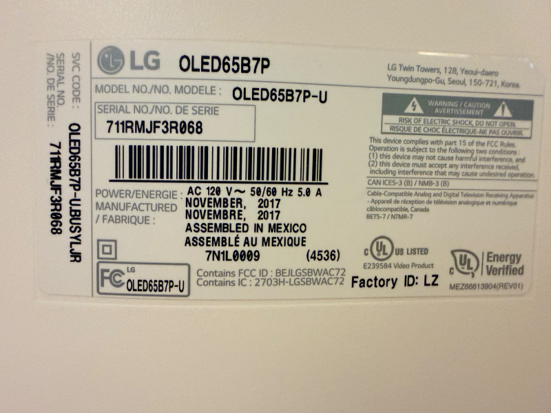 57.0" x 34.5" x 8.7"LG OLED65B7P 65" 4K HDR Smart OLED TV Model OLED65B7P Manufactured in 2017 Key Specifications: Display Type: OLED (Self-lighting pixels). Resolution: 4K Ultra HD (3840 x 2160). HDR Support: Active HDR with Dolby Vision™, HDR10, and HLG. Audio: 2.2 Channel speaker system (40W) with Dolby Atmos® decoding. Smart Platform: webOS 3.5. Connectivity: 4 HDMI ports (HDCP 2.2), 3 USB ports, Ethernet, and Wi-Fi (802.11ac) 57”x34.5”x8.75” Weighs 50lbs Includes power cord & remote Tested - Works!