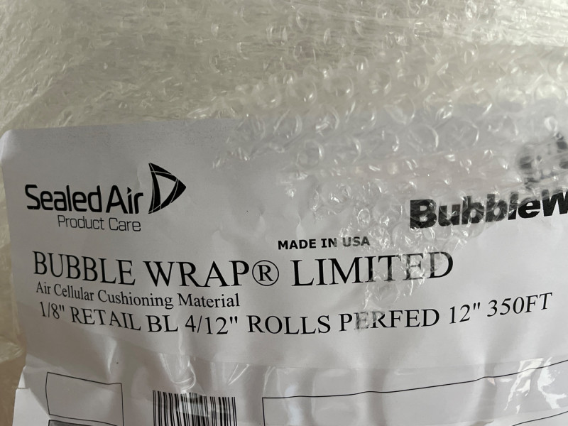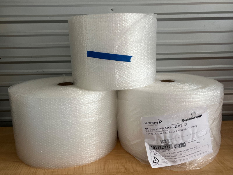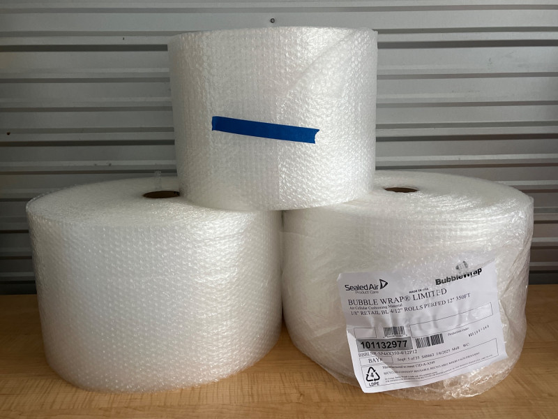 (3) Rolls of 1/8” Sealed Air Bubble Wrap 2 full rolls of 350'x12' 1/8" bubble wrap, 1 slightly less than full.