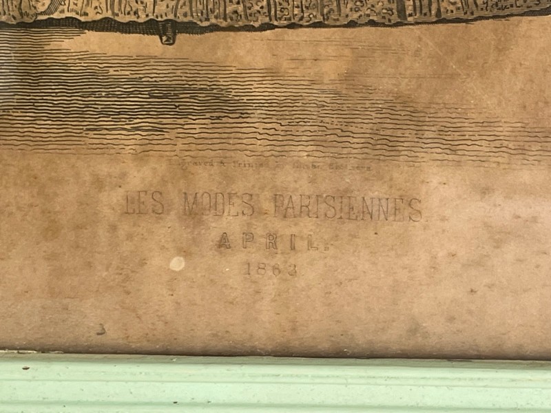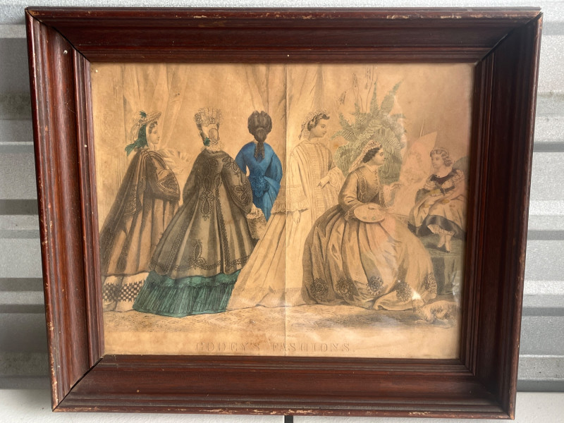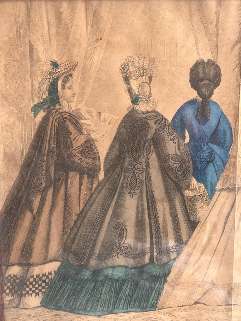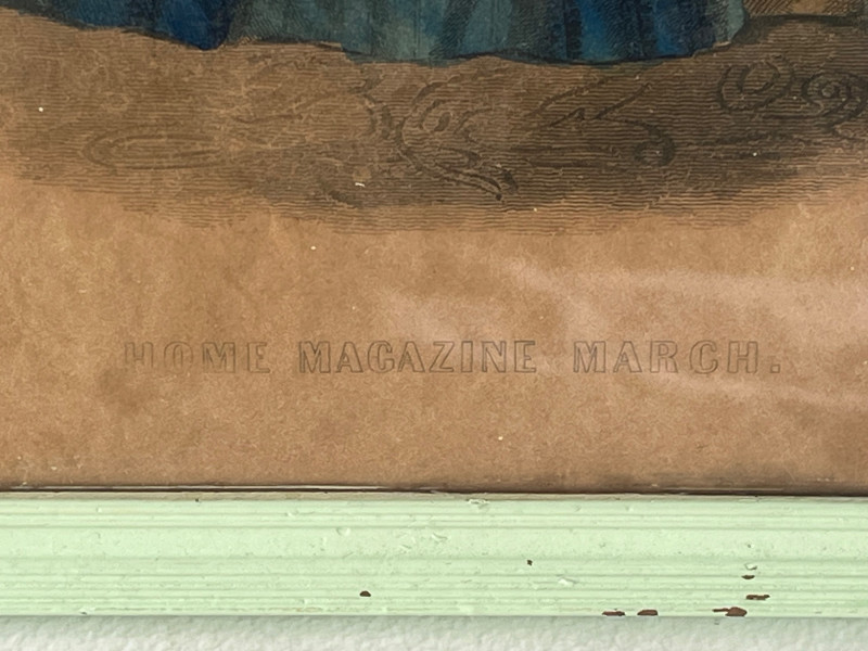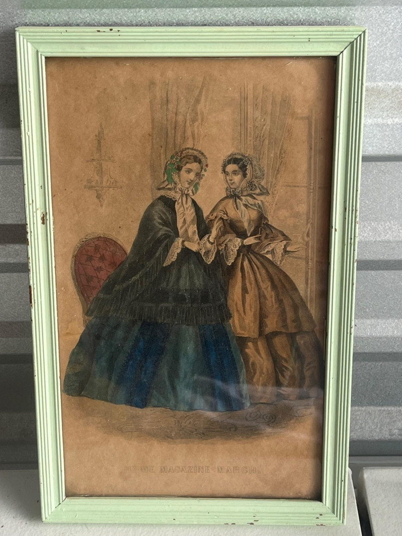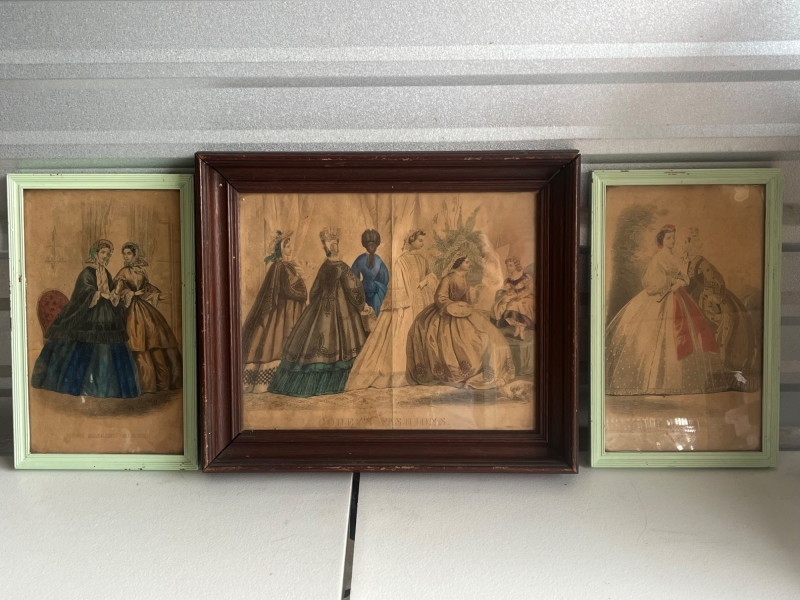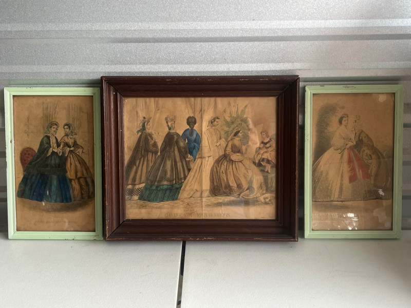 (3) Antique Magazine Clippings Godey’s Fashions clipping. 11.25”Tx13.25”Wx1.5”D Hand colored. Frame has some separation. Les Modes Parisiennes clipping. April 1863 edition. Hand colored. 10.5”Tx6.5”W Home Magazine Clipping. March edition. Hand colored. 10.5”Tx6.5”W