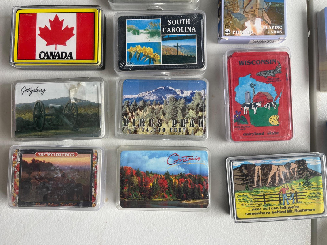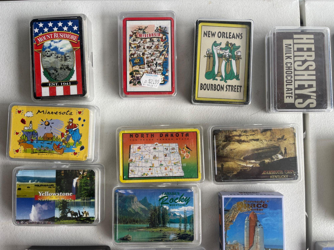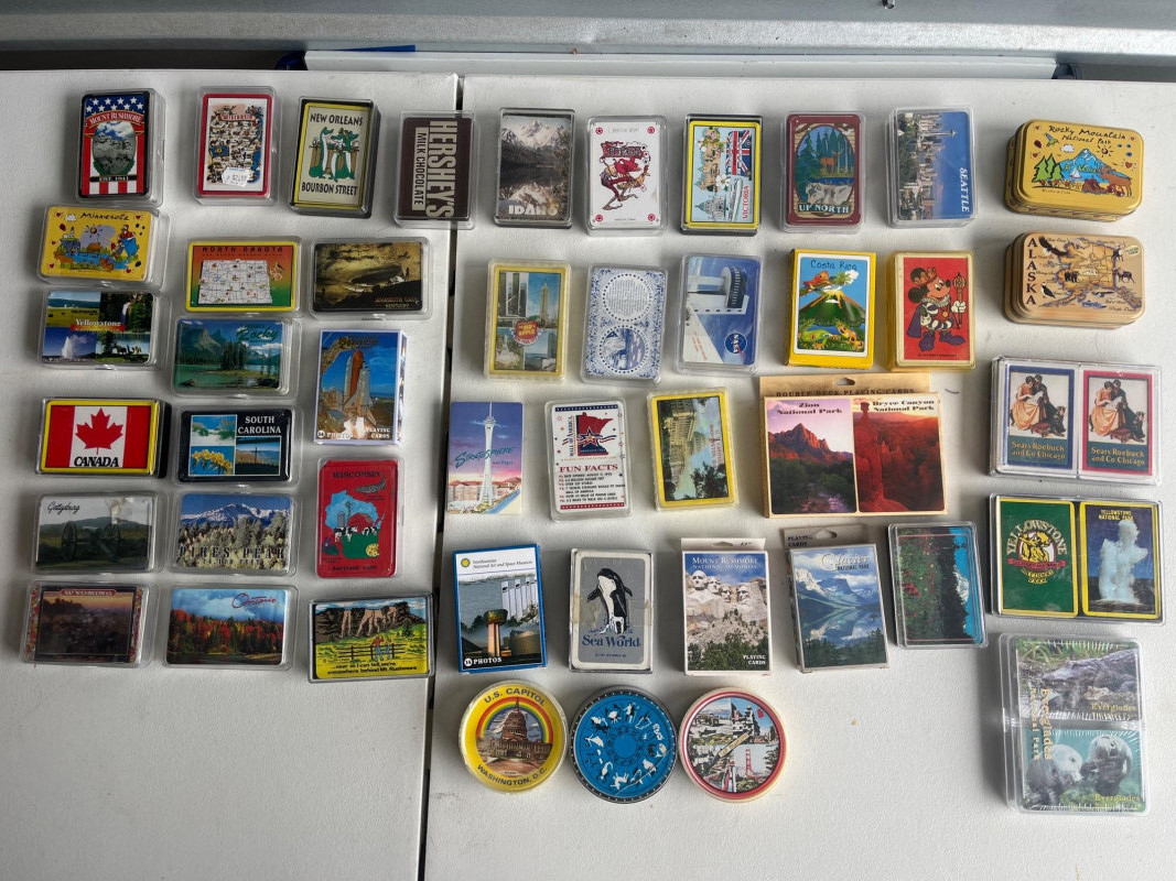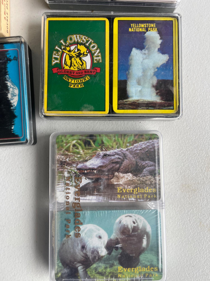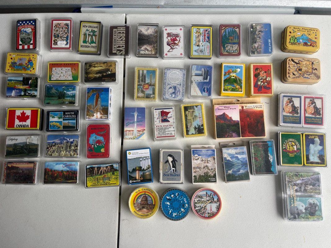 (45) Various Decks of Playing Cards Forty-five sets of playing cards. National park cards, city/state cards, and more! Three sets of circular playing cards. Some NIP. Cards have not been counted.