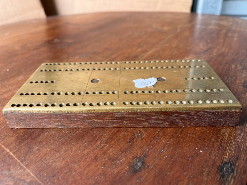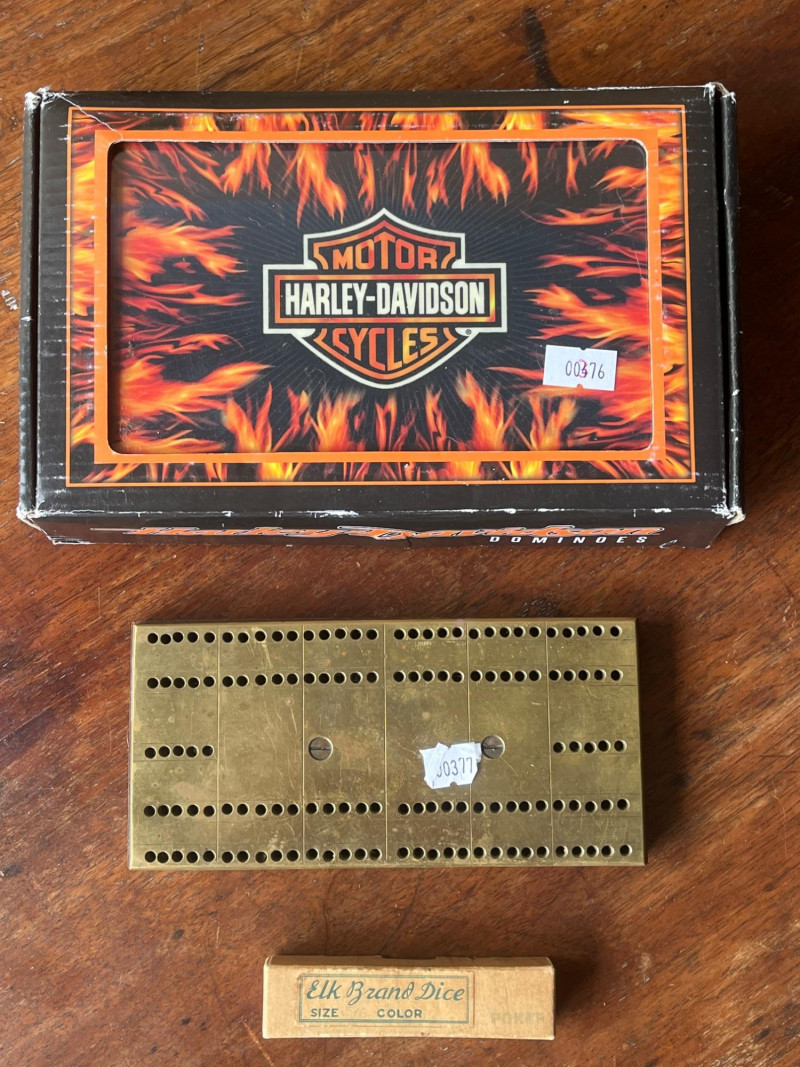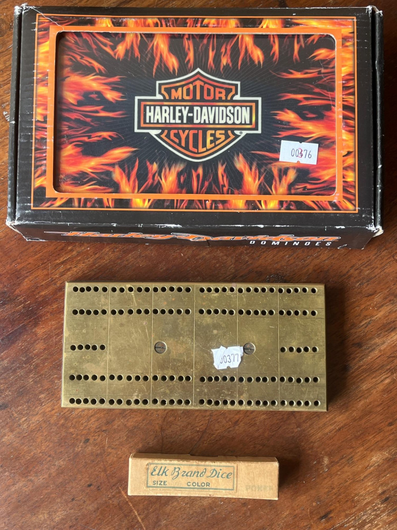 Lot # 117 - Harley Davidson Dominoes - Vintage Brass Cribbage Board - Elk Dice