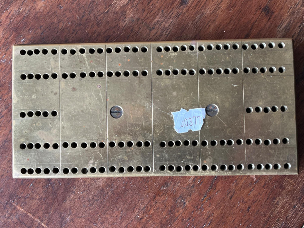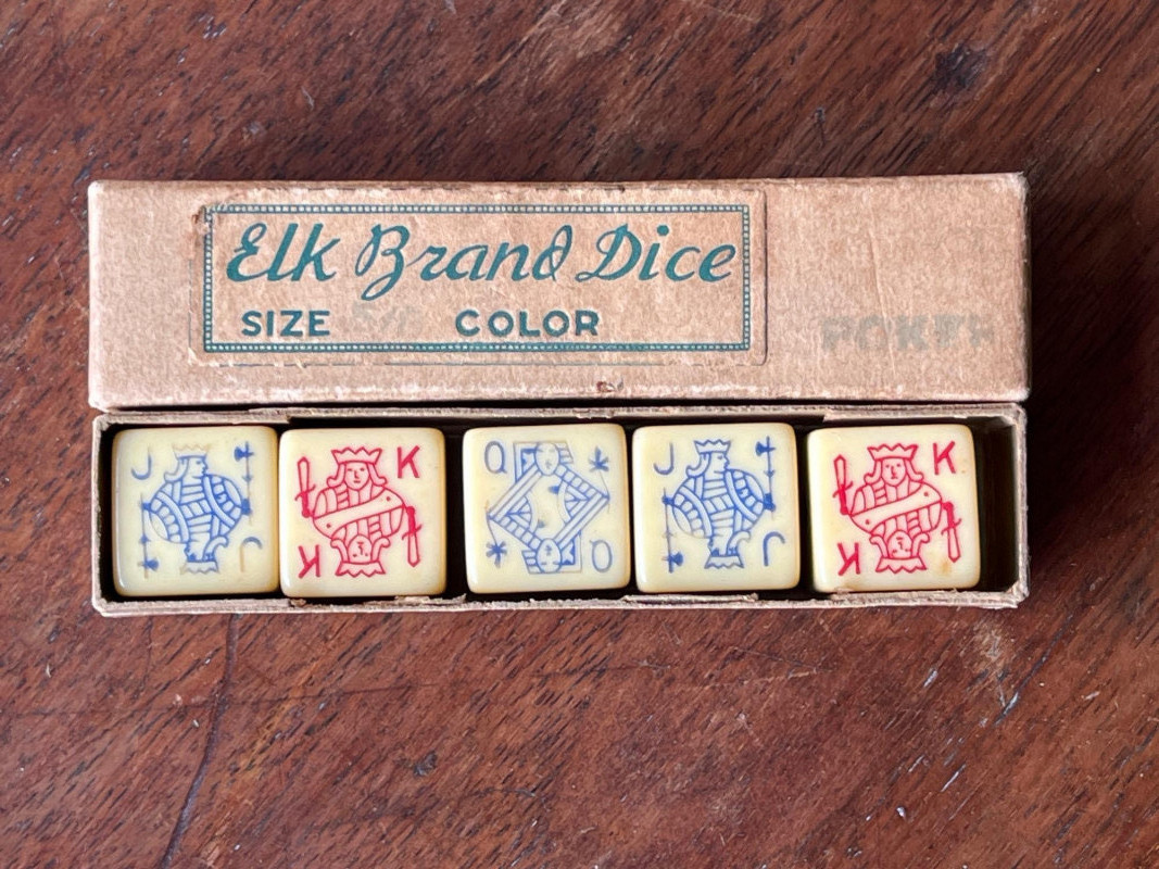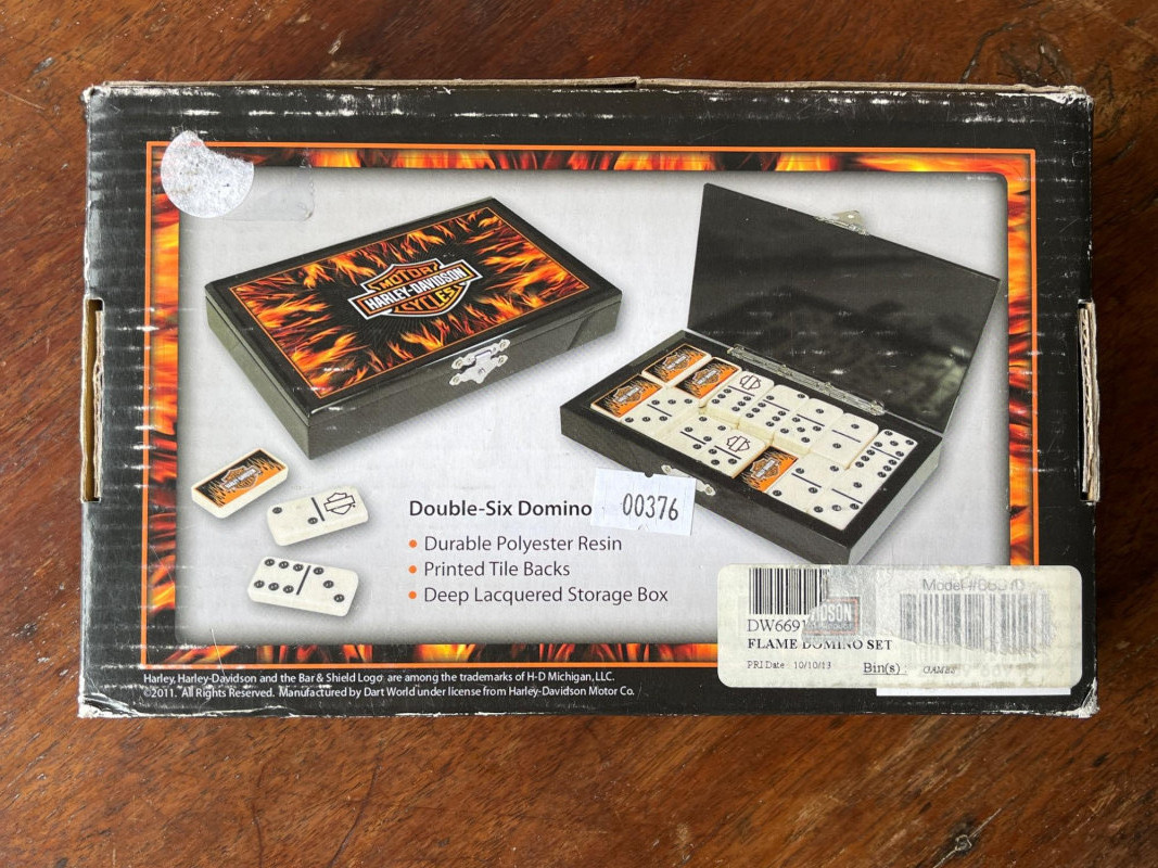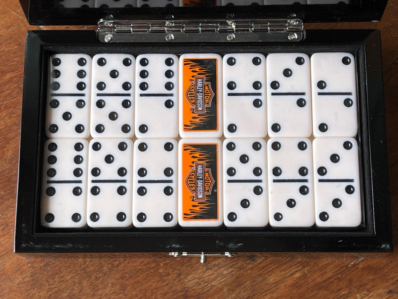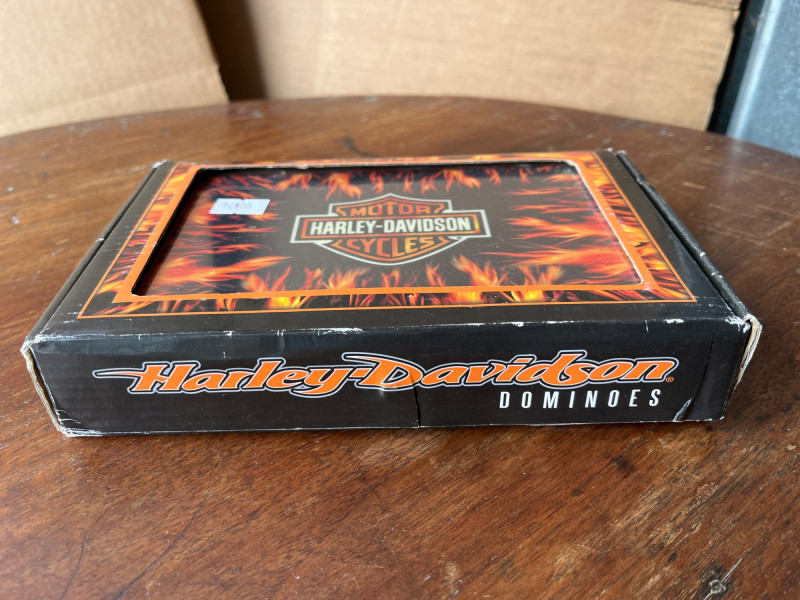 Harley Davidson Dominoes - Vintage Brass Cribbage Board - Elk Dice Harley Davidson Bar and Shield Flame Dominoes Set, in original packaging. Vintage Brass Cribbage Board Solid brass top with wooden underside. Vintage Elk Brand Dice. Five poker dice in original box.