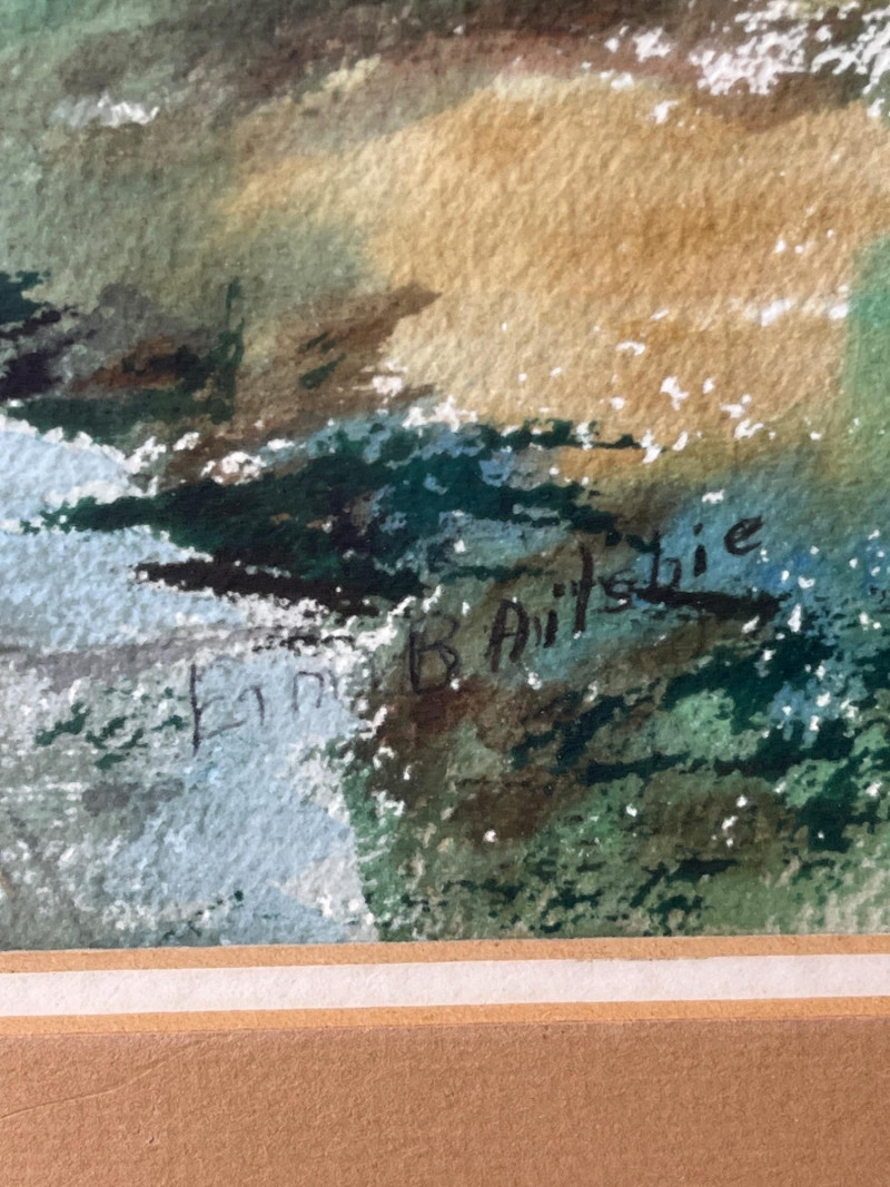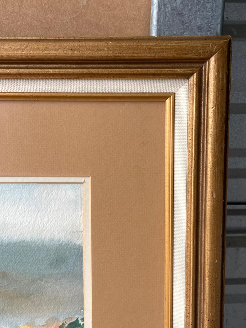 Watercolor “Rustic Farm in Autumn” by E. Bailsbie Rural scene with a barn, a farmhouse, and a windmill against a backdrop of autumn-colored foliage. Watercolor on paper. Painting under glass with white and tan matting in white and gold frame. Hand signed. 19”Tx23”Wx1.25”D