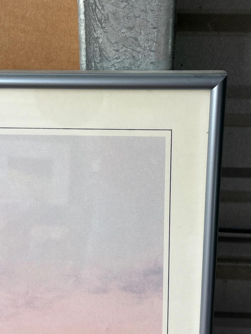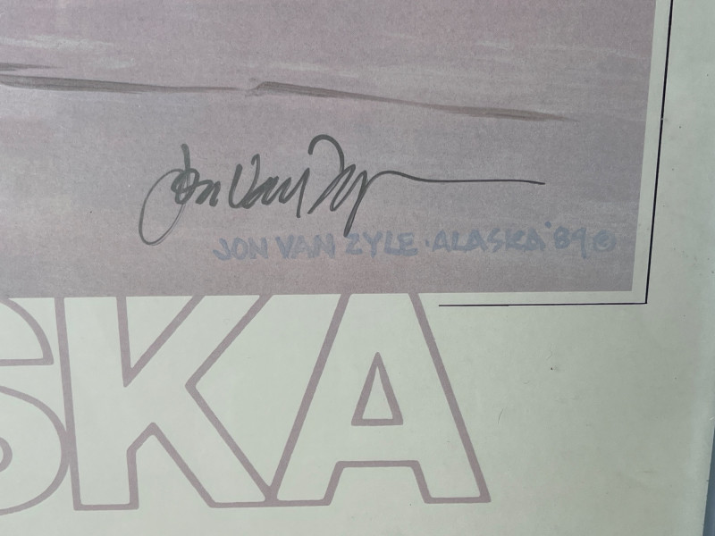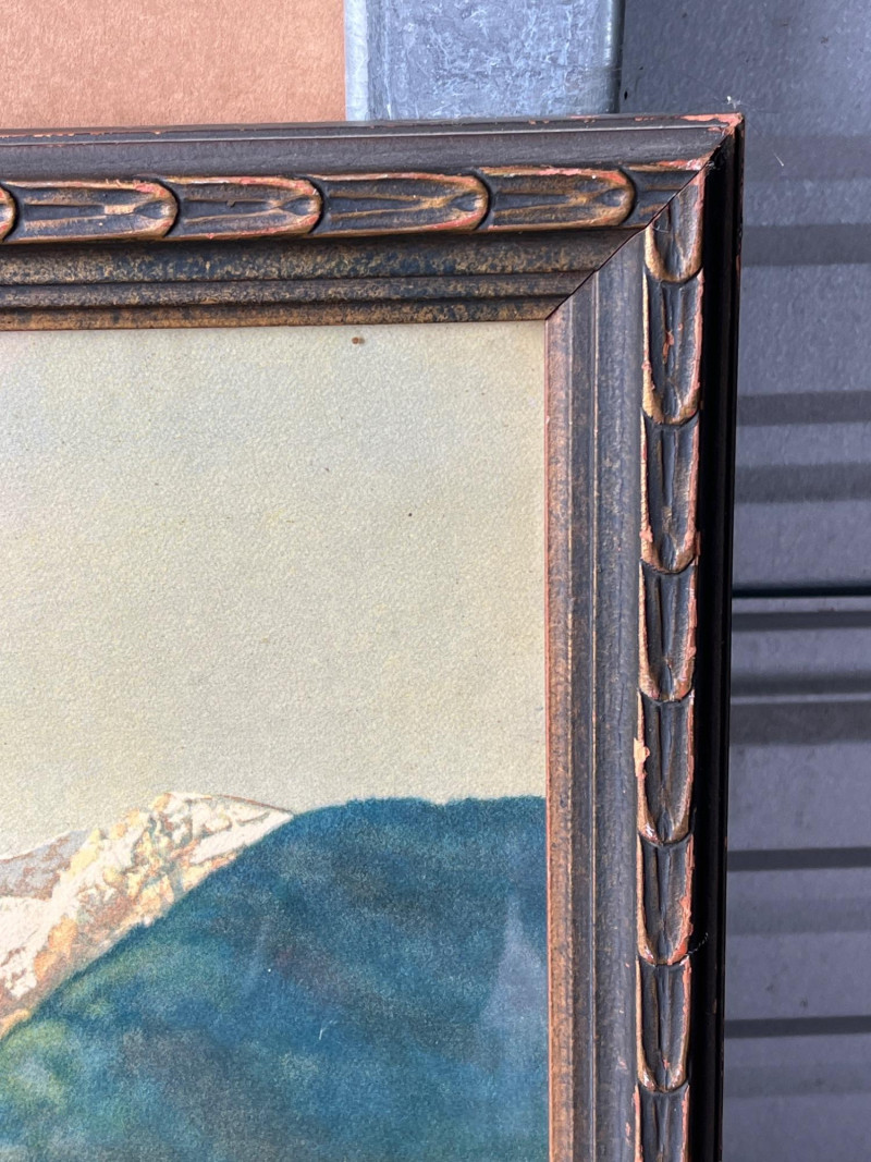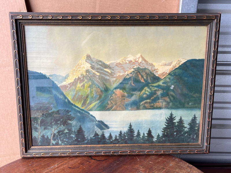 “Pair of Loons with their Loonlet” & Original Watercolor Landscape “Pair of Loons with their Loonlet" by Jon Van Zyle. Loons with their baby swimming in calm waters with a cabin in the background. Under glass in metal frame. Hand signed by artist. 18.25”Tx24.25”W Original mountain landscape with a river view. Watercolor on paper. Under glass in wood frame. 18.5”Tx25.5”W