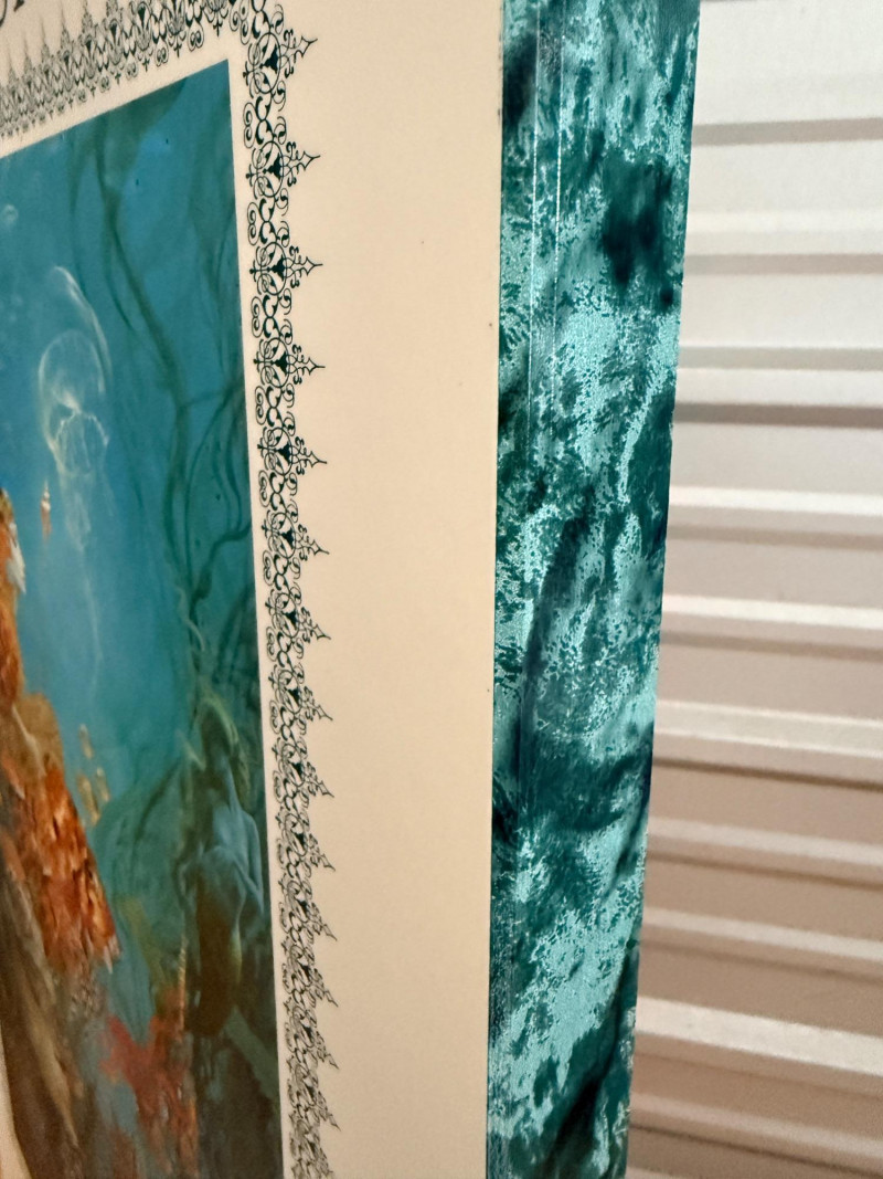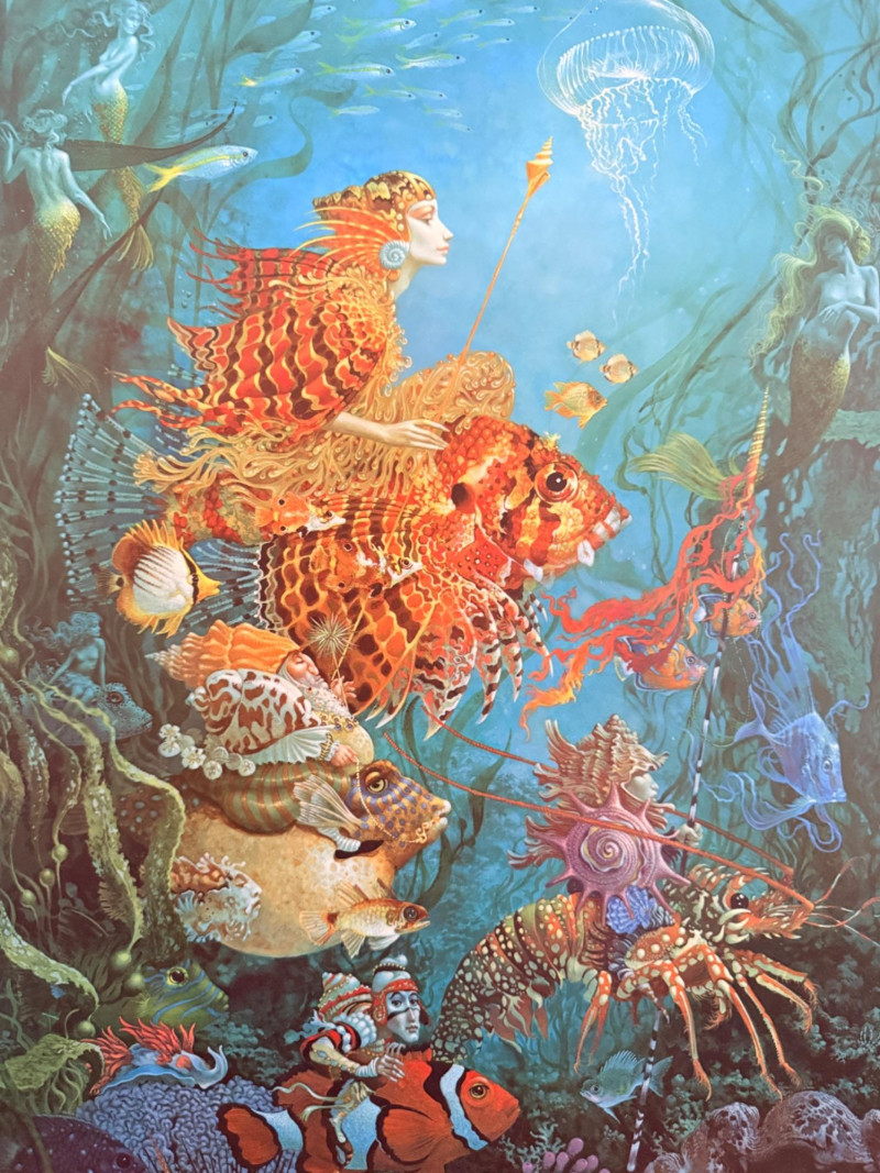 A whimsical underwater scene featuring a regal figure riding a large fish, accompanied by mermaids, jellyfish, and other marine life measures 19.75“ x 32.75“ x 1.5“