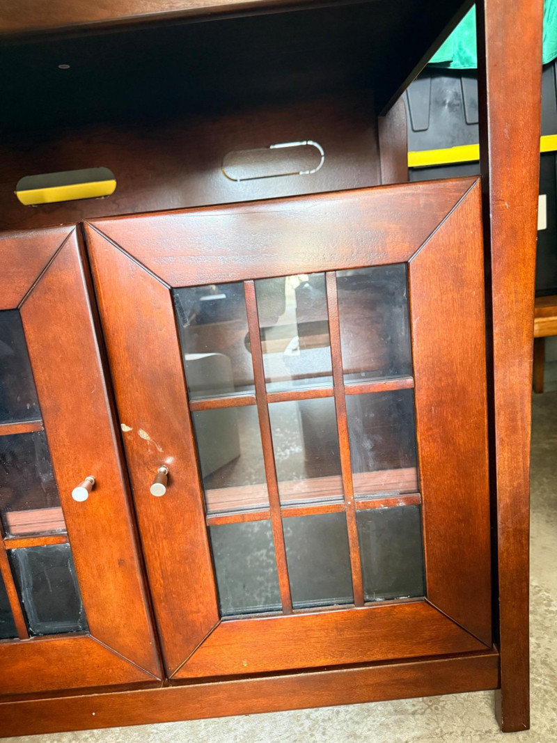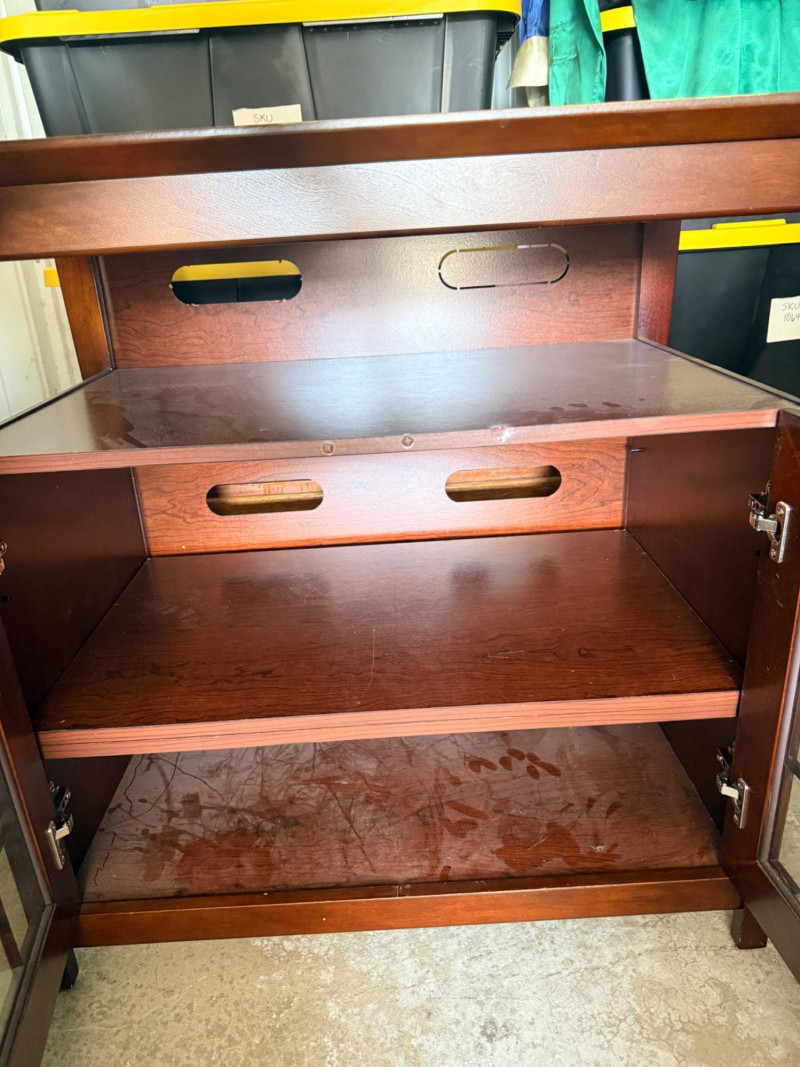 Small 2 Door Media Center 1 exterior and 2 interior shelves and back cut-outs for cord management See pics for condition. Measures 32.25“ x 20“ x 32“ tall