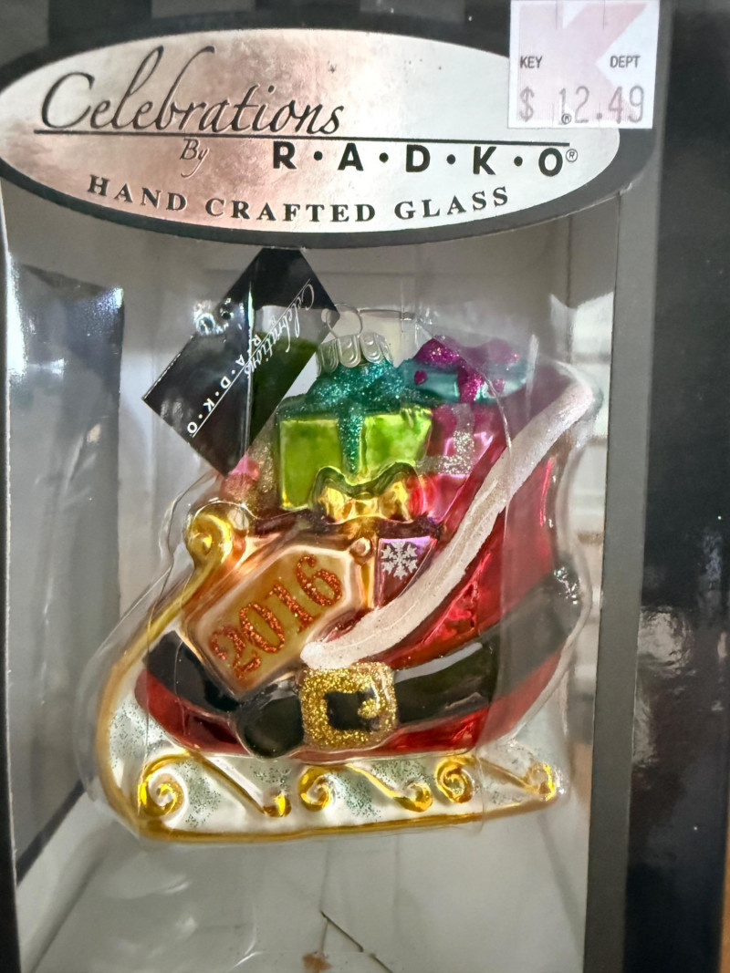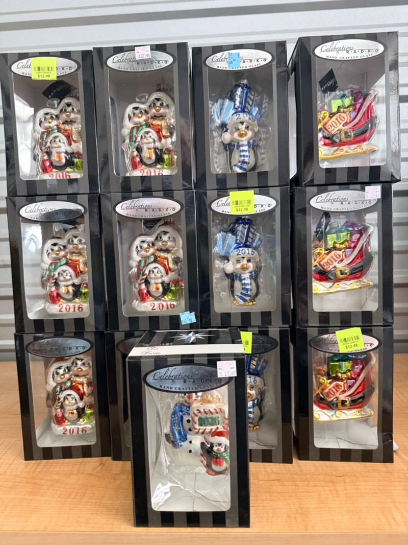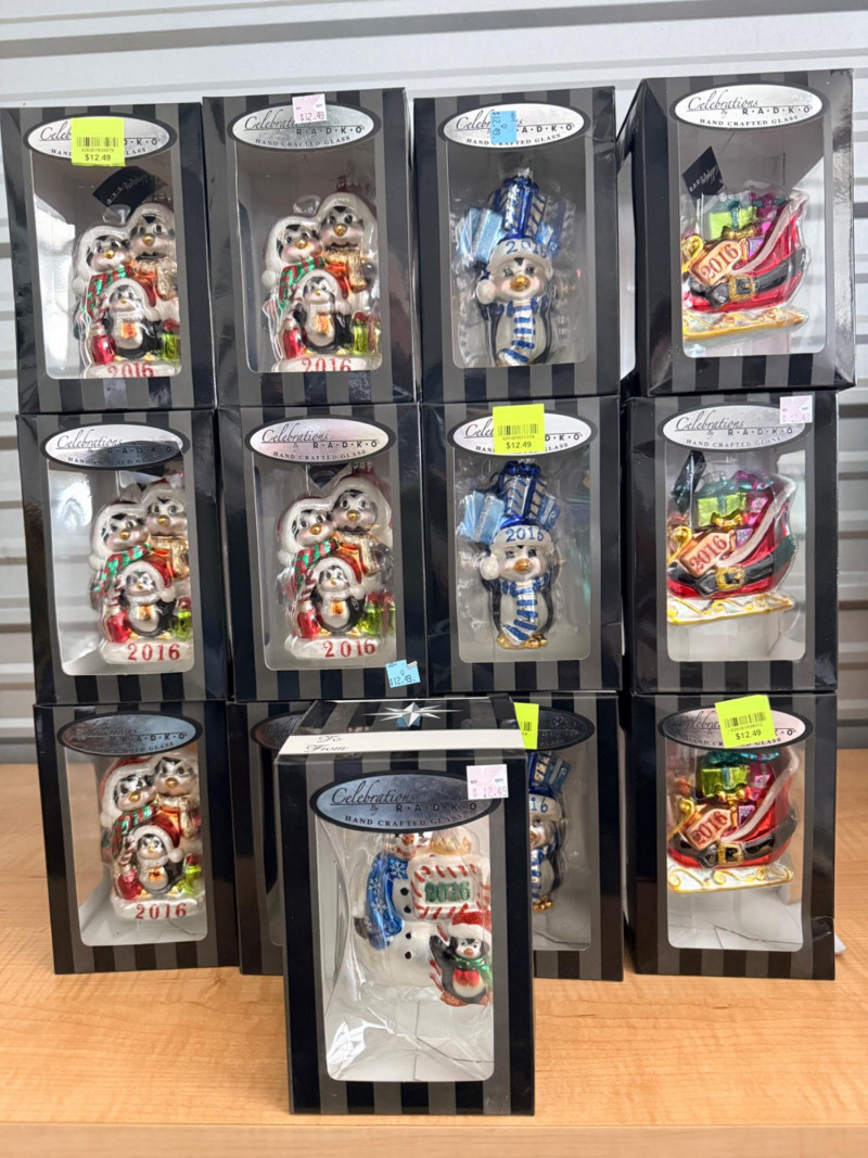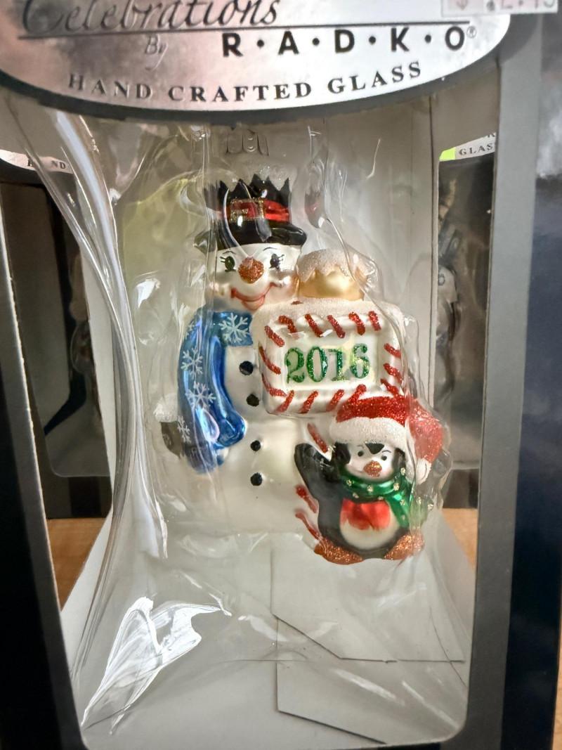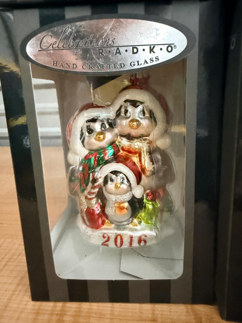 (30) Christopher Radko 2016 Ornaments 5 Penguin with gifts (blue) 5 Santa’s Sleigh 1 Snowman & Penguin