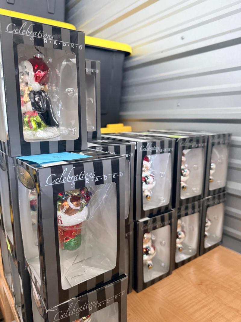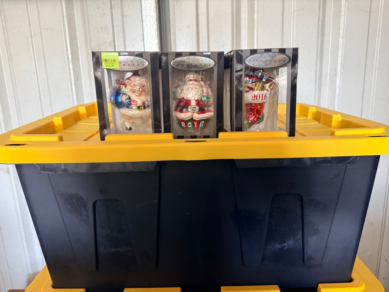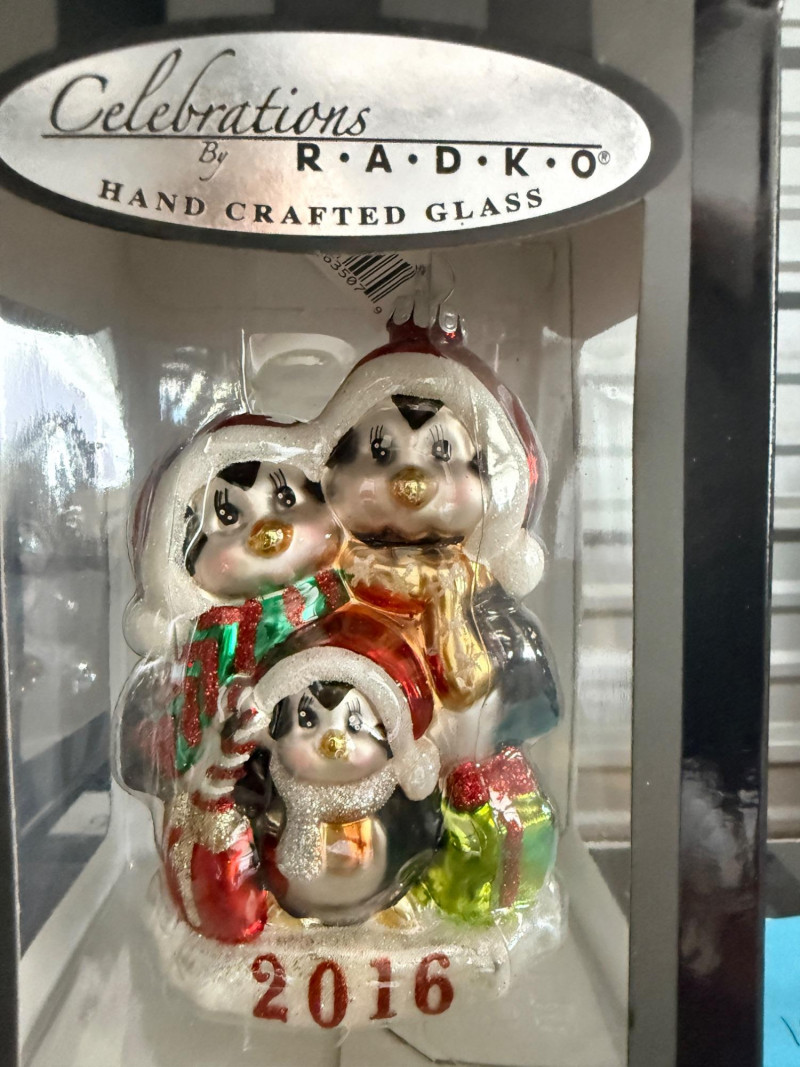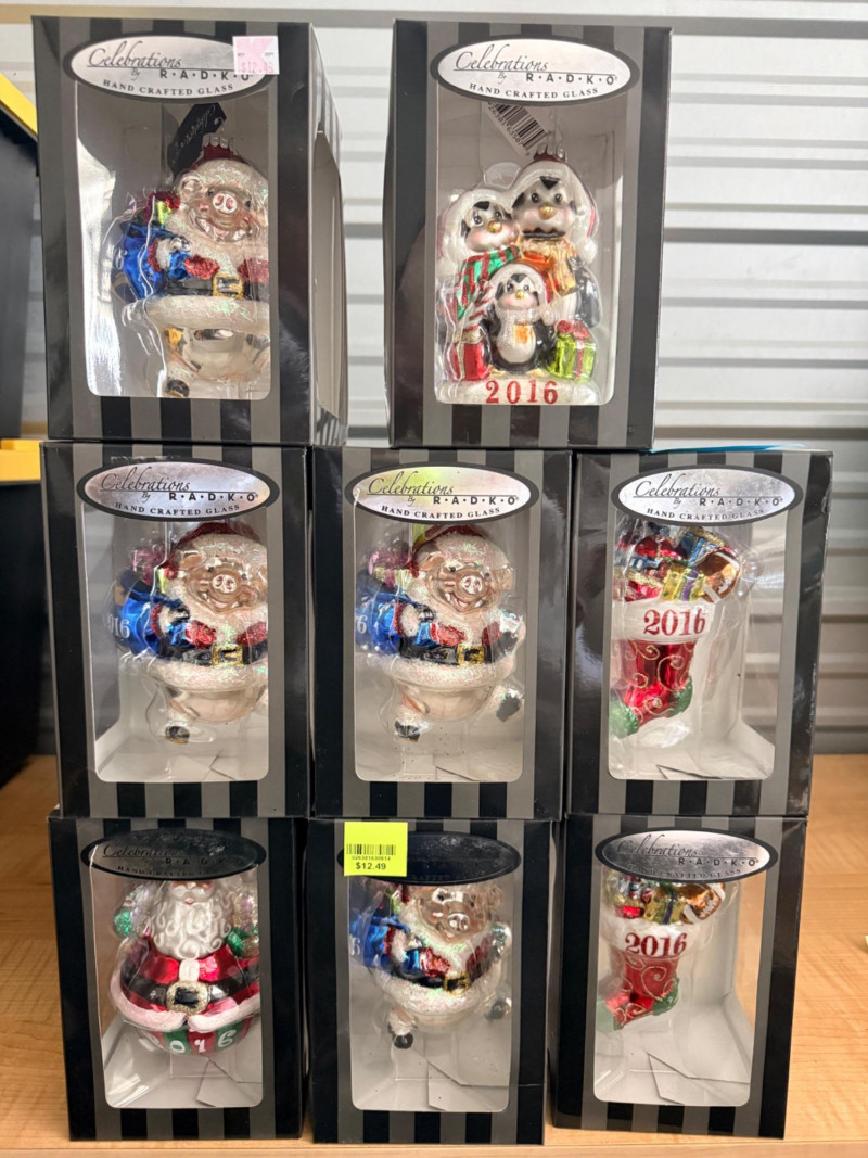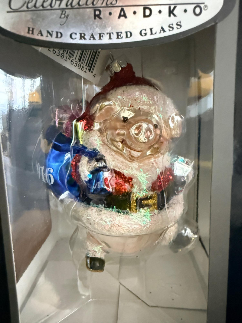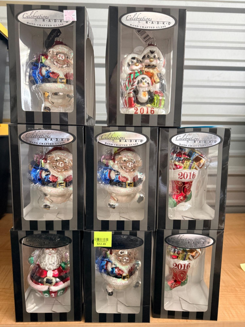 (25) Christopher Radko Hand Crafted Glass Ornaments 1 Penguin Family 2 Stockings 9 Striped Ball Santa 13 Happy Pig Includes a large black and yellow storage tote.