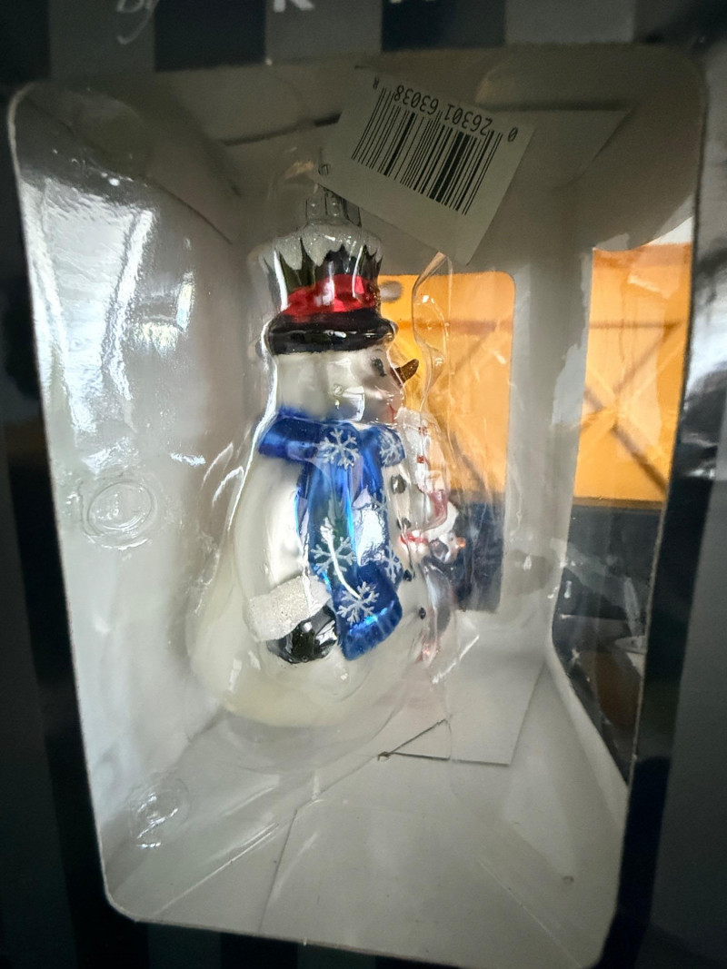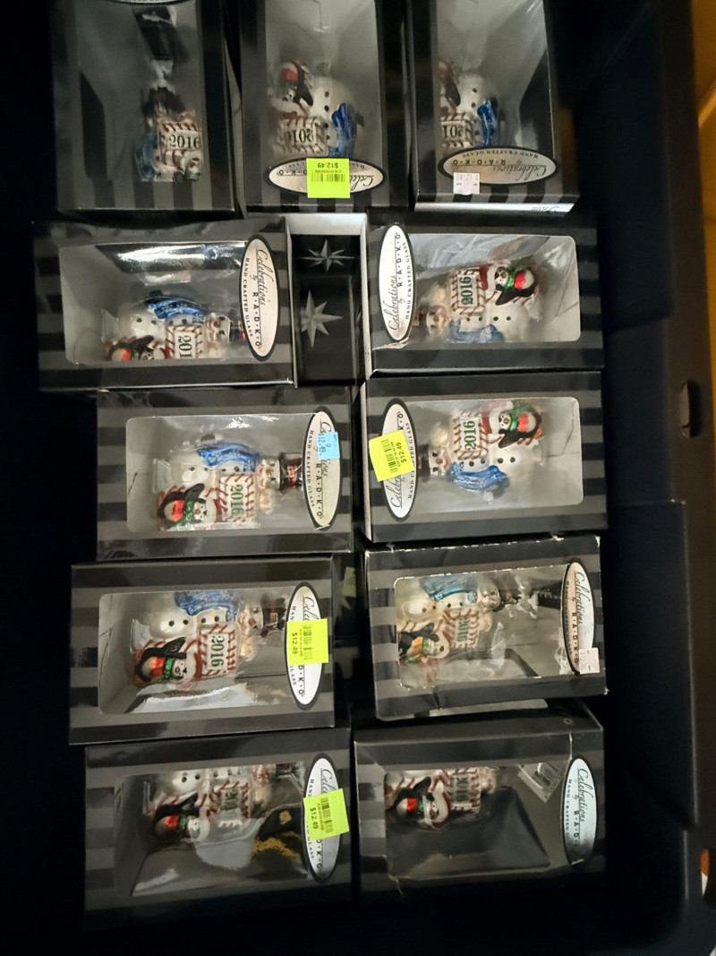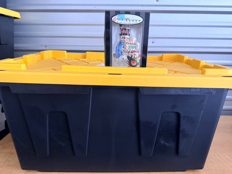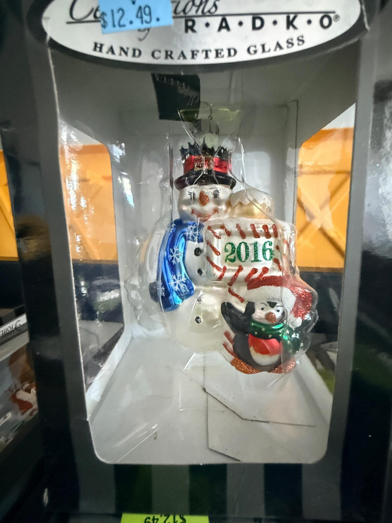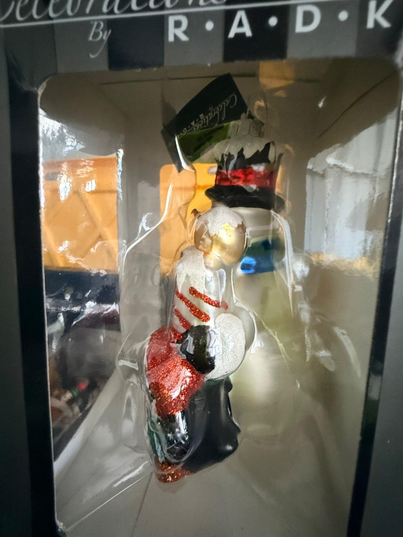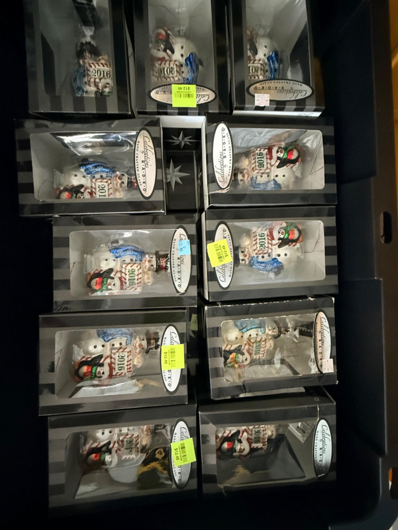 (26) Christopher Radko Hand Crafted Glass Ornaments 2016 26 Snowman with Penguin 2016 ornaments in a large black and yellow storage tote.