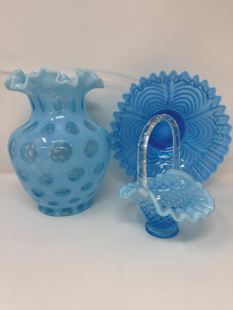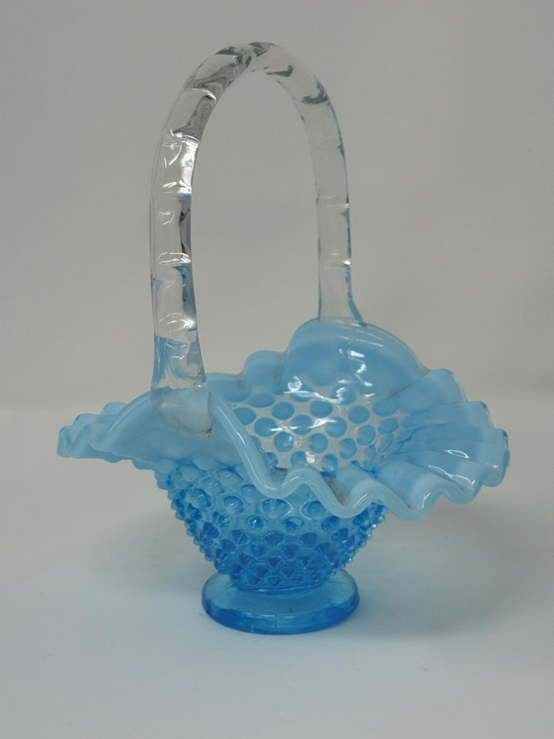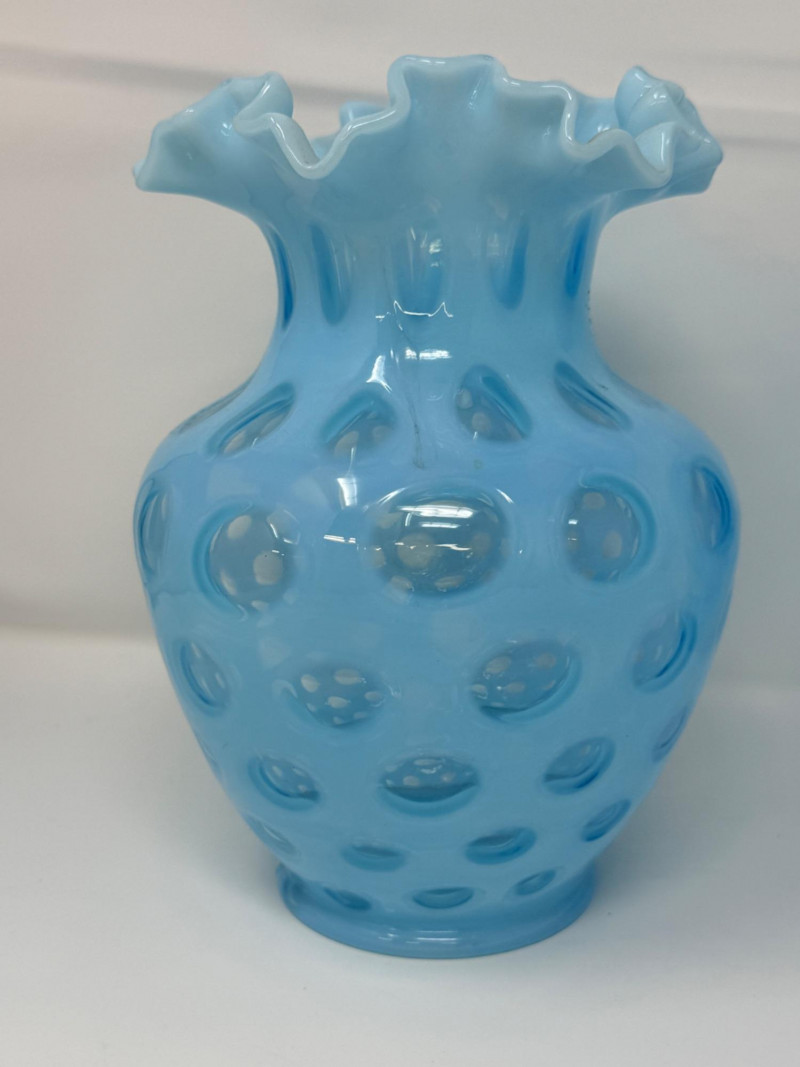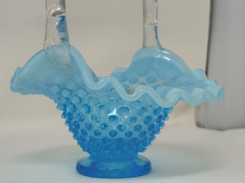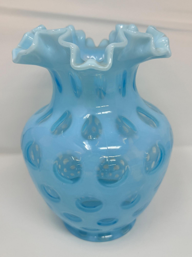 Vintage Fenton Art Glass vase in the blue opalescent coin dot pattern. It features a distinct ruffled or crimped rim. This pattern was produced by the Fenton Glass Company, which operated in the United States from 1904 through 2012 Fenton "Reverse Drapery" Blue Opalescent Ruffled Bowl. Features the "Reverse Drapery" pattern with a dramatic ruffled edge and a starburst design in the center.The glass is a vibrant blue opalescent color, which gives it a shimmering, iridescent quality. It measures approximately 9 inches in diameter Fenton Blue Opalescent Hobnail glass basket, likely produced between the 1940s and 1950s. Hobnail, featuring raised rounded knobs on the exterior. Blue opalescent, which creates a translucent blue color with a milky white effect along the ruffled rim. It has a crimped, scalloped edge and a clear glass handle. It stands approximately 5.75 to 6.75" tall.