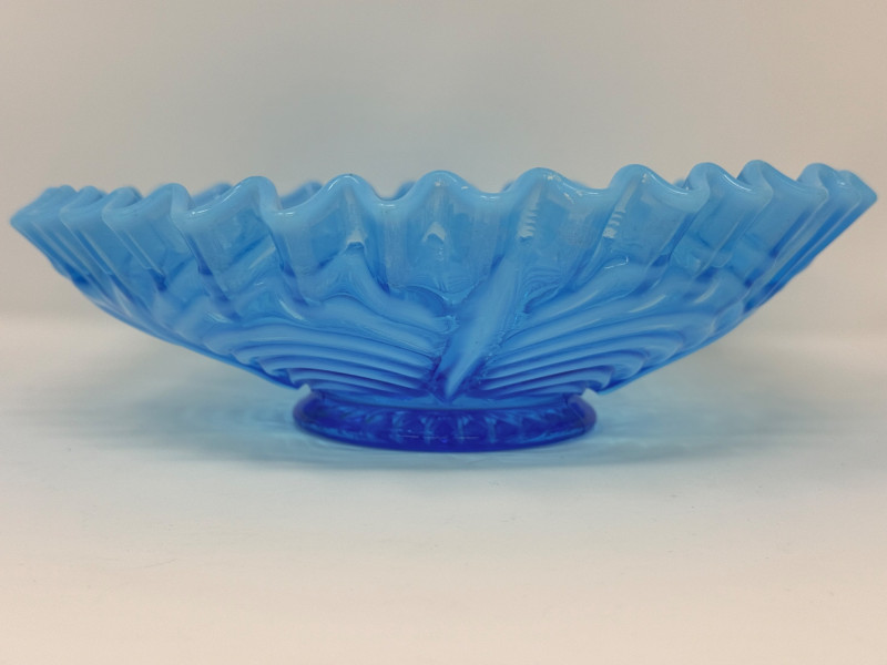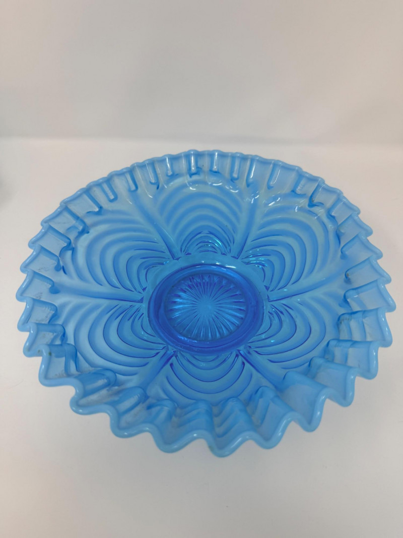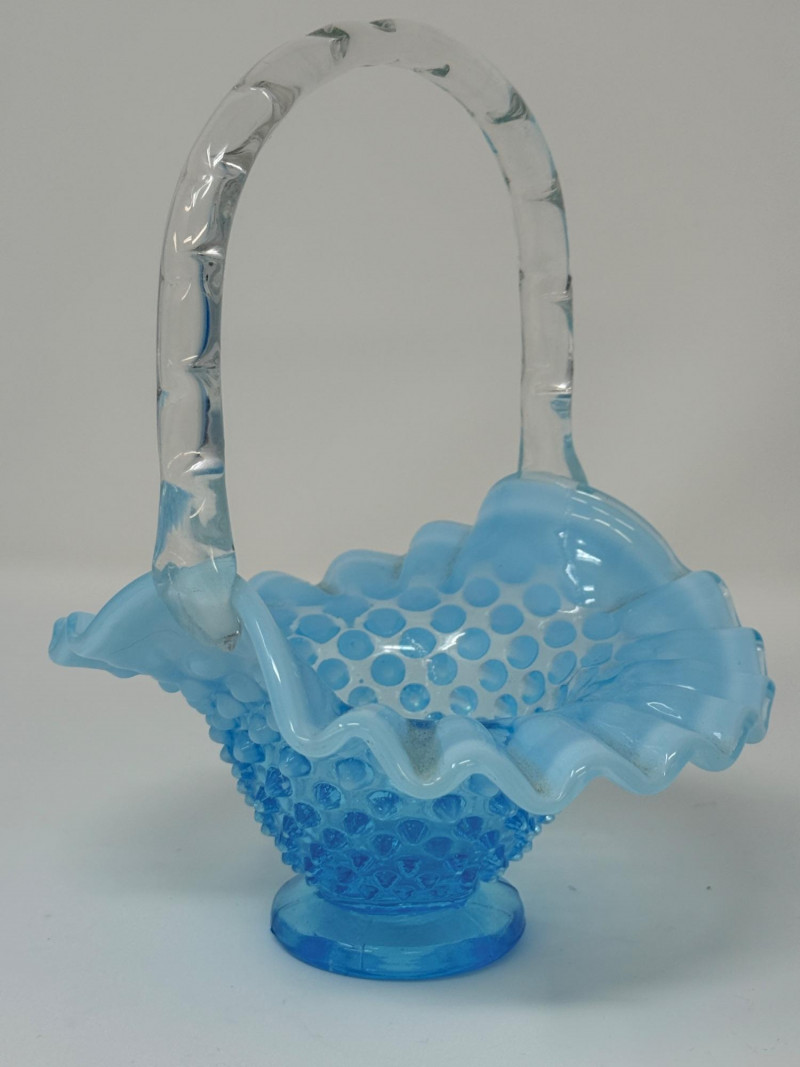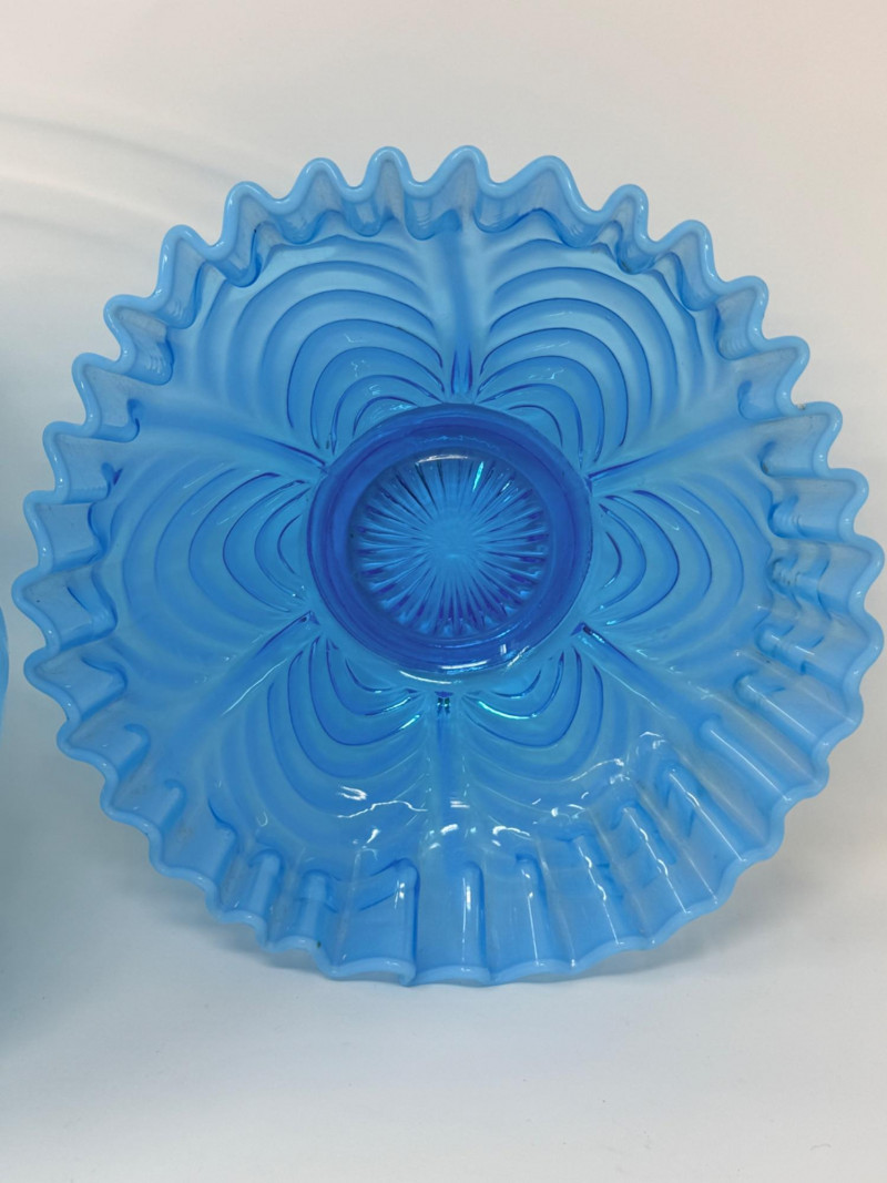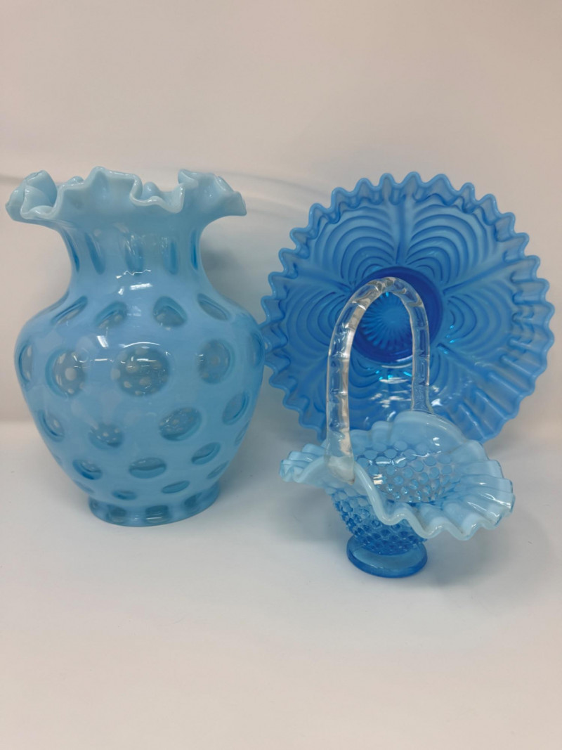 Vintage Fenton Art Glass vase in the blue opalescent coin dot pattern. It features a distinct ruffled or crimped rim. This pattern was produced by the Fenton Glass Company, which operated in the United States from 1904 through 2012 Fenton "Reverse Drapery" Blue Opalescent Ruffled Bowl. Features the "Reverse Drapery" pattern with a dramatic ruffled edge and a starburst design in the center.The glass is a vibrant blue opalescent color, which gives it a shimmering, iridescent quality. It measures approximately 9 inches in diameter Fenton Blue Opalescent Hobnail glass basket, likely produced between the 1940s and 1950s. Hobnail, featuring raised rounded knobs on the exterior. Blue opalescent, which creates a translucent blue color with a milky white effect along the ruffled rim. It has a crimped, scalloped edge and a clear glass handle. It stands approximately 5.75 to 6.75" tall.